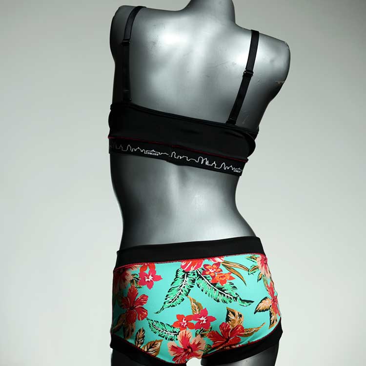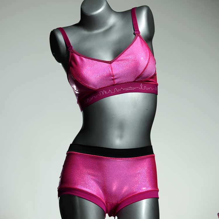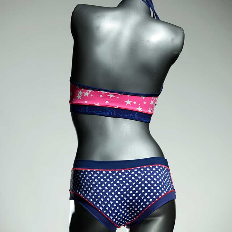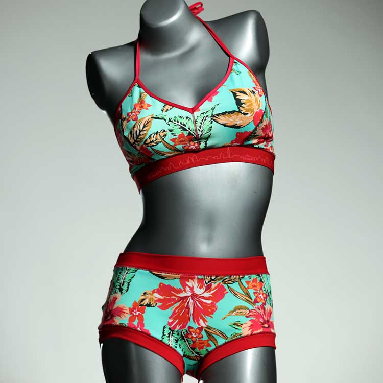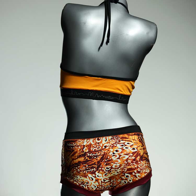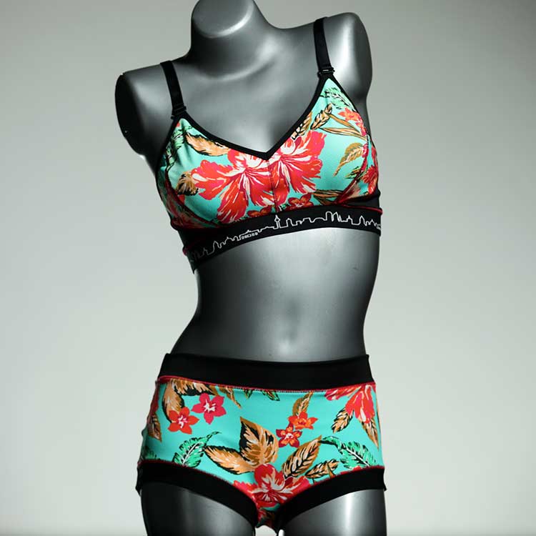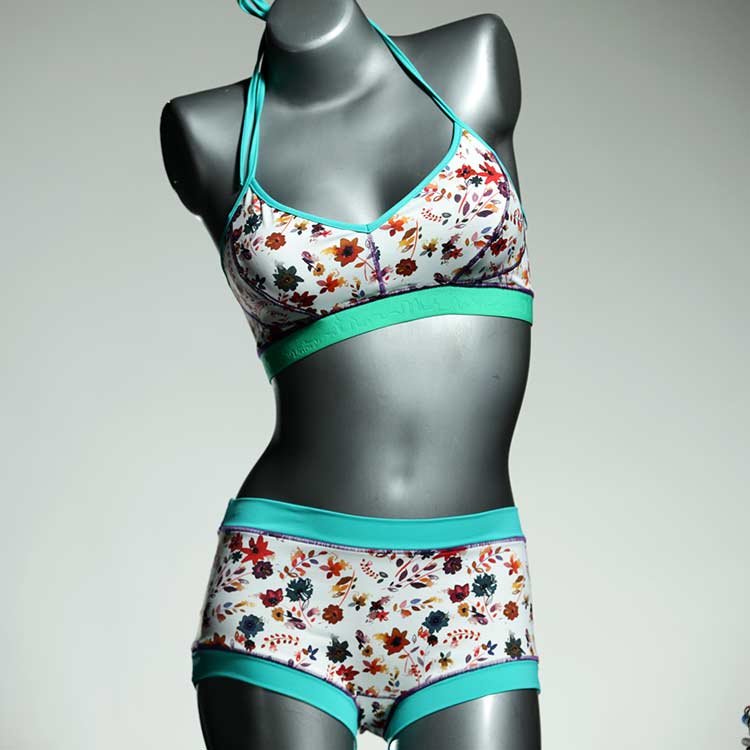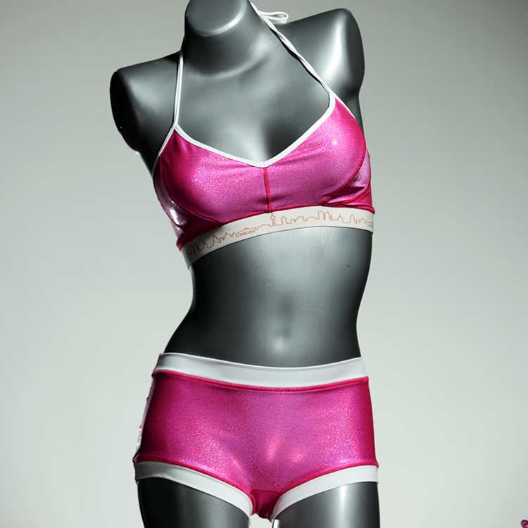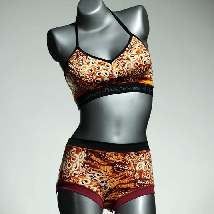 Ligesom de varme bukser og bh'er er disse sportsbikini-sæt ikke skåret for stramt, passer lige så godt og glider ikke. Materialet er af høj kvalitet og lysfast Lycra fra en lille vævemølle nær Barcelona. Stropperne er 16 mm brede og justerbare. Top uden bøjle, pude eller fastgørelse. Lavet af høj kvalitet Lycra og uden elastik. Med svømmefor foran.
