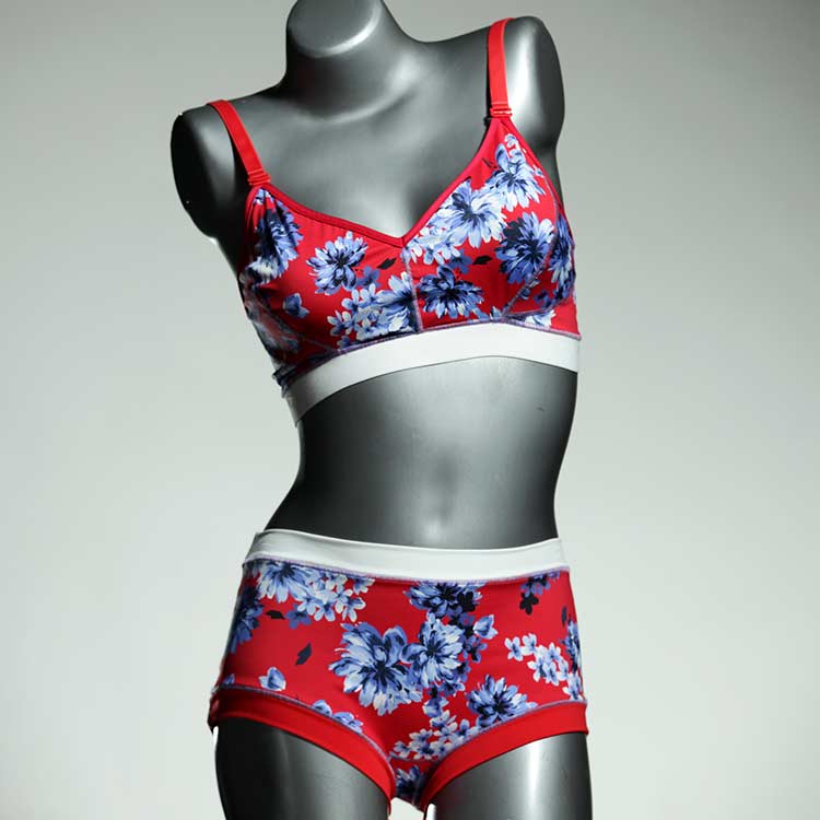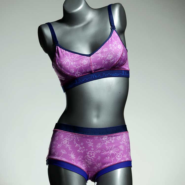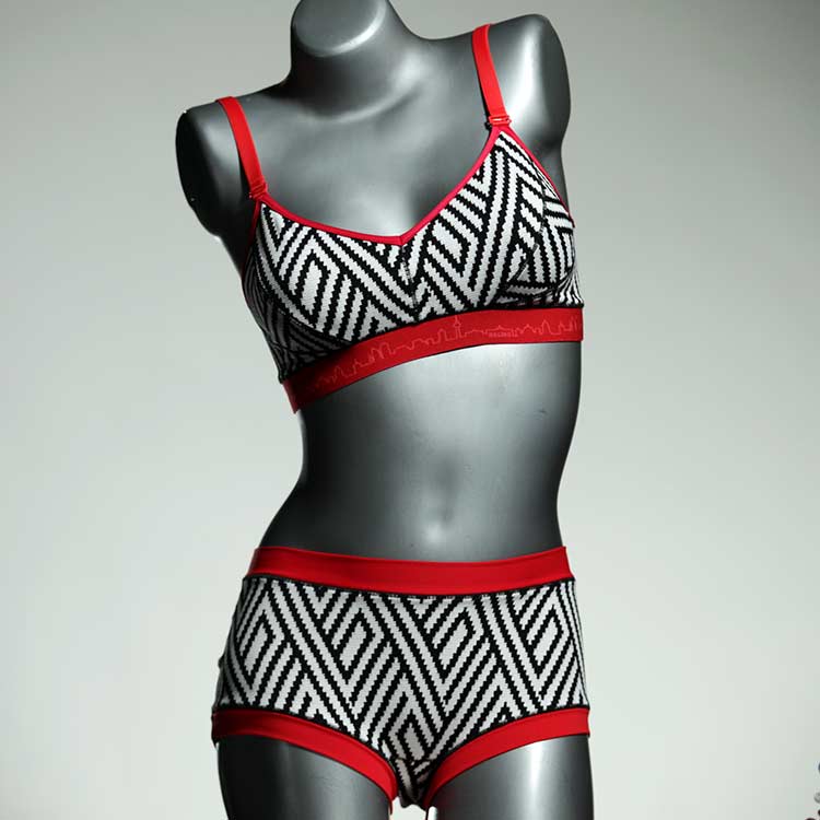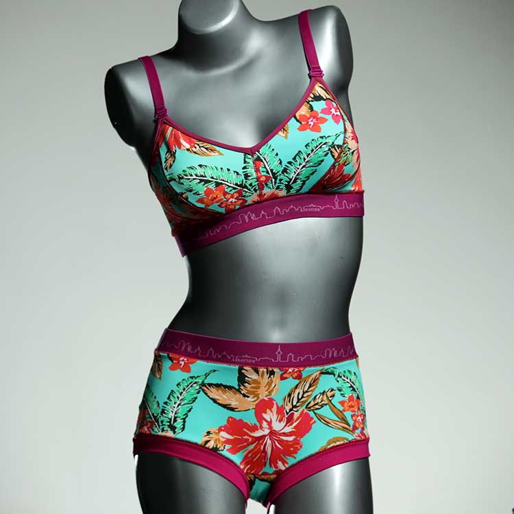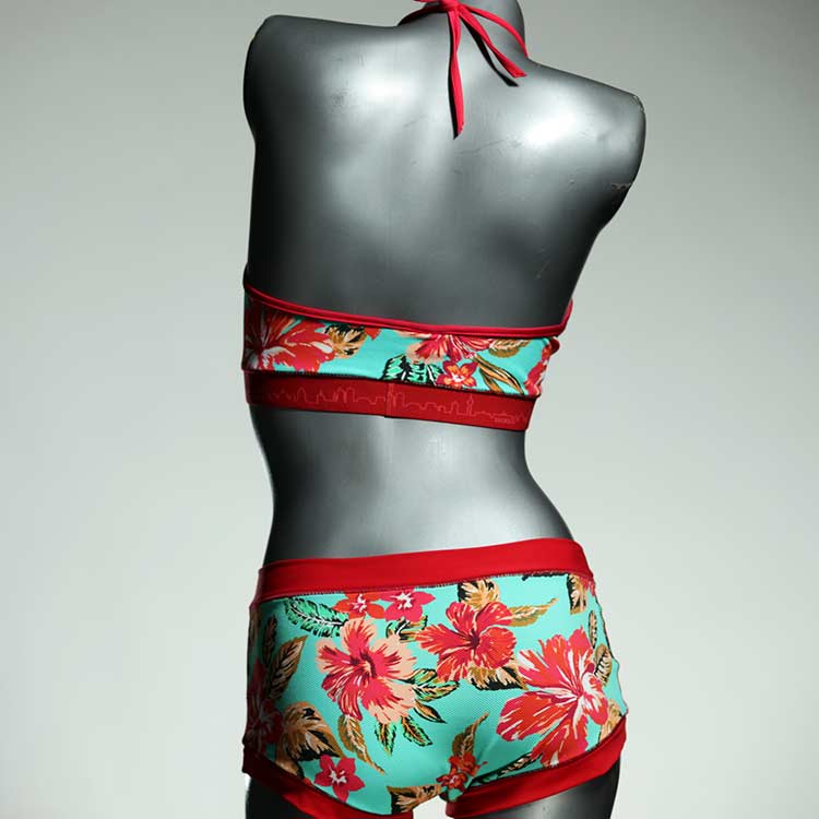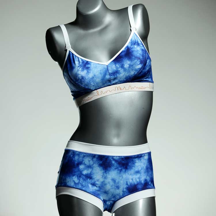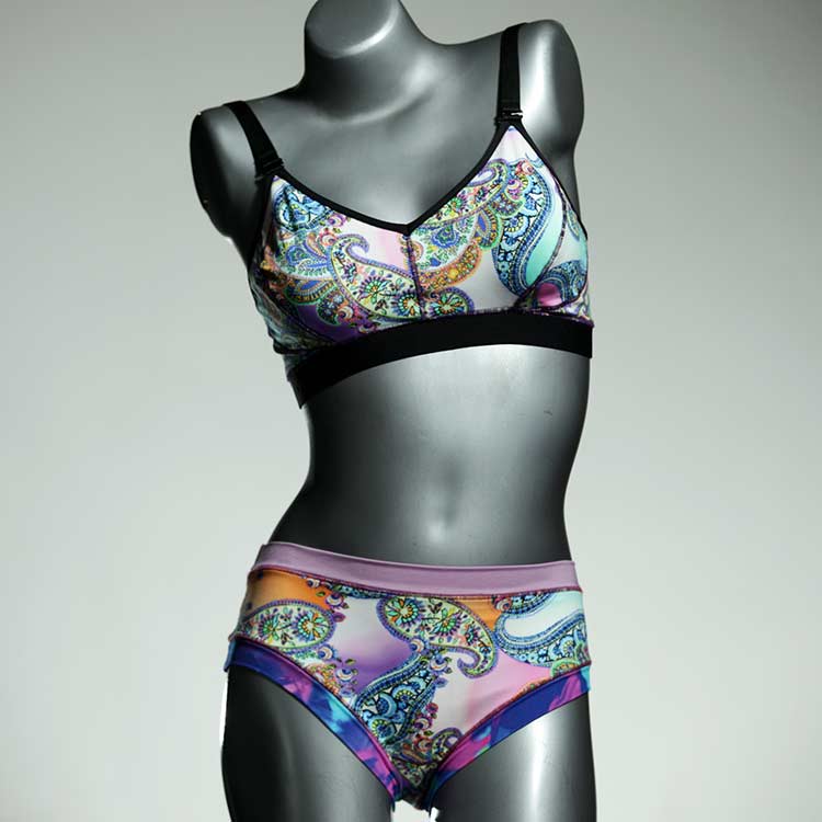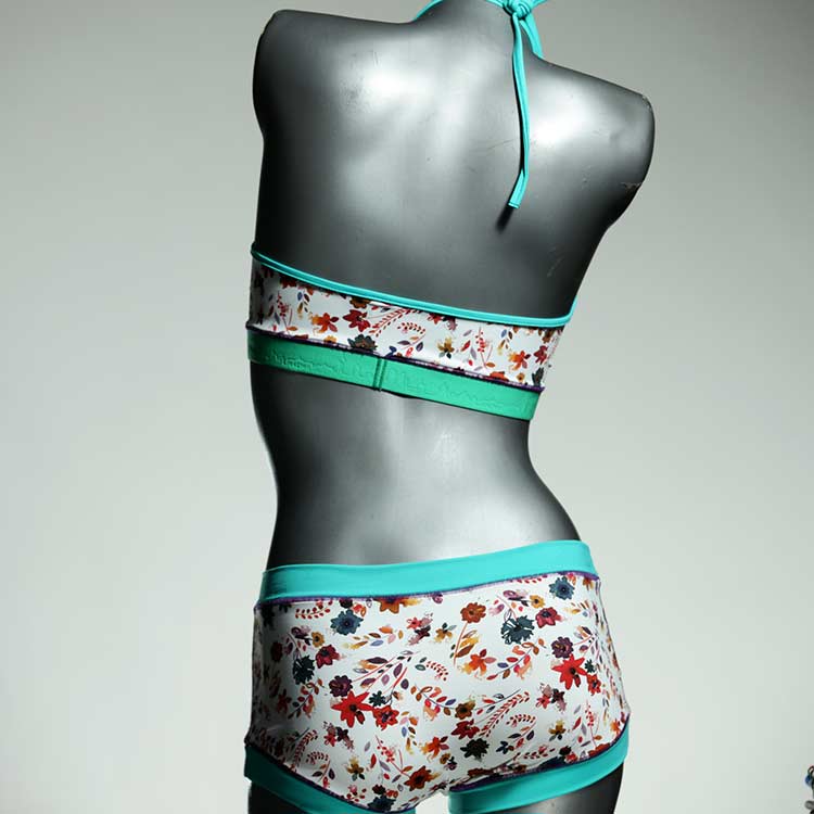 Ligesom de varme bukser og bh'er er disse sportsbikini-sæt ikke skåret for stramt, passer lige så godt og glider ikke. Materialet er af høj kvalitet og lysfast Lycra fra en lille vævemølle nær Barcelona. Stropperne er 16 mm brede og justerbare. Top uden bøjle, pude eller fastgørelse. Lavet af høj kvalitet Lycra og uden elastik. Med svømmefor foran.