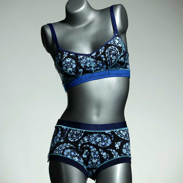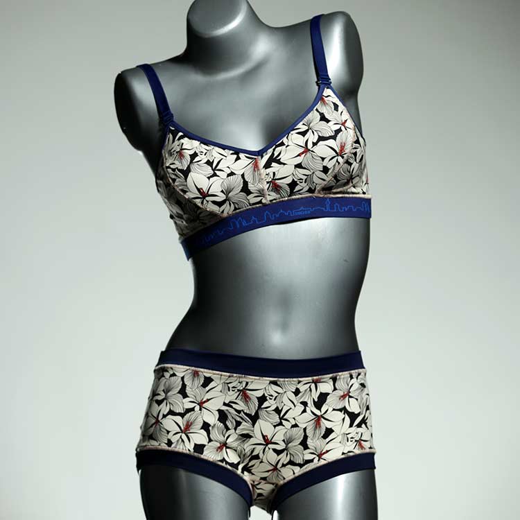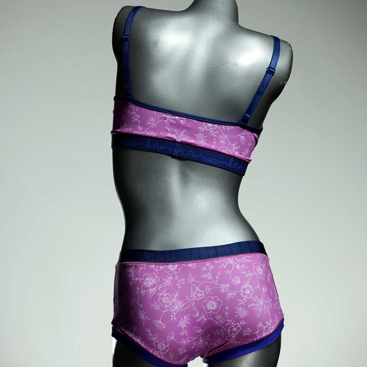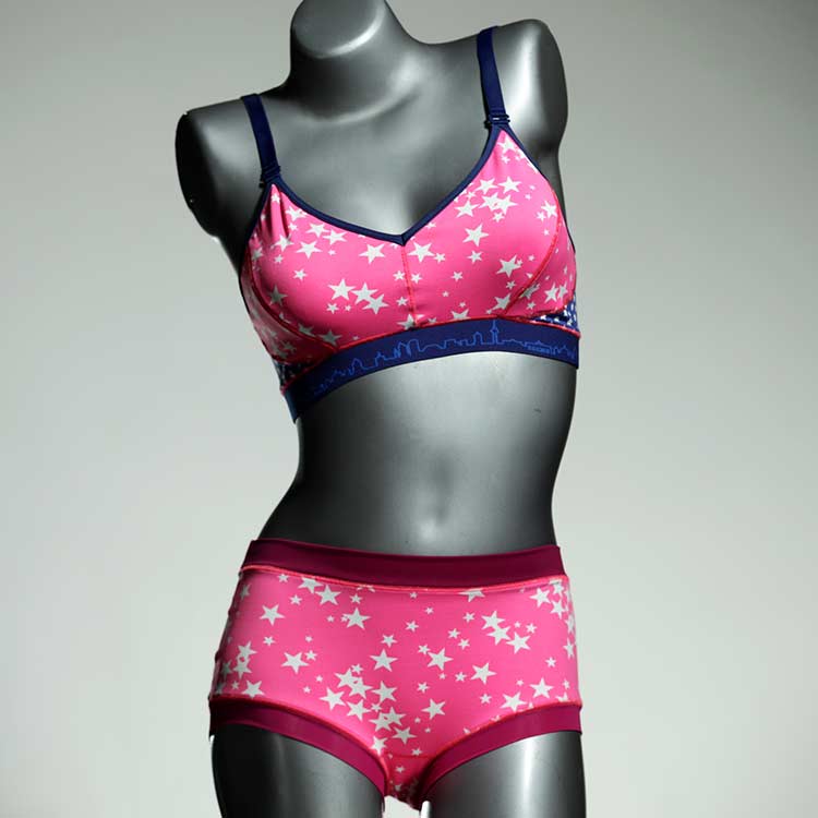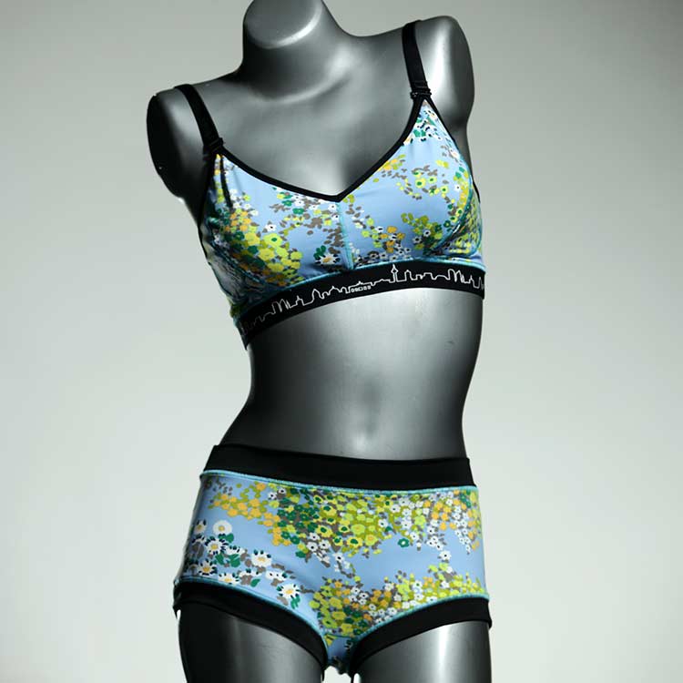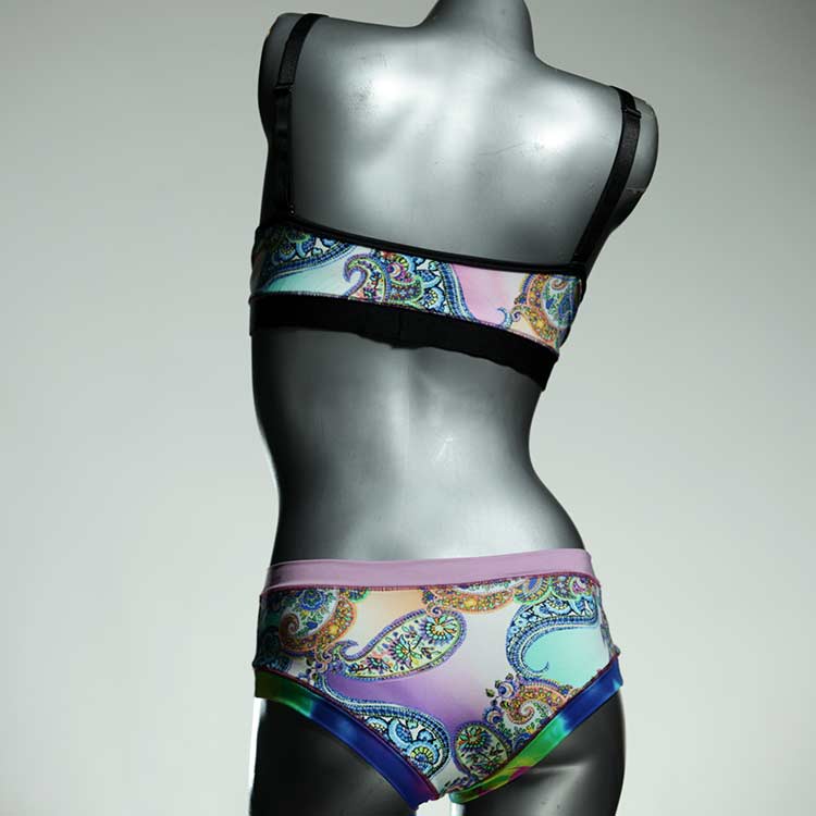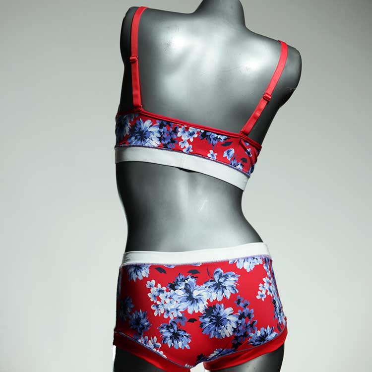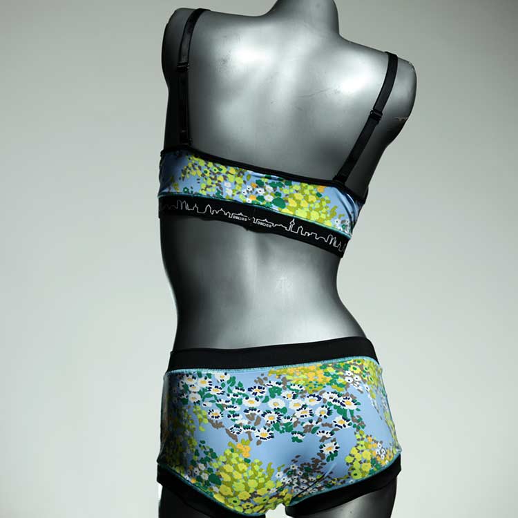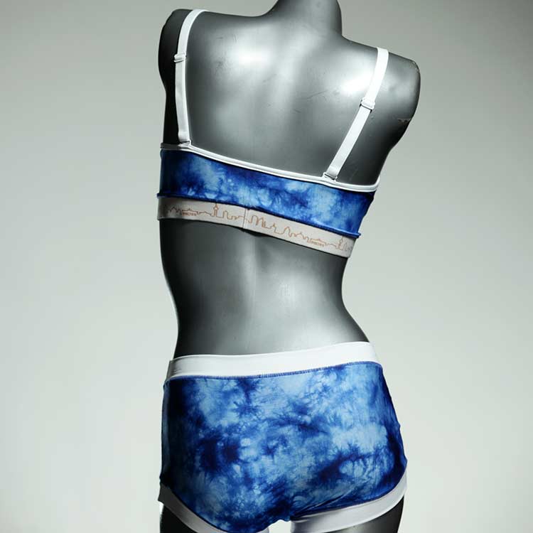Ligesom de varme bukser og bh'er er disse sportsbikini-sæt ikke skåret for stramt, passer lige så godt og glider ikke. Materialet er af høj kvalitet og lysfast Lycra fra en lille vævemølle nær Barcelona. Stropperne er 16 mm brede og justerbare. Top uden bøjle, pude eller fastgørelse. Lavet af høj kvalitet Lycra og uden elastik. Med svømmefor foran.