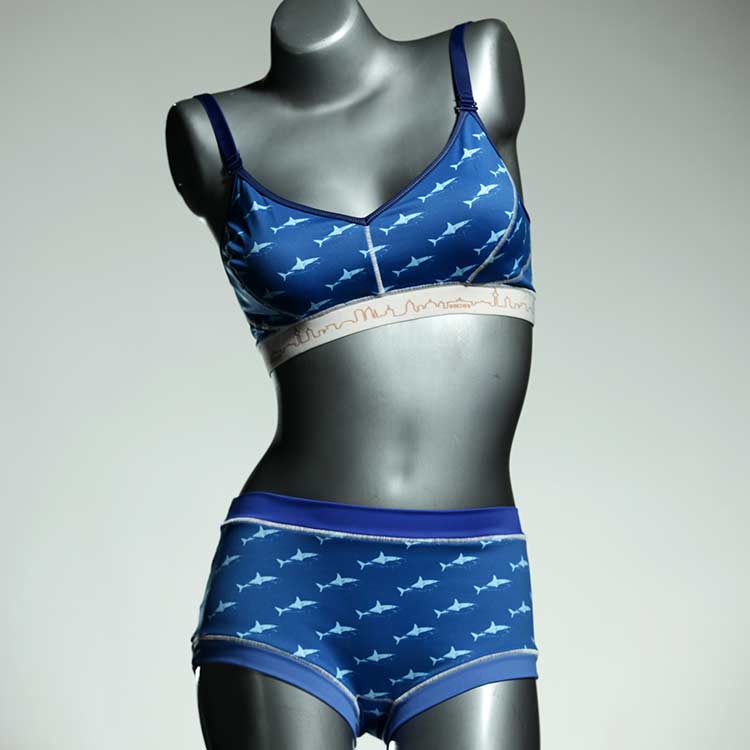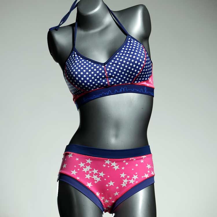 Ligesom hotpants og bh'er er sportsbikini-sætene ikke skåret for stramt, passer lige så godt og glider ikke. Fantastisk til svømning og snorkling. Materialet er af høj kvalitet og lysfast Lycra fra en lille vævemølle nær Barcelona. Stropperne er 16 mm brede og justerbare.