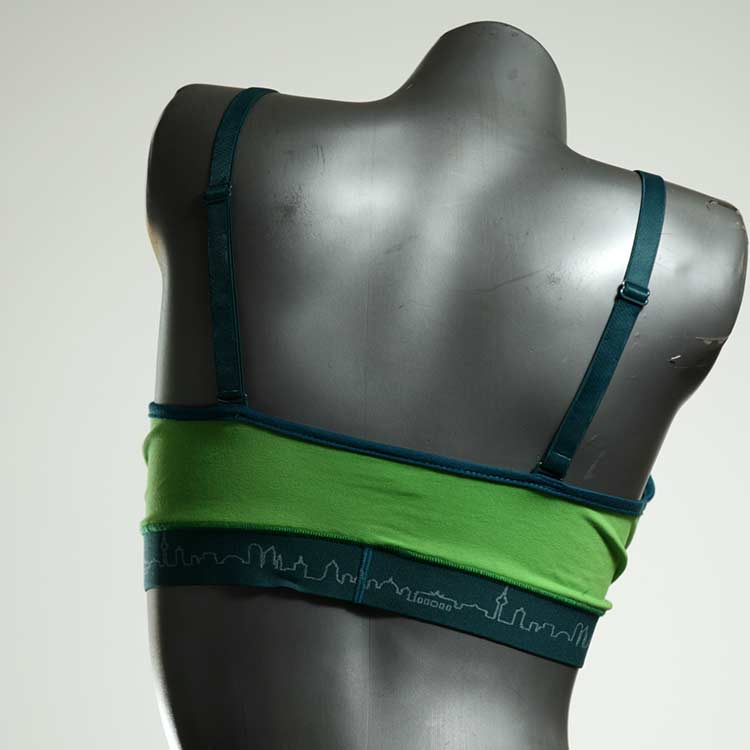 Hyggelige, bløde bh'er i åndbar økologisk bomuldsjersey med unikke designs. Ægte unikke stykker, som vi har designet efter dine ønsker. Trådløs uden pude eller fastgørelse, de er behagelige at bære og tilpasser sig perfekt til din krop. Stropperne er 16 mm brede, kopperne er dobbeltlagede og lavet af organisk bomuld på indersiden.