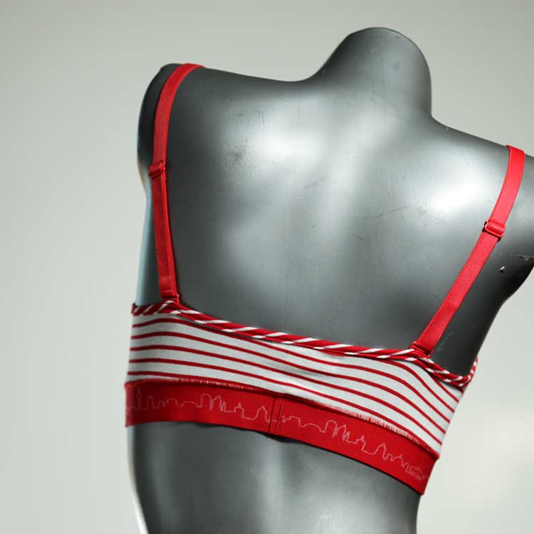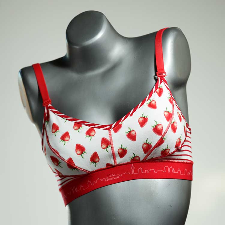 Hyggelige, bløde bh'er i åndbar bomuldsjersey med unikke designs. Ægte unikke stykker, som vi har designet efter dine ønsker. Trådløs uden pude eller fastgørelse, de er behagelige at bære og tilpasser sig perfekt til din krop. Stropperne er 16 mm brede, kopperne er dobbeltlagede og lavet af organisk bomuld på indersiden. BH'er fra Berlin Undertøj er ikke primært sexede, de skal være behagelige. De er også velegnede som amme-BH'er.