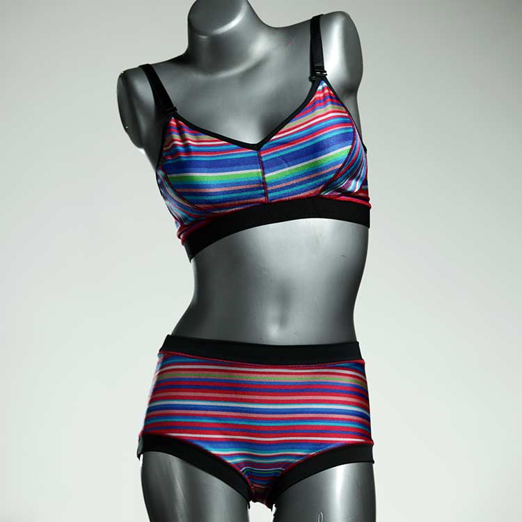 Diese schöne und bequeme Bikini-Set ist ein echtes Unikat und wurde in unserem Atelier in Berlin für Sie zugeschnitten, entworfen und genäht. Wir erschaffen täglich neue Strandmode-Einzelstücke aus weichen, bunten und lichtechten Lycrastoffen.