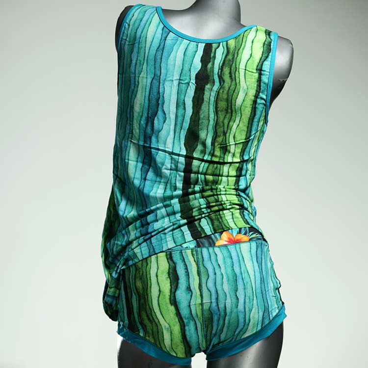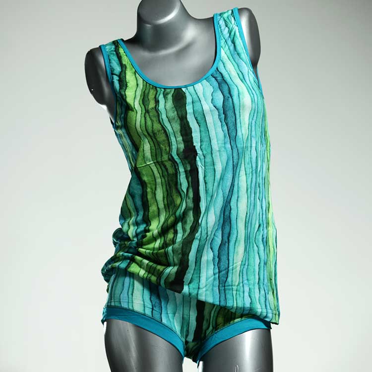 Dieses schöne und bequeme Unterwäsche Ensemble bestehend aus Top und Höschen aus Baumwolle gibt es nur einmal und es wurde in unserem Atelier in Berlin für Sie zugeschnitten, entworfen und genäht. Wir erschaffen täglich neue Unterwäsche-Einzelstücke aus weichen kunterbunten Baumwoll-Jerseys.