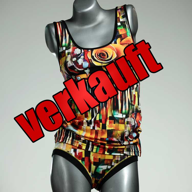 Dieses schöne und bequeme Unterwäsche Ensemble bestehend aus Top mit Höschen aus GOTS-zertifizierter Biobaumwolle gibt es nur einmal und es wurde in unserem Atelier in Berlin für Sie zugeschnitten, entworfen und genäht. Wir erschaffen täglich neue Unterwäsche-Einzelstücke aus weichen kunterbunten Baumwoll-Jerseys.