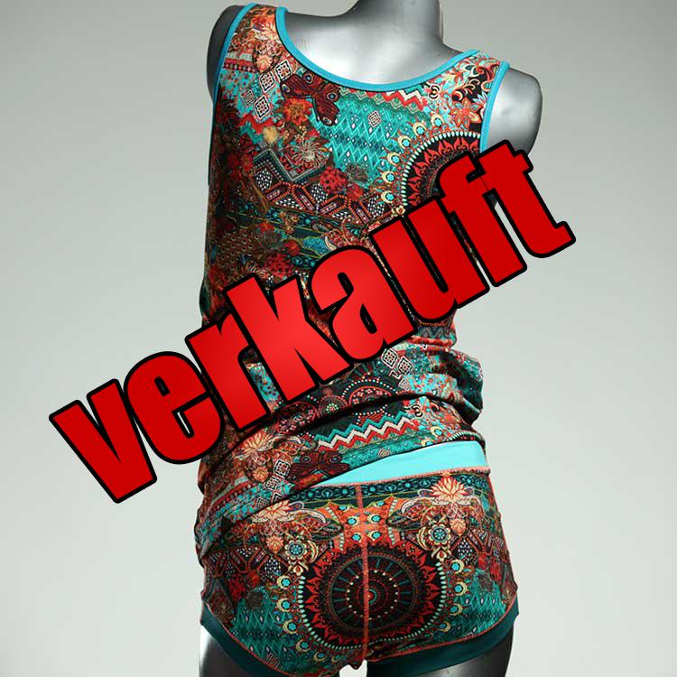 Dieses schöne und bequeme Unterwäsche Ensemble bestehend aus Top mit Höschen aus GOTS-zertifizierter Biobaumwolle gibt es nur einmal und es wurde in unserem Atelier in Berlin für Sie zugeschnitten, entworfen und genäht. Wir erschaffen täglich neue Unterwäsche-Einzelstücke aus weichen kunterbunten Baumwoll-Jerseys.