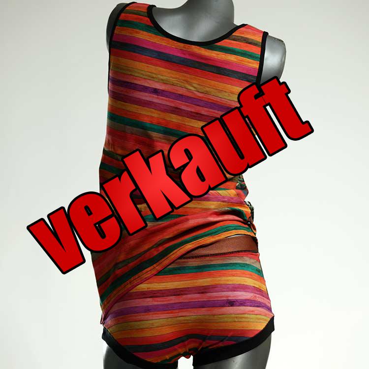 Dieses schöne und bequeme Unterwäsche Ensemble bestehend aus Top mit Höschen aus GOTS-zertifizierter Biobaumwolle gibt es nur einmal und es wurde in unserem Atelier in Berlin für Sie zugeschnitten, entworfen und genäht. Wir erschaffen täglich neue Unterwäsche-Einzelstücke aus weichen kunterbunten Baumwoll-Jerseys.
