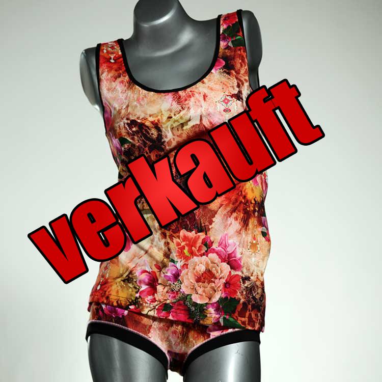 Dieses schöne und bequeme Unterwäsche Ensemble bestehend aus Top mit Höschen aus GOTS-zertifizierter Biobaumwolle gibt es nur einmal und es wurde in unserem Atelier in Berlin für Sie zugeschnitten, entworfen und genäht. Wir erschaffen täglich neue Unterwäsche-Einzelstücke aus weichen kunterbunten Baumwoll-Jerseys.