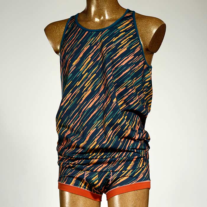 Diese schöne und bequeme Ensemble aus Unterhemd und Herrenshort aus GOTS-zertifizierter Biobaumwolle ist ein echtes Unikat und wurde in unserem Atelier in Berlin für Sie zugeschnitten, entworfen und genäht. Wir erschaffen täglich neue Unterwäsche-Einzelstücke aus weichen bunten Baumwoll-Jerseys.