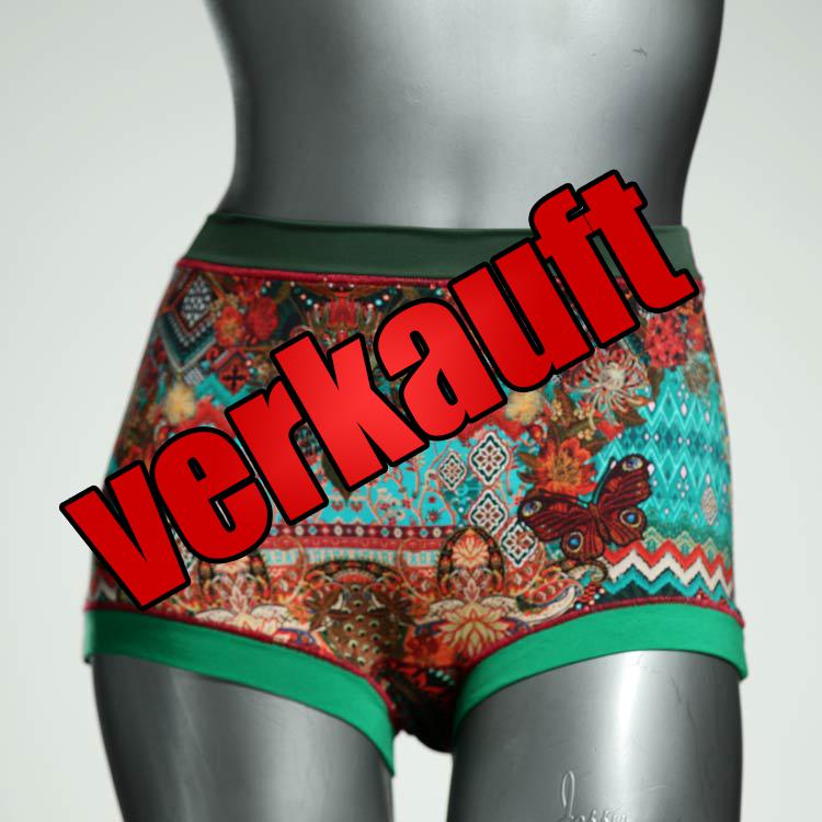 Für den einen sind es Hotpants, für den anderen Boyshorts, da gibt es keine einheitliche Regelung. Wir sagen Panties zu den schmaleren Höschen und Hotpants zu den breiteren. Die Passform haben wir über Jahre in Absprache mit unseren Kundinnen immer wieder ein wenig verbessert. Wir versuchen ein breites Spektrum von Designs abzudecken, von Blumenmotiven bis zu geometrischen Mustern. Wenn Sie ihren Kleinderschrank etwas aufpeppen möchten, wären diese Unterhosen ein Schritt in die richtige Richtung, denn diese hoch geschnittenen Hotpants sind nicht nur fetzige Unikate, sondern auch vegan. Einfach nur Baumwolle aus der Levante.