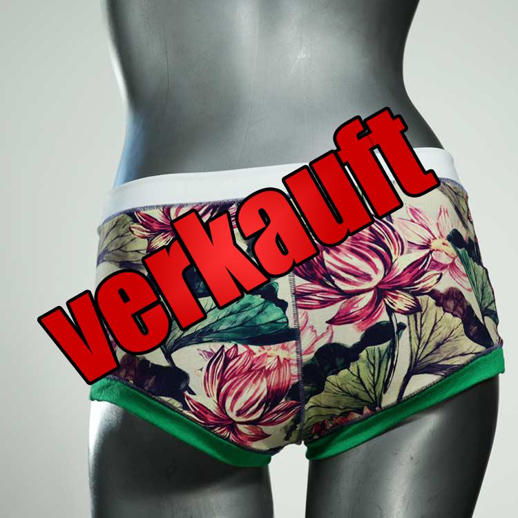 Für den einen sind es Hotpants, für den anderen Boyshorts, da gibt es keine einheitliche Regelung. Wir sagen Panties zu den schmaleren Höschen und Hotpants zu den breiteren. Die Passform haben wir über Jahre in Absprache mit unseren Kundinnen immer wieder ein wenig verbessert. Wir versuchen ein breites Spektrum von Designs abzudecken, von Blumenmotiven bis zu geometrischen Mustern. Wenn Sie ihren Kleinderschrank etwas aufpeppen möchten, wären diese Unterhosen ein Schritt in die richtige Richtung, denn diese Hotpants sind nicht nur fetzige Unikate, sondern auch vegan. Einfach nur Baumwolle aus der Levante.