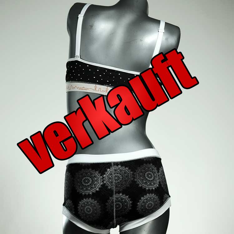 Zauberhaftes Ensemble aus BH mit doppellagigem, elastischem und atmungsaktivem Baumwolljersey und passendem Höschen mit einzigartigem Design. Ein bequemes, fair hergestelltes Unikat aus unserer Manufaktur.