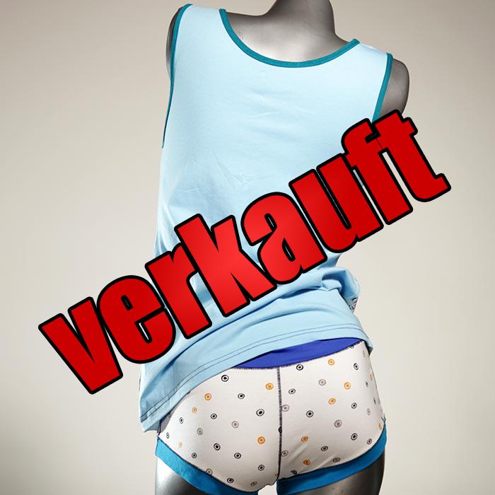 Dieses schöne und bequeme Unterwäsche Ensemble bestehend aus Top mit Höschen aus GOTS-zertifizierter Biobaumwolle gibt es nur einmal und es wurde in unserem Atelier in Berlin für Sie zugeschnitten, entworfen und genäht. Wir erschaffen täglich neue Unterwäsche-Einzelstücke aus weichen kunterbunten Baumwoll-Jerseys.