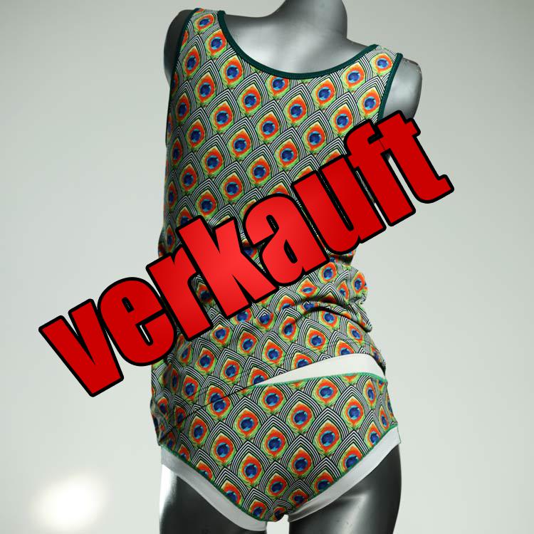 Dieses schöne und bequeme Unterwäsche Ensemble bestehend aus Top und Höschen aus Baumwolle gibt es nur einmal und es wurde in unserem Atelier in Berlin für Sie zugeschnitten, entworfen und genäht. Wir erschaffen täglich neue Unterwäsche-Einzelstücke aus weichen kunterbunten Baumwoll-Jerseys.