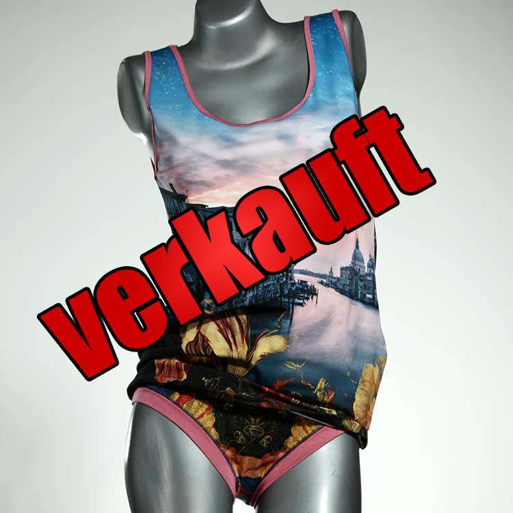 Dieses schöne und bequeme Unterwäsche Ensemble bestehend aus Top und Höschen aus Baumwolle gibt es nur einmal und es wurde in unserem Atelier in Berlin für Sie zugeschnitten, entworfen und genäht. Wir erschaffen täglich neue Unterwäsche-Einzelstücke aus weichen kunterbunten Baumwoll-Jerseys.