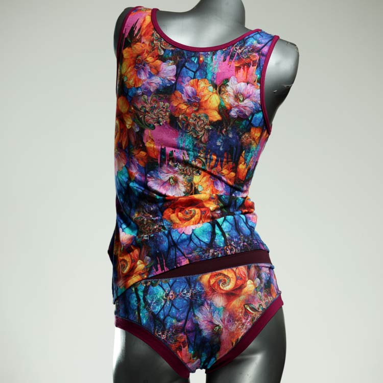 Dieses schöne und bequeme Unterwäsche Ensemble bestehend aus Top und Höschen aus Baumwolle gibt es nur einmal und es wurde in unserem Atelier in Berlin für Sie zugeschnitten, entworfen und genäht. Wir erschaffen täglich neue Unterwäsche-Einzelstücke aus weichen kunterbunten Baumwoll-Jerseys.