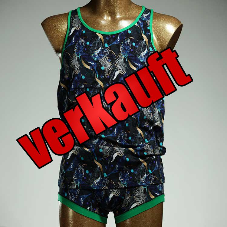 Diese schöne und bequeme Ensemble aus Unterhemd und Herrenshort aus Baumwolle ist ein echtes Unikat und wurde in unserem Atelier in Berlin für Sie zugeschnitten, entworfen und genäht. Wir erschaffen täglich neue Unterwäsche-Einzelstücke aus weichen bunten Baumwoll-Jerseys.