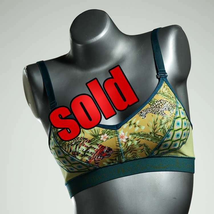 Cuddly, soft bras made of breathable cotton jersey with unique designs. Real one-of-a-kind pieces that we have designed according to your wishes. Wireless, without a pillow or fastener, they are comfortable to wear and adapt to your body perfectly. The straps are 16mm wide, the cups are double-layered and made of organic cotton on the inside. Bras from Berlin Underwear are not primarily sexy, they should be comfortable. They are also suitable as nursing bras.