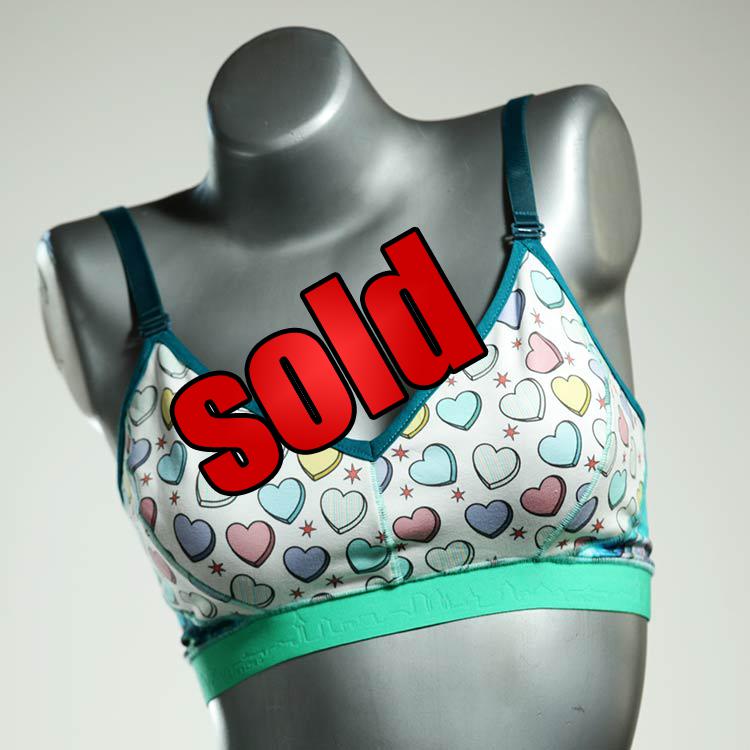 Sujetadores blandos y suaves hechos de jersey de algodón transpirable con diseños únicos. Verdaderas piezas únicas que hemos diseñado según sus deseos. Inalámbricos, sin almohada ni cierre, son cómodos de llevar y se adaptan perfectamente a tu cuerpo. Las correas tienen 16 mm de ancho, las copas son de doble capa y están hechas de algodón orgánico en el interior.