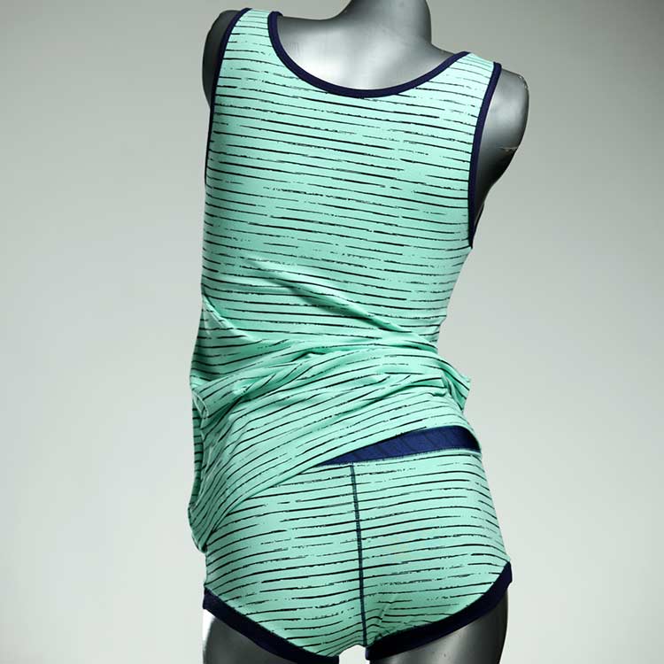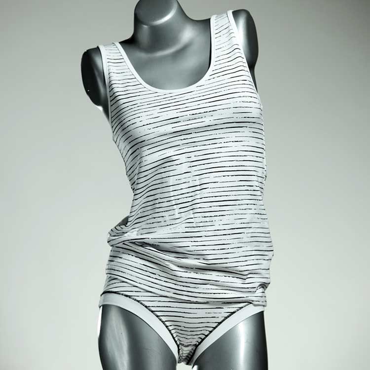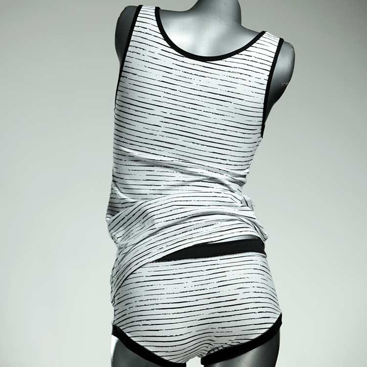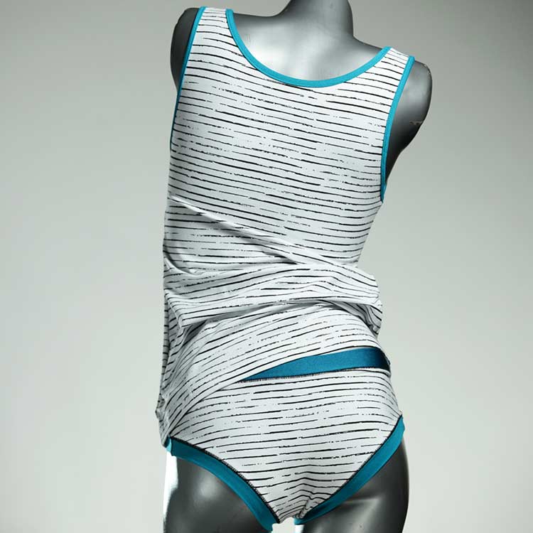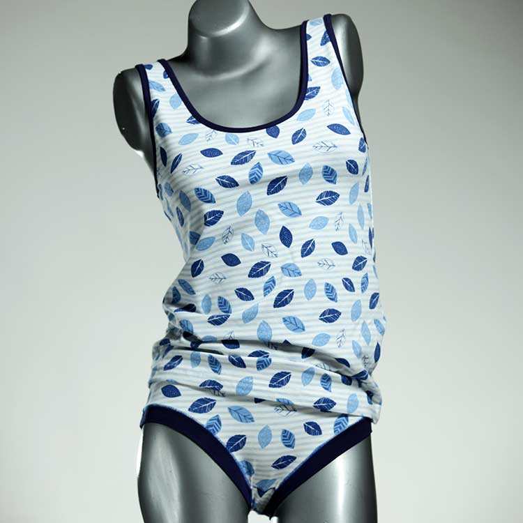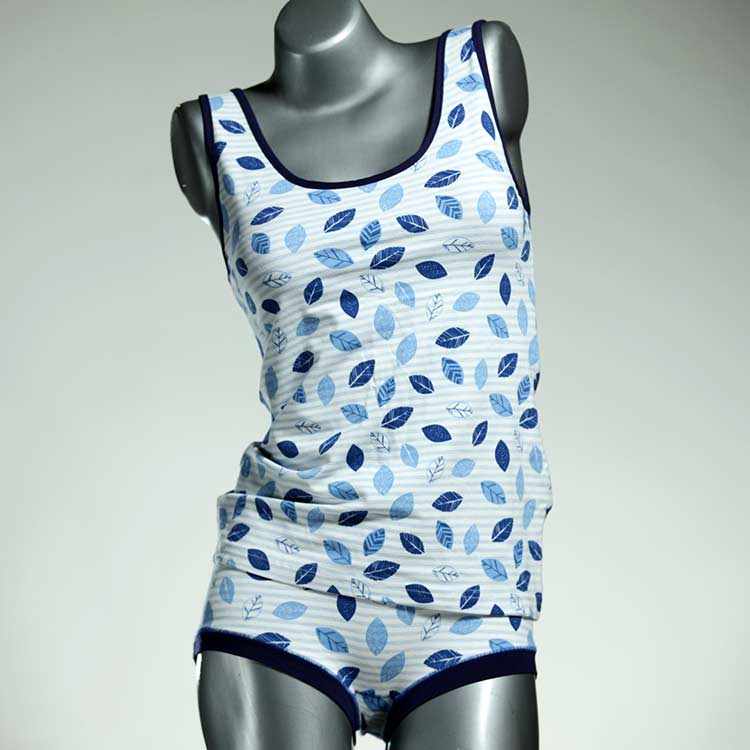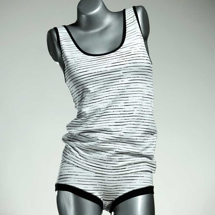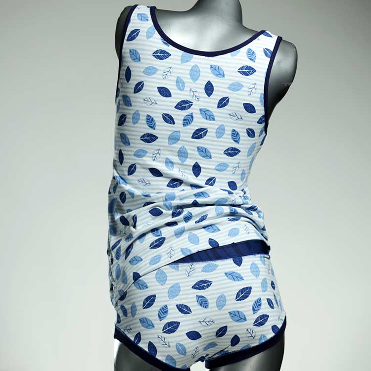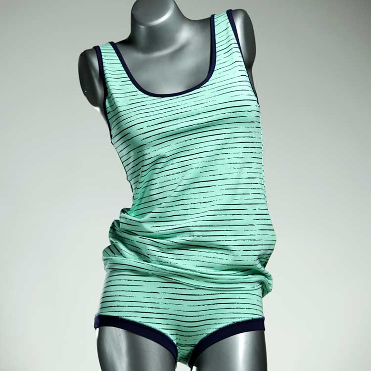 Adorable conjunto de ropa interior con la parte superior hecha de algodón elástico suave y transpirable para debajo y por encima. La parte superior está cortada a la cintura, el escote se cierra hasta la mitad. Con elástico de encaje fino o dobladillo de algodón en brazos y escote.