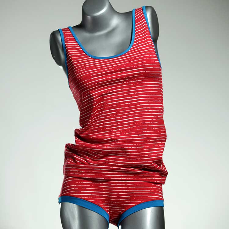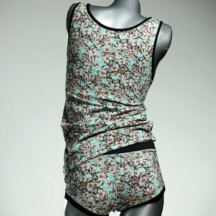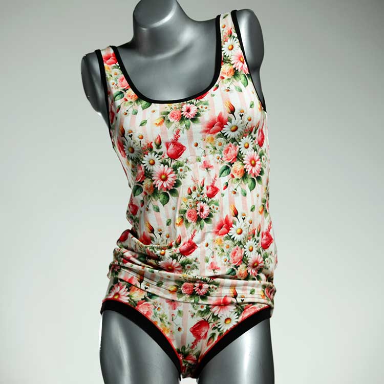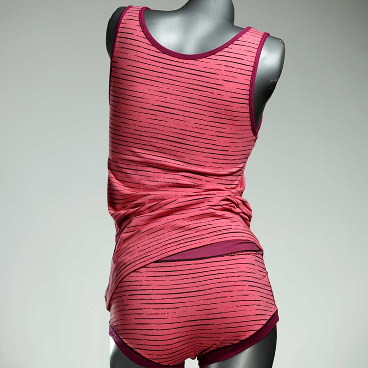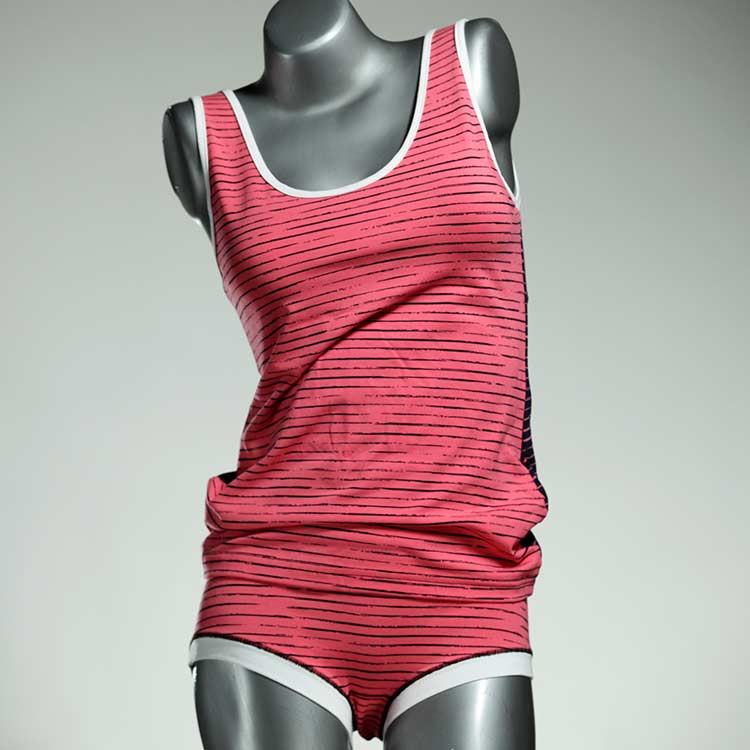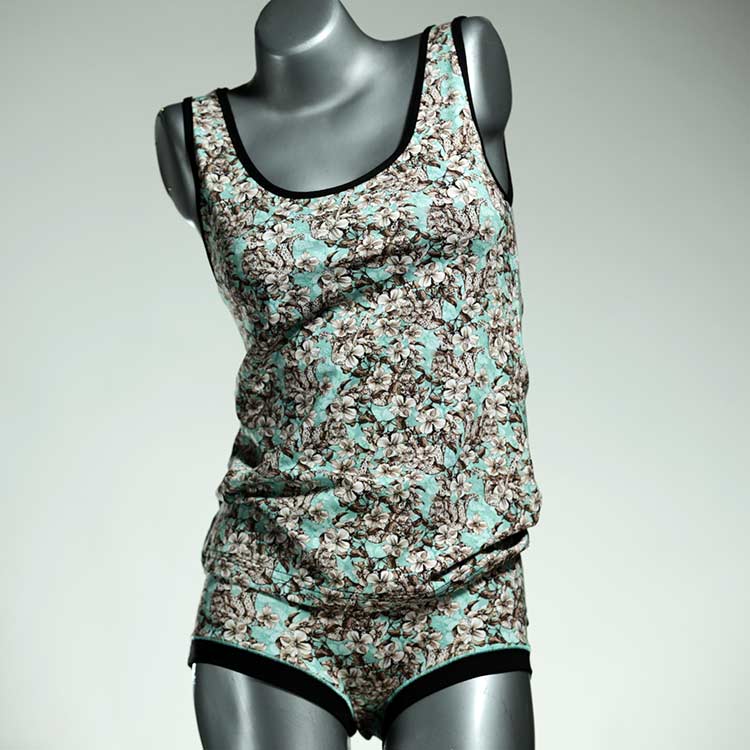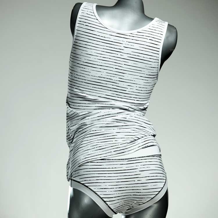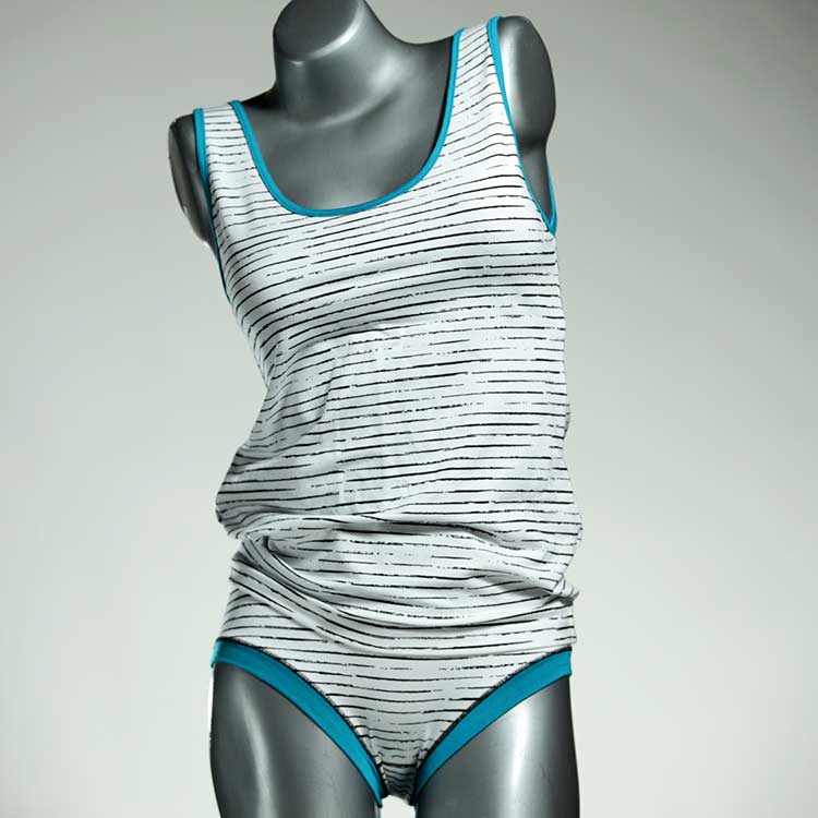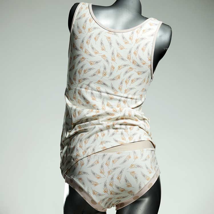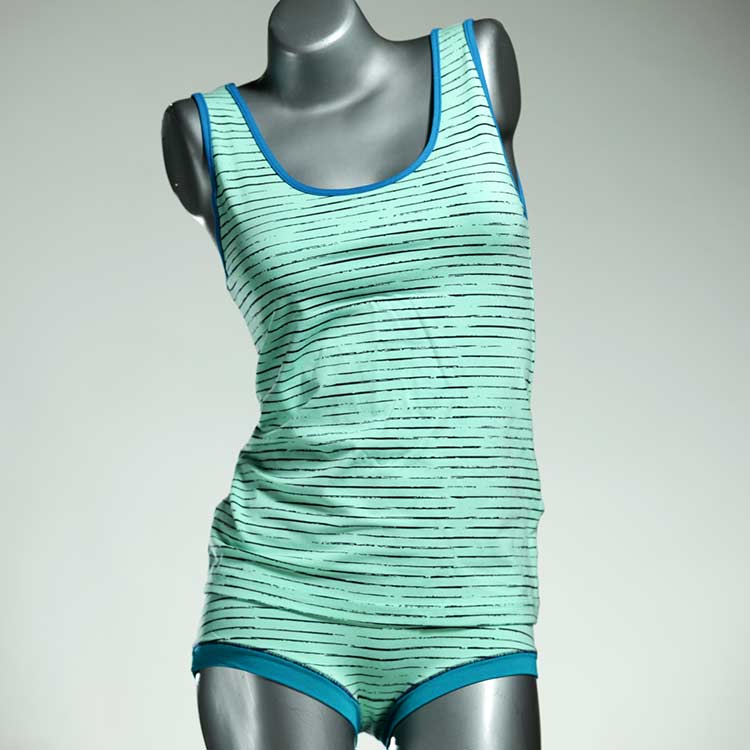 Adorable conjunto de ropa interior con la parte superior hecha de algodón elástico suave y transpirable para debajo y por encima. La parte superior está cortada a la cintura, el escote se cierra hasta la mitad. Con elástico de encaje fino o dobladillo de algodón en brazos y escote.