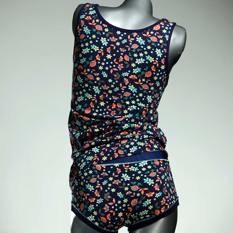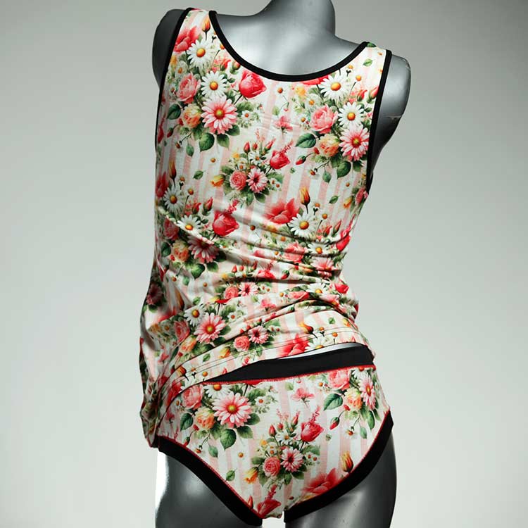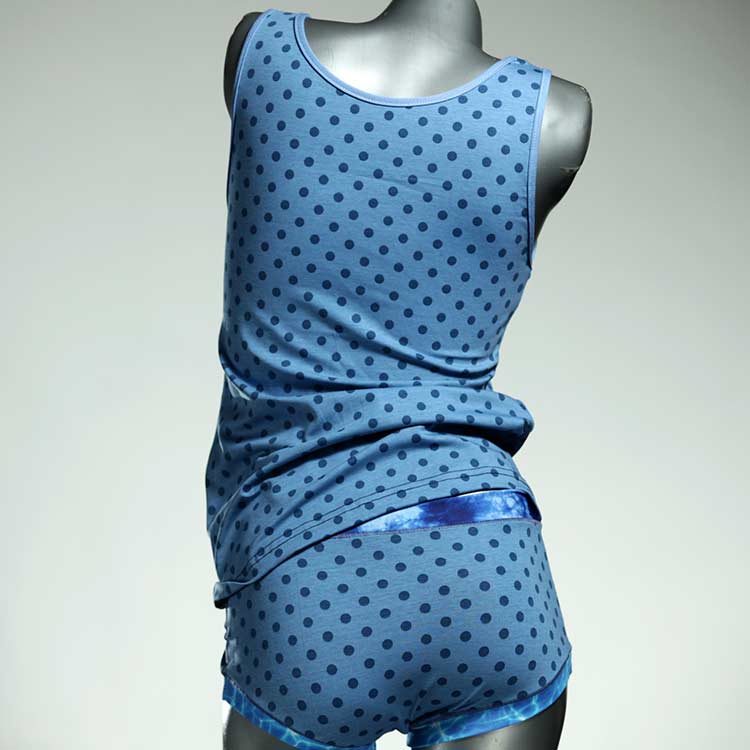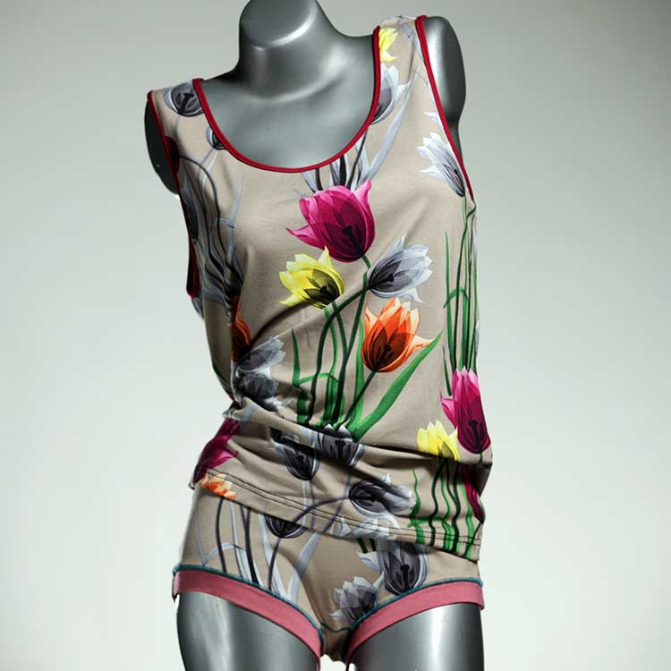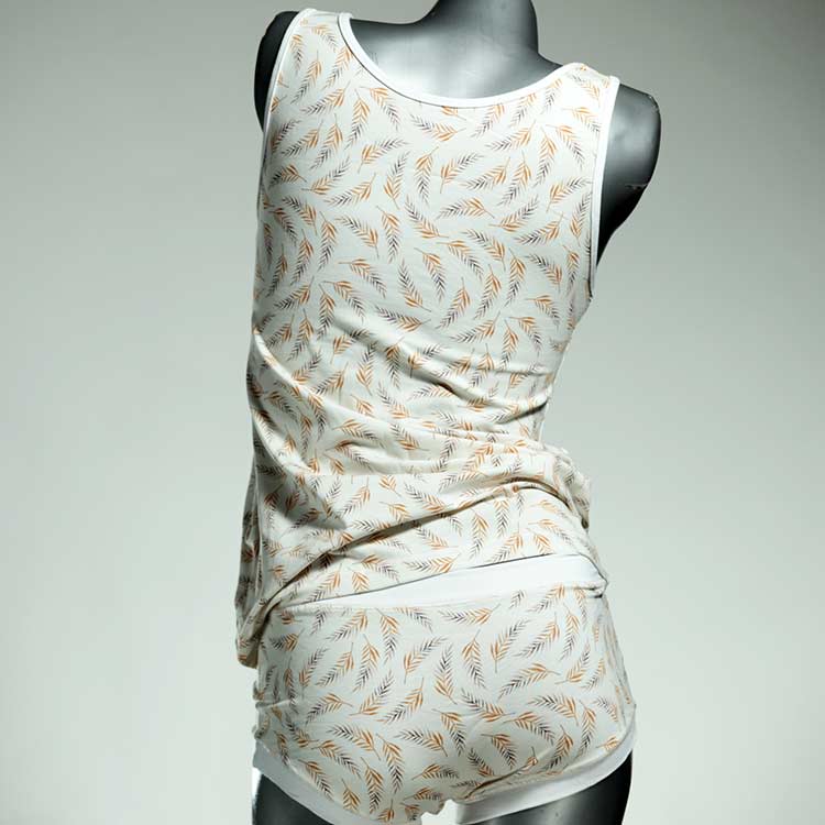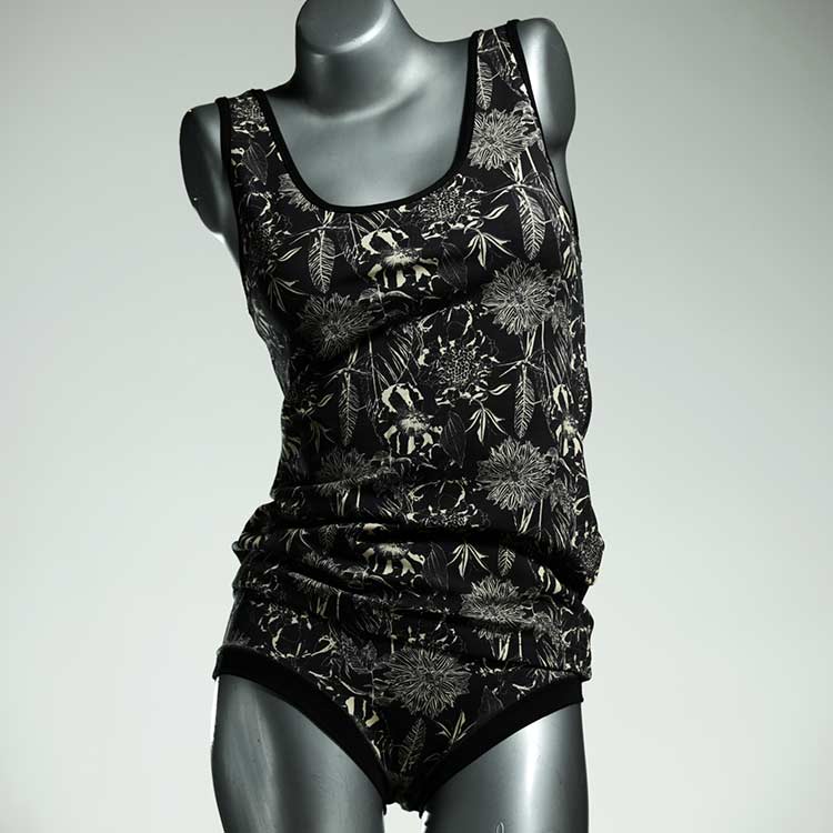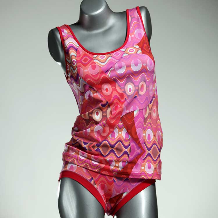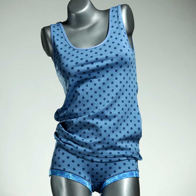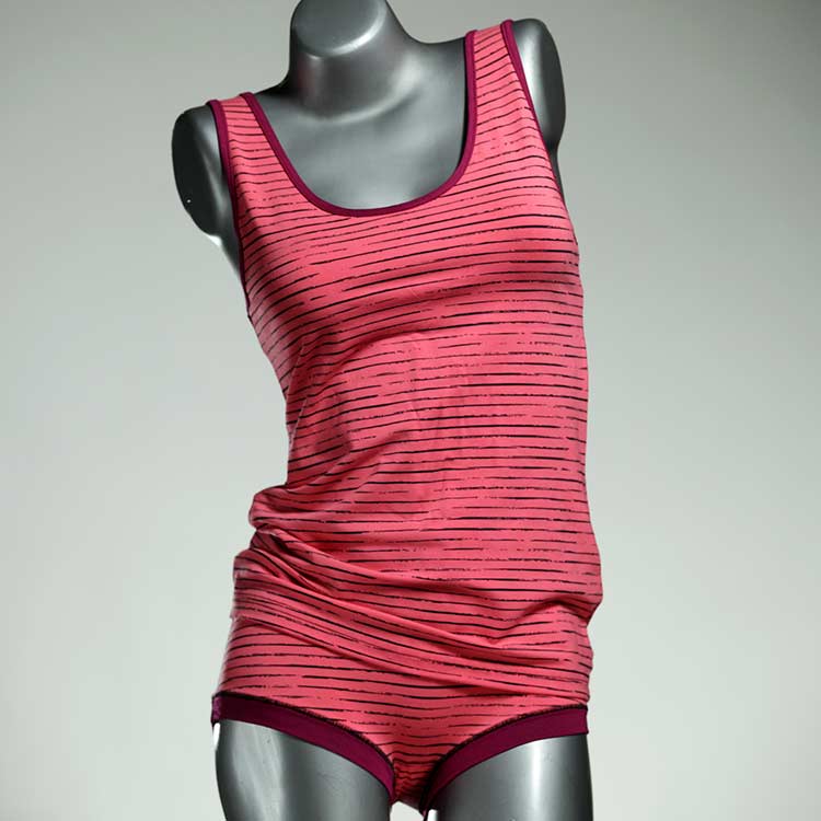 Adorable conjunto de ropa interior con la parte superior hecha de algodón elástico suave y transpirable para debajo y por encima. La parte superior está cortada a la cintura, el escote se cierra hasta la mitad. Con elástico de encaje fino o dobladillo de algodón en brazos y escote.