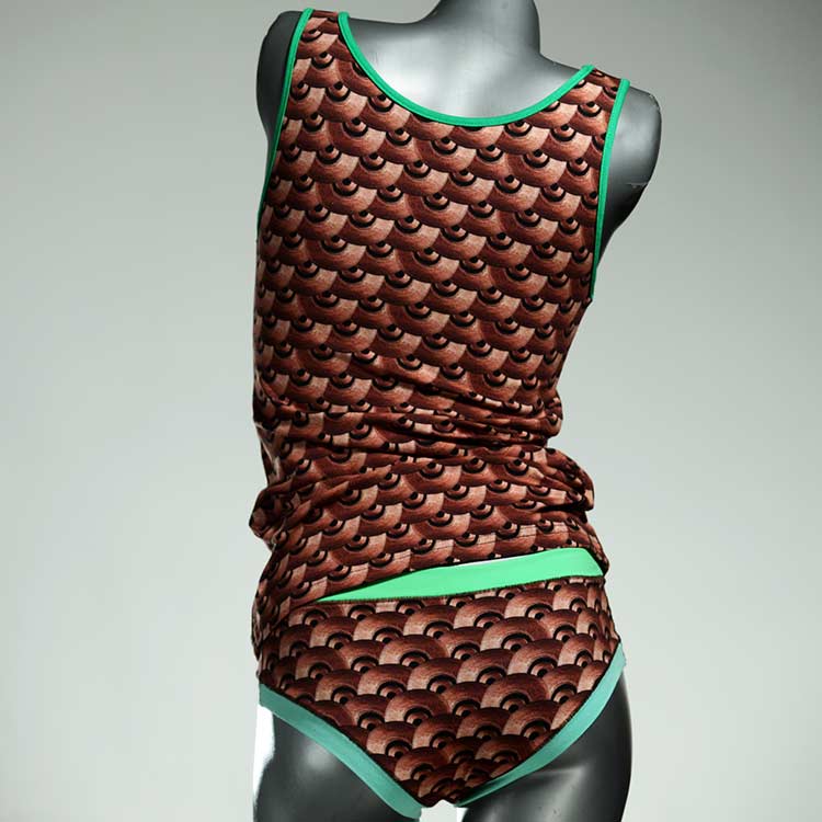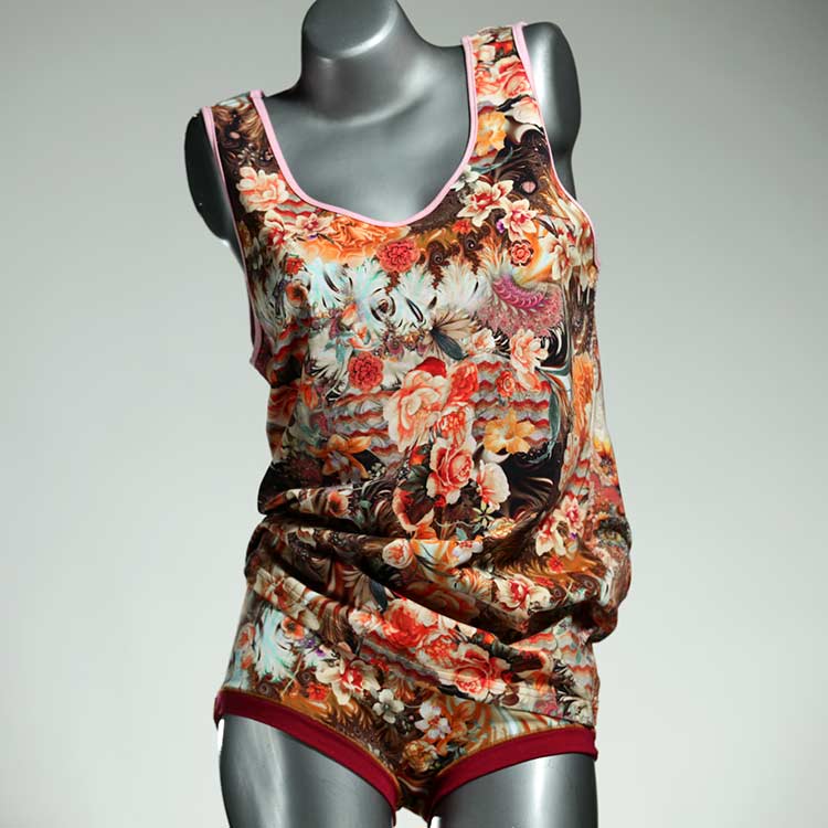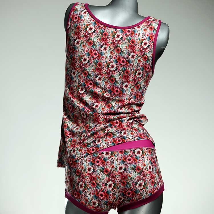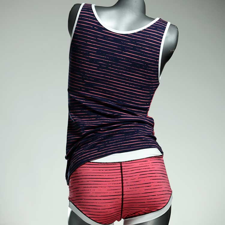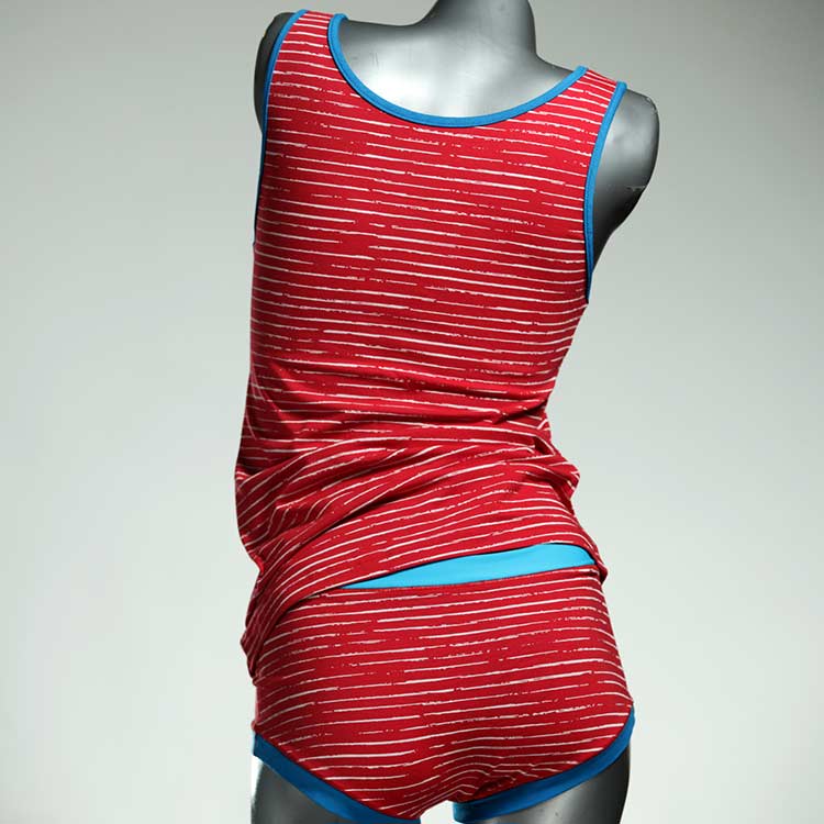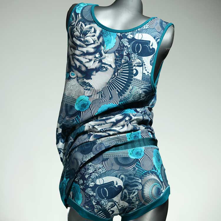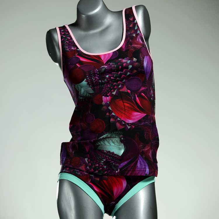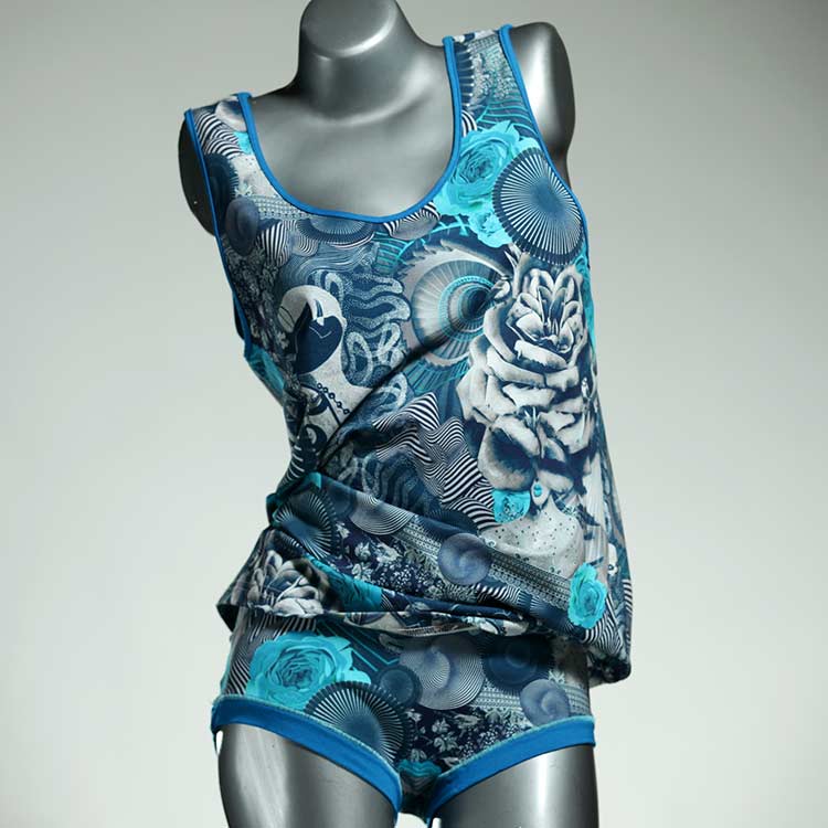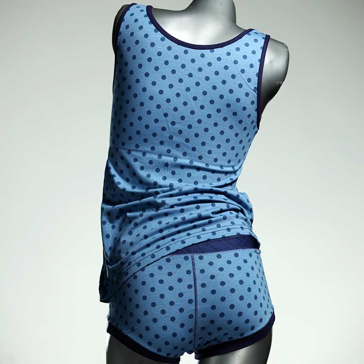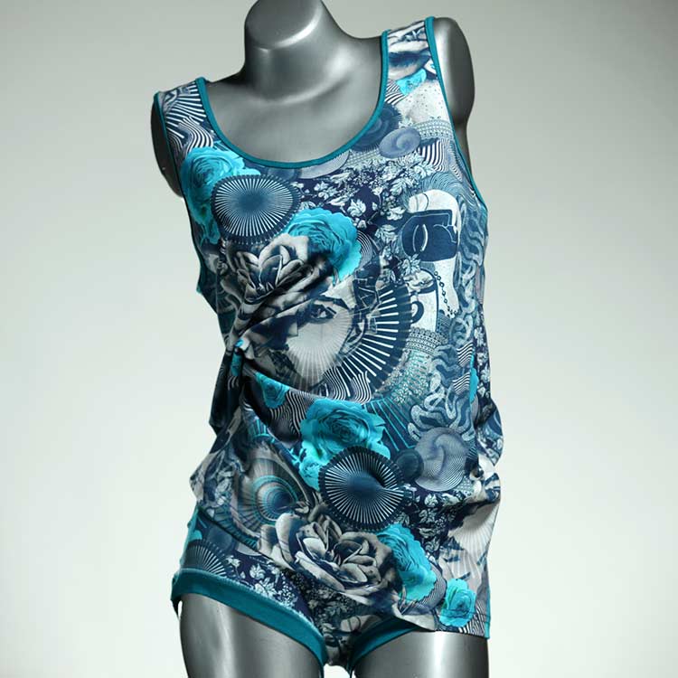 Adorable conjunto de ropa interior con la parte superior hecha de algodón elástico suave y transpirable para debajo y por encima. La parte superior está cortada a la cintura, el escote se cierra hasta la mitad. Con elástico de encaje fino o dobladillo de algodón en brazos y escote.