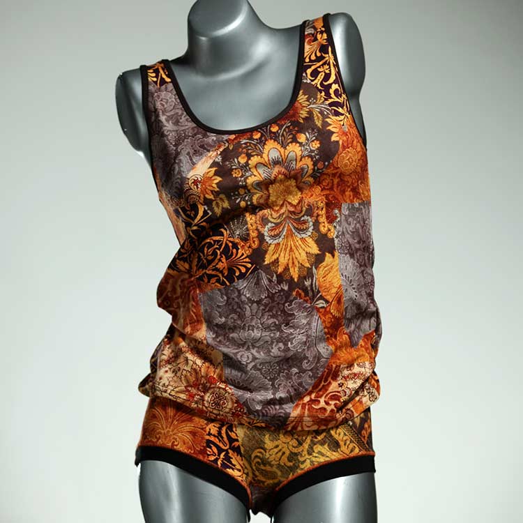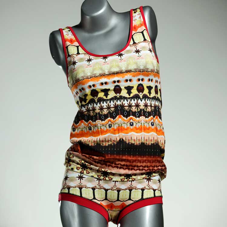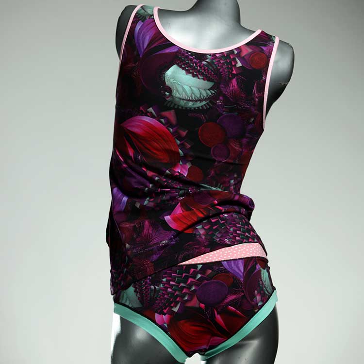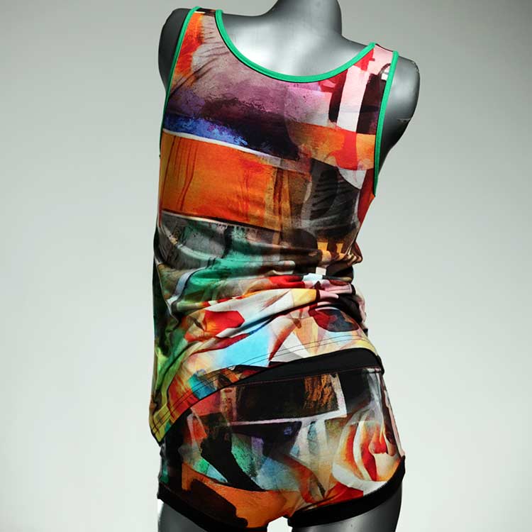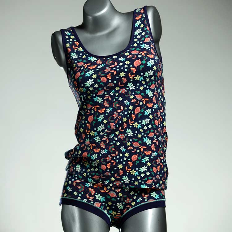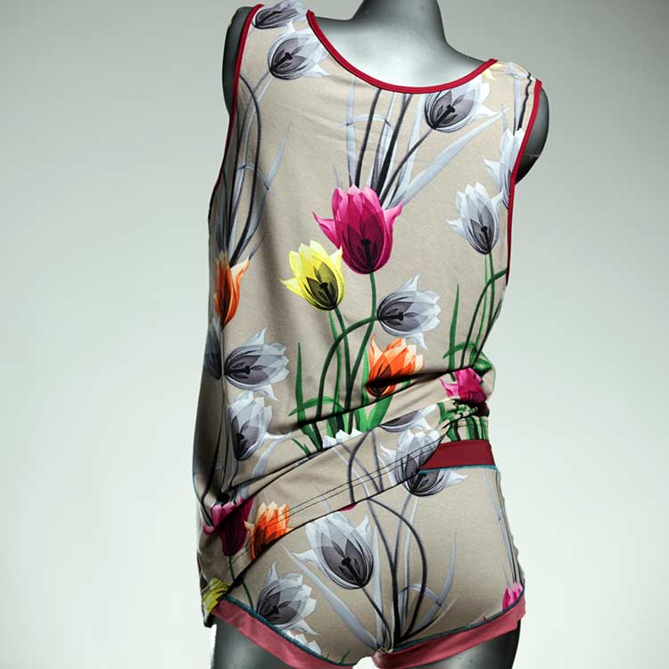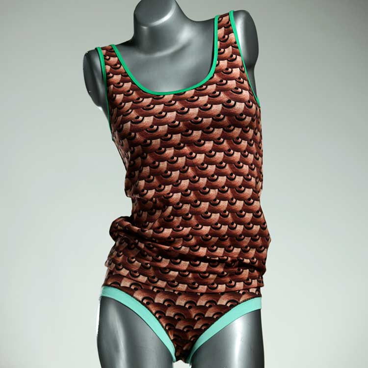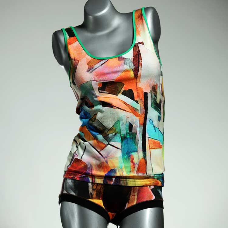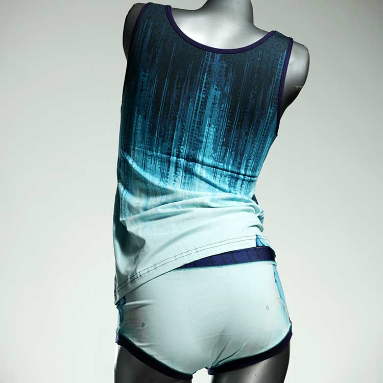 Adorable conjunto de ropa interior con la parte superior hecha de algodón elástico suave y transpirable para debajo y por encima. La parte superior está cortada a la cintura, el escote se cierra hasta la mitad. Con elástico de encaje fino o dobladillo de algodón en brazos y escote.