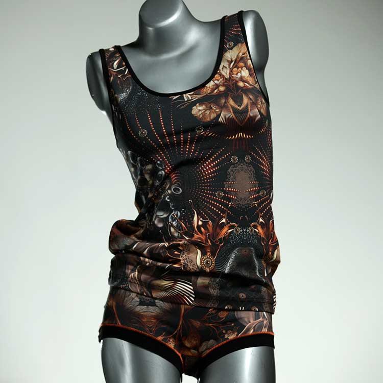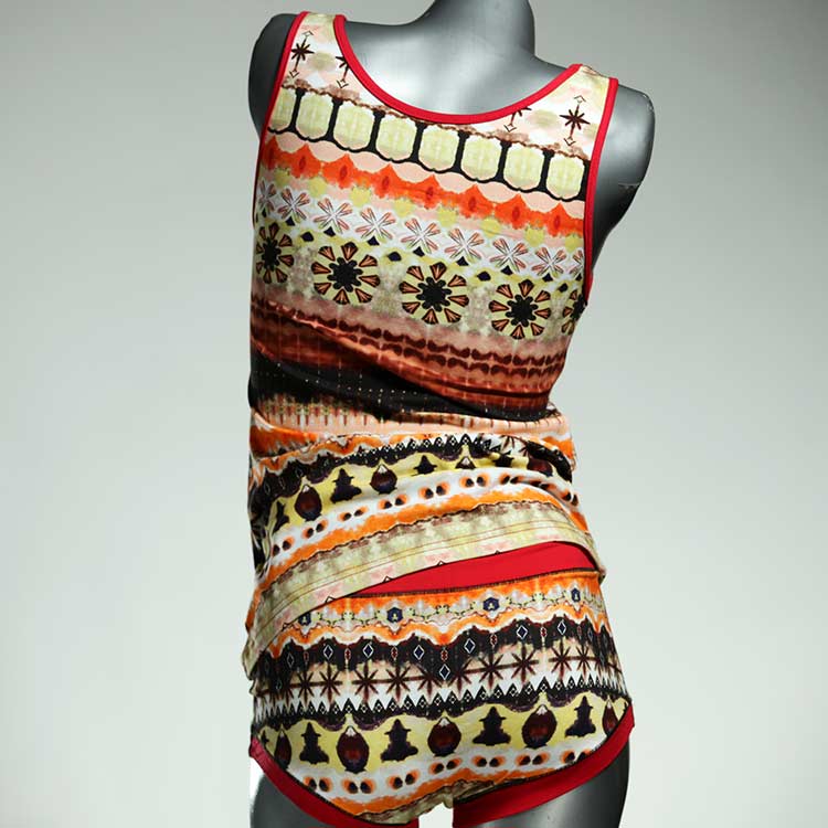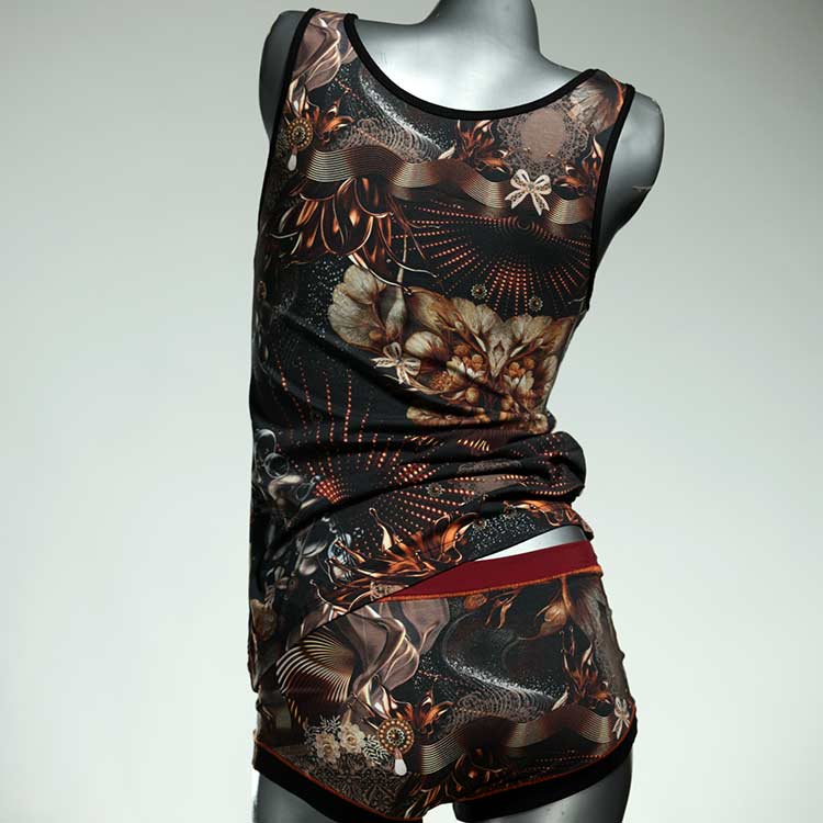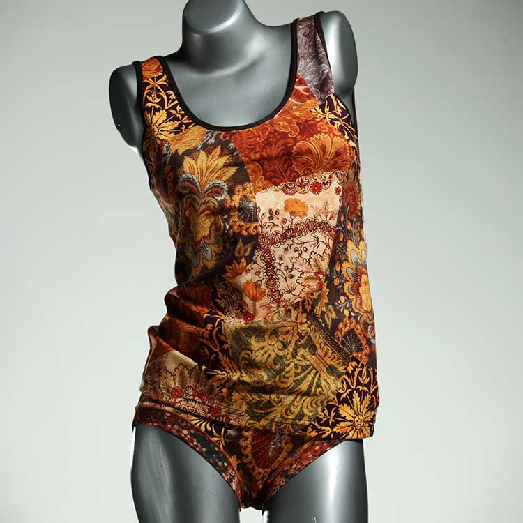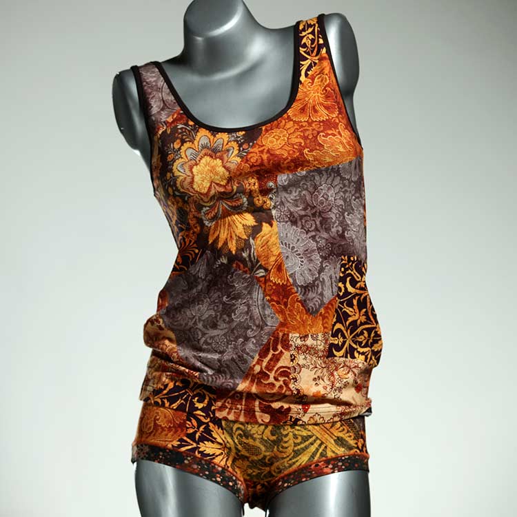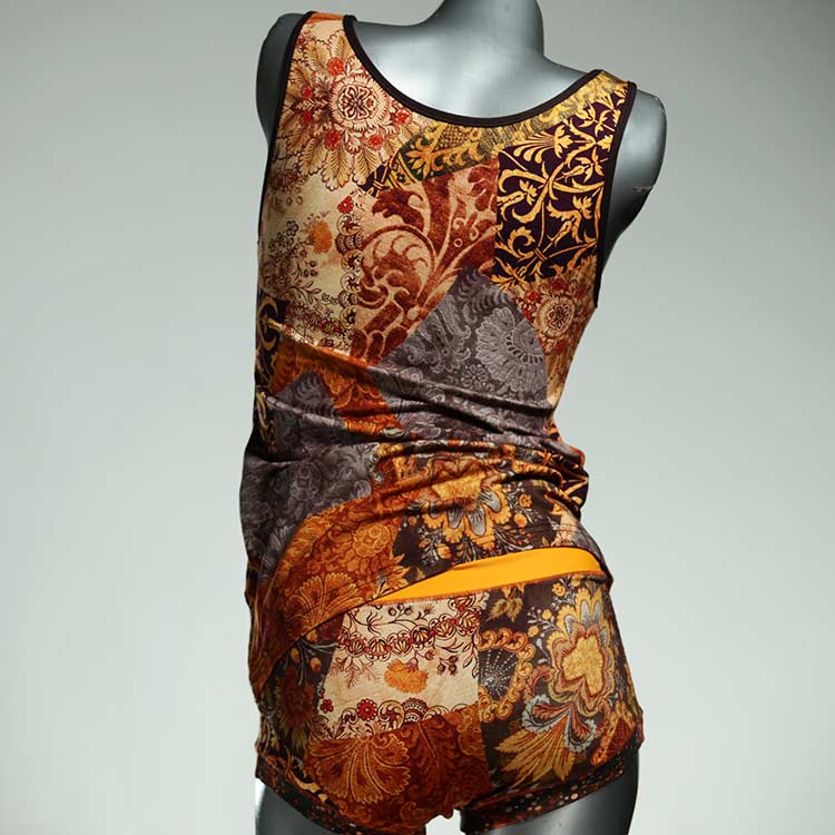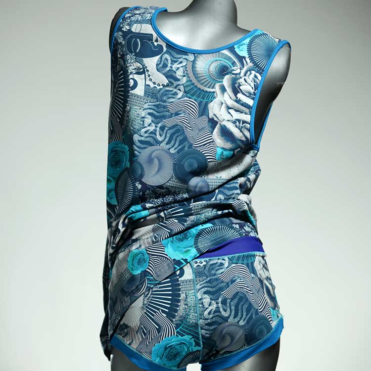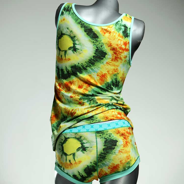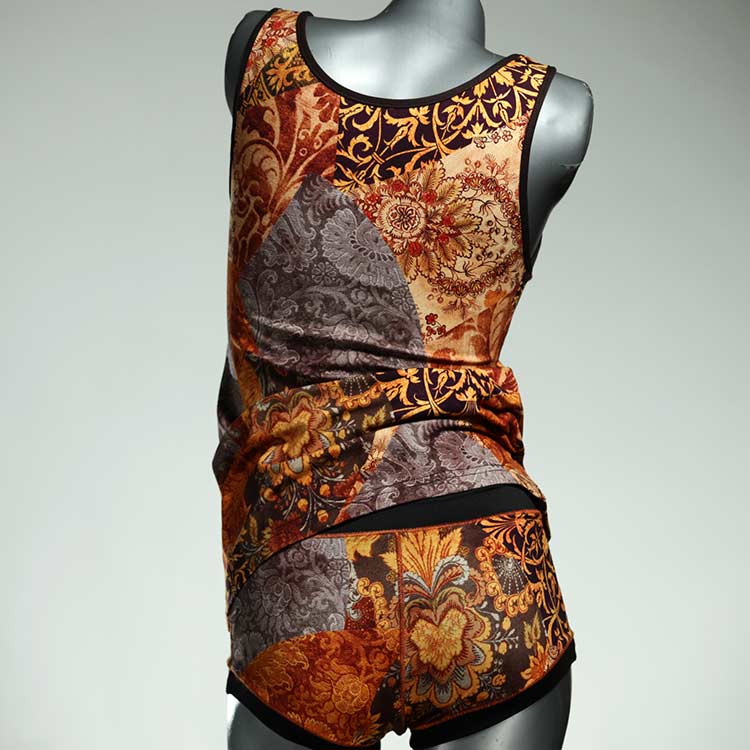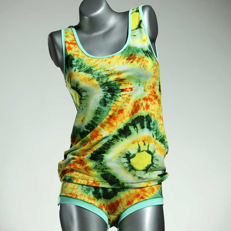 Adorable conjunto de ropa interior con la parte superior hecha de algodón elástico suave y transpirable para debajo y por encima. La parte superior está cortada a la cintura, el escote se cierra hasta la mitad. Con elástico de encaje fino o dobladillo de algodón en brazos y escote.