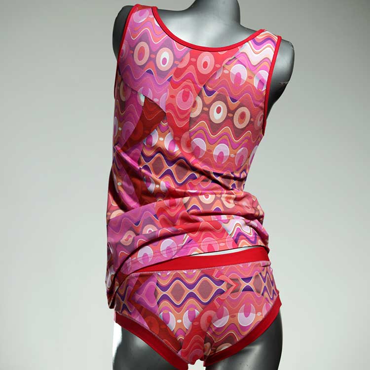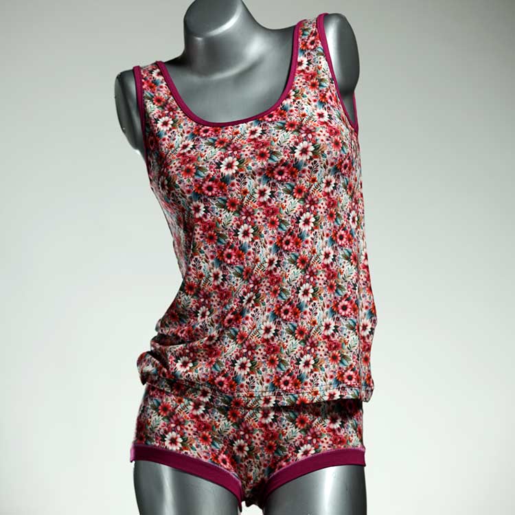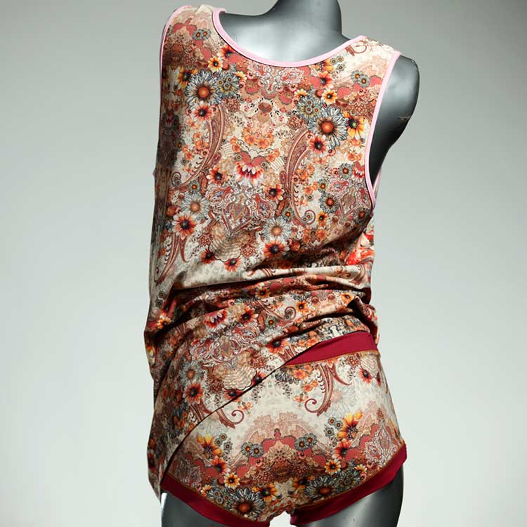 Adorables conjuntos de ropa interior con camisa de algodón suave, transpirable y elástico para debajo y encima. La parte superior está cortada a la cintura, el escote se cierra hasta la mitad con un elástico de encaje fino o dobladillo de algodón en los brazos y el escote.