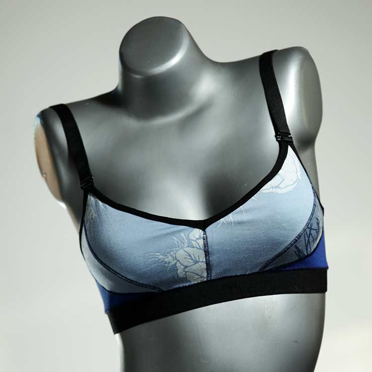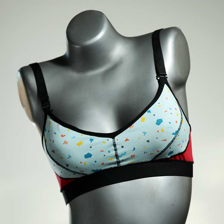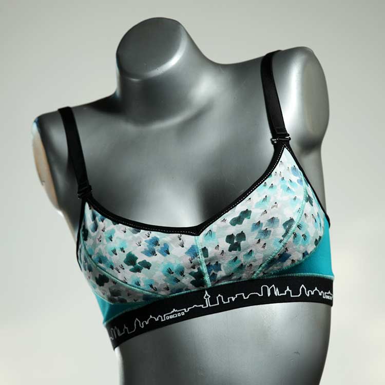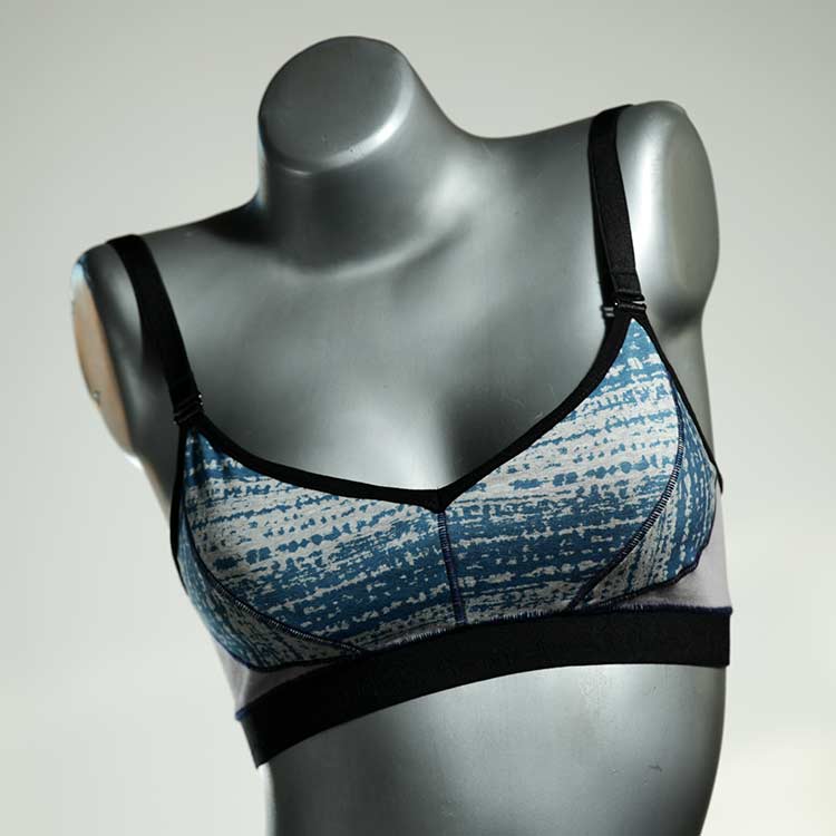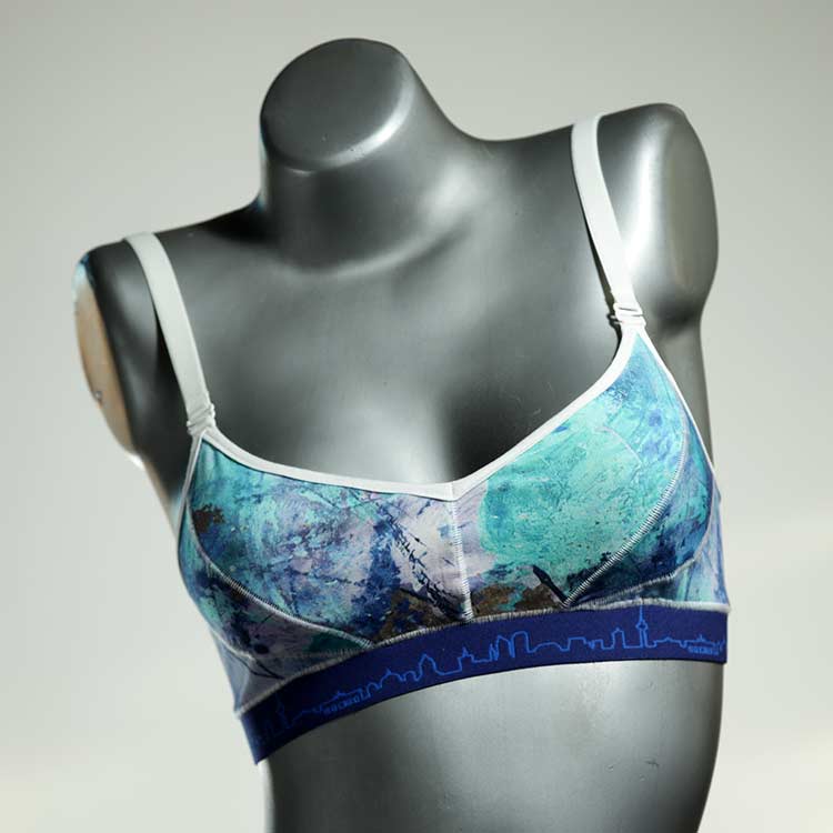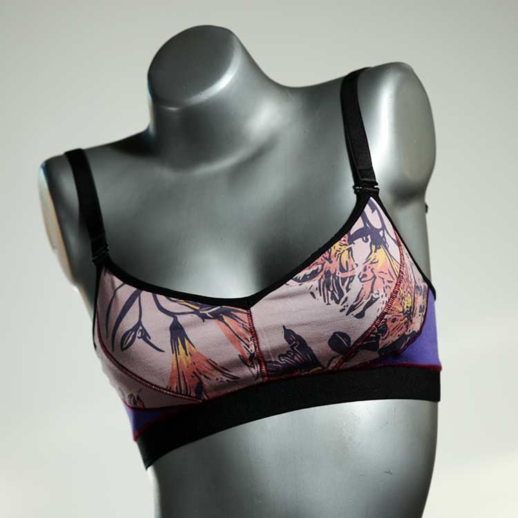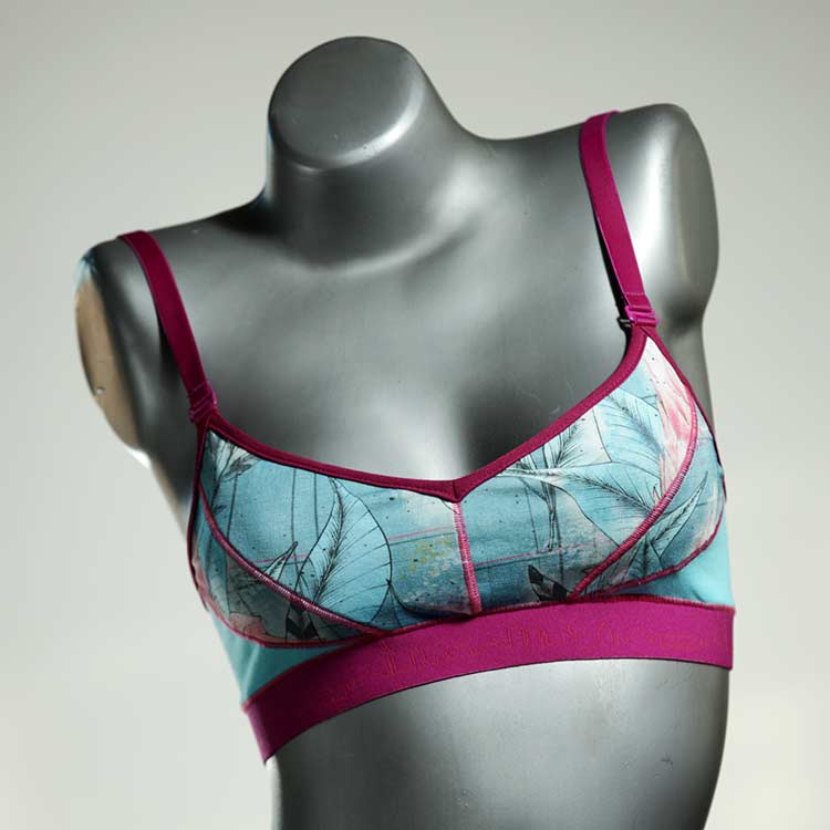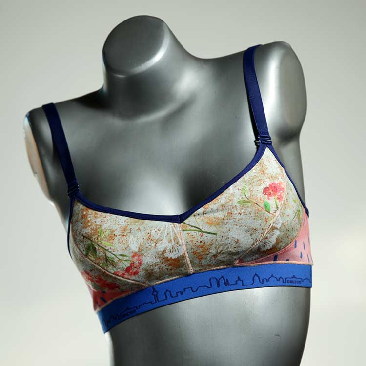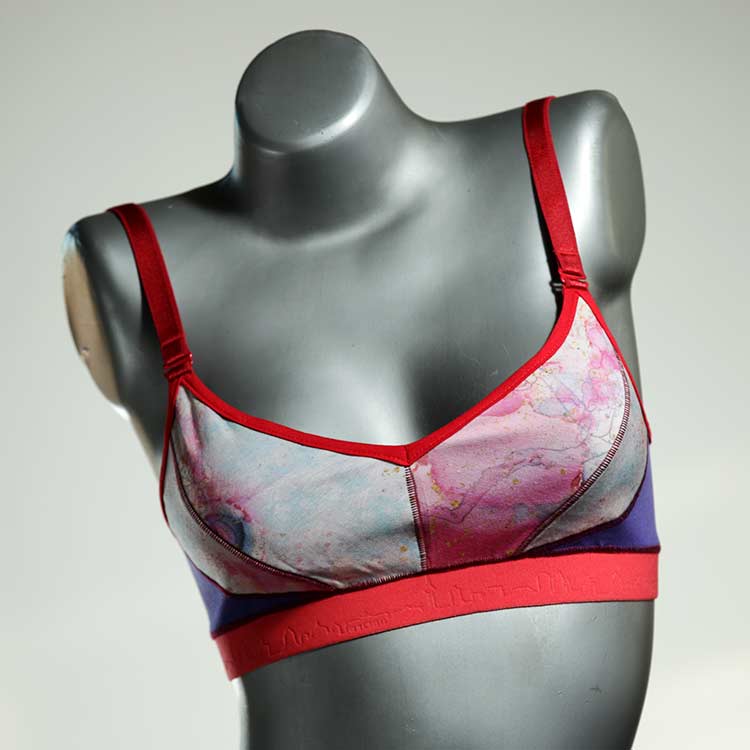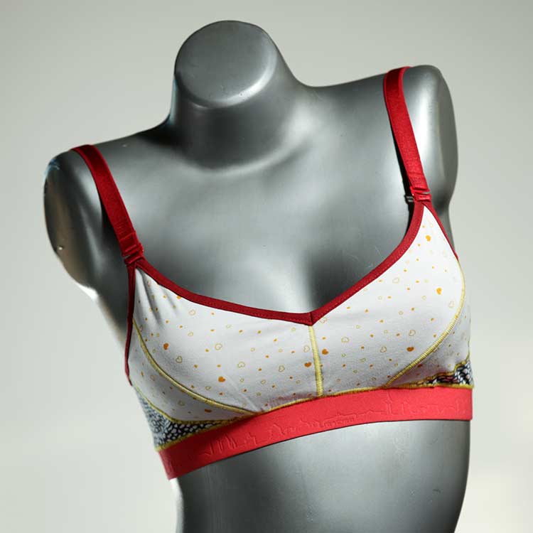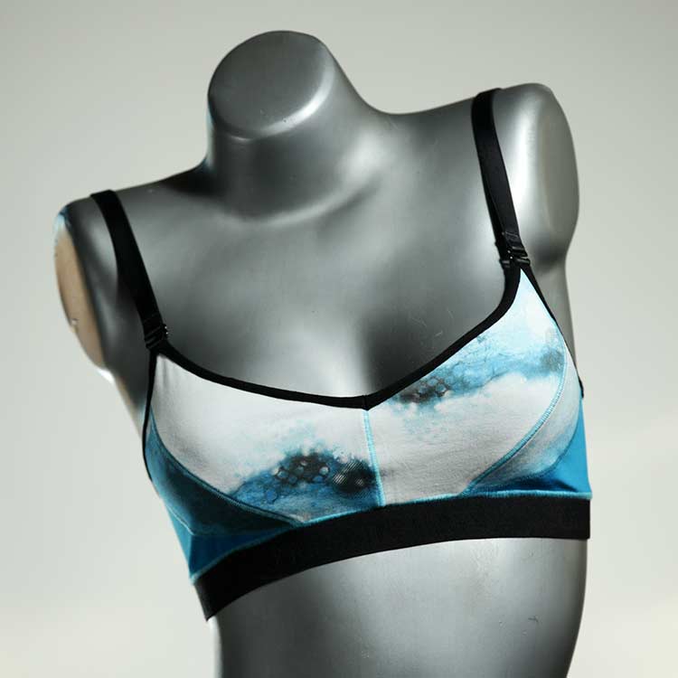 Soutien-gorge moelleux et doux en jersey de coton biologique respirant avec des designs uniques. Une véritable pièce unique issue de la production locale. Sans fil, sans oreiller ni attache, ils sont confortables à porter. Les bretelles ont une largeur de 16 mm, les bonnets sont à double épaisseur et en coton biologique à l'intérieur. Convient également comme soutien-gorge d'allaitement.