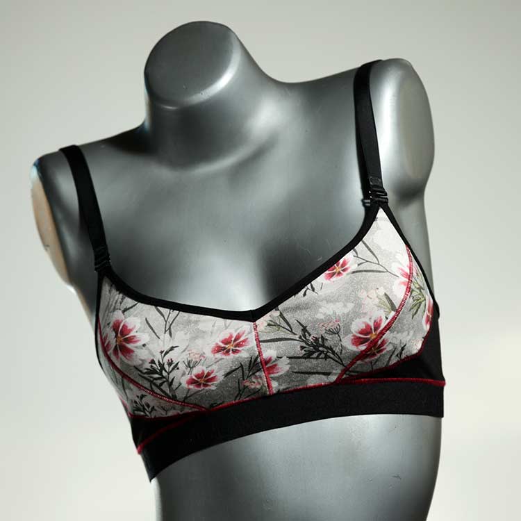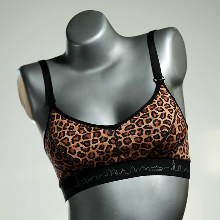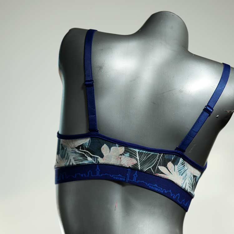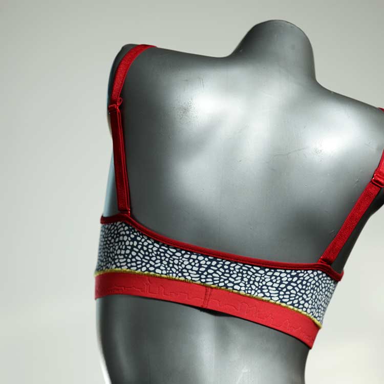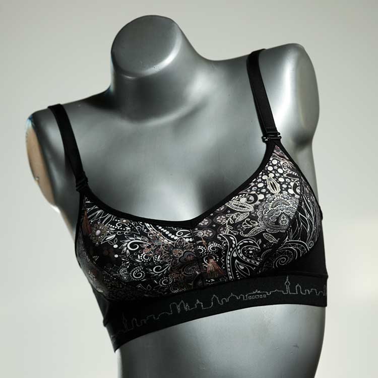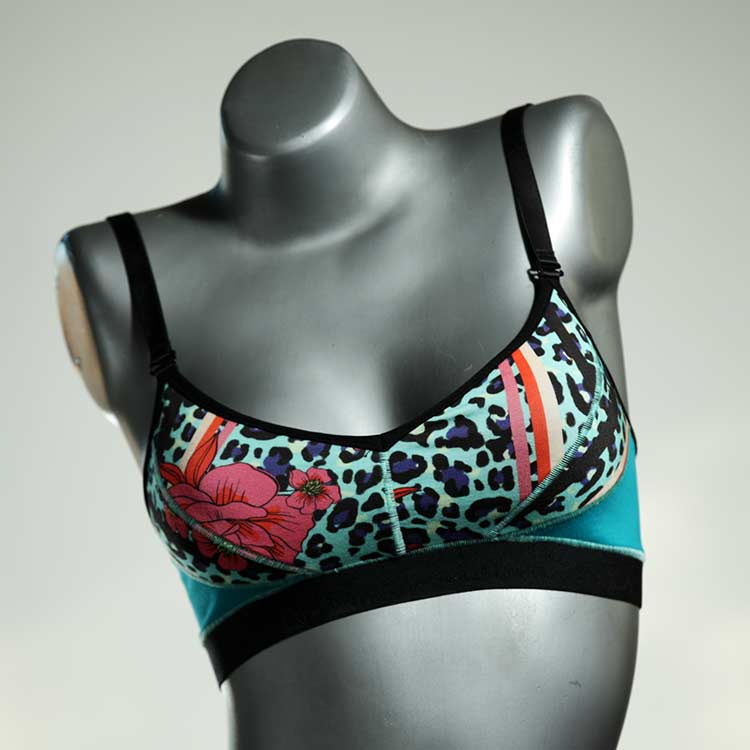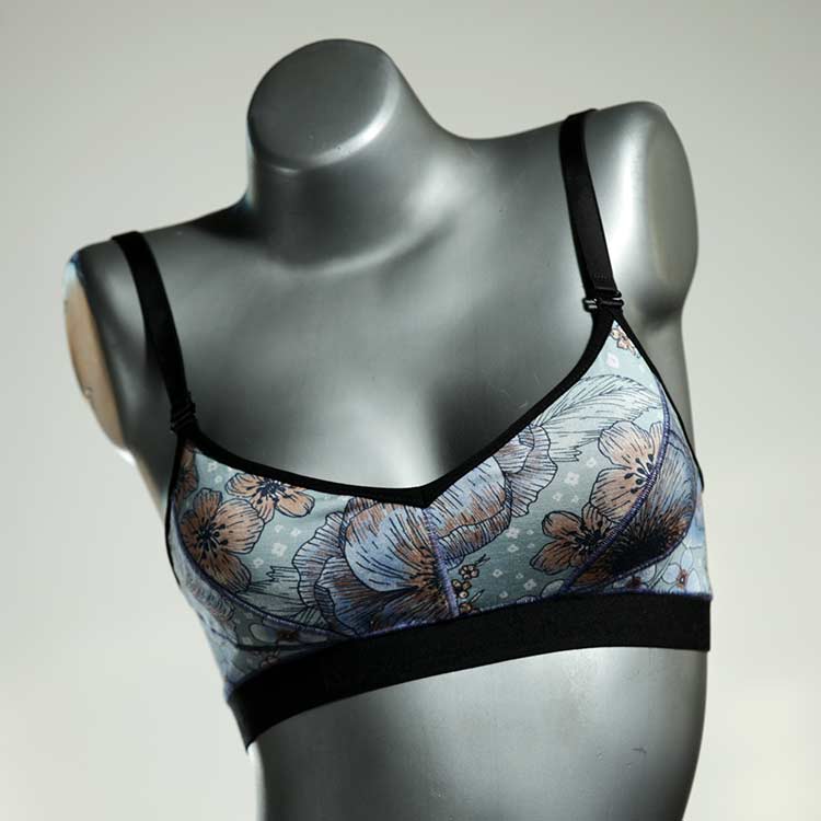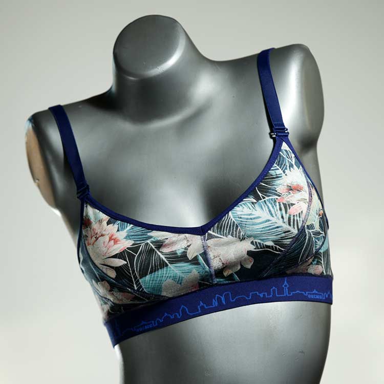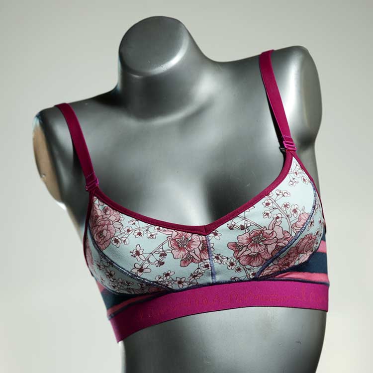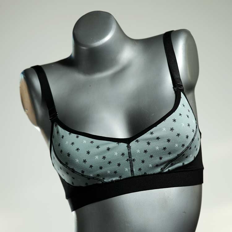 Soutien-gorge moelleux et doux en jersey de coton biologique respirant avec des designs uniques. Une véritable pièce unique issue de la production locale. Sans fil, sans oreiller ni attache, ils sont confortables à porter. Les bretelles ont une largeur de 16 mm, les bonnets sont à double épaisseur et en coton biologique à l'intérieur. Convient également comme soutien-gorge d'allaitement.