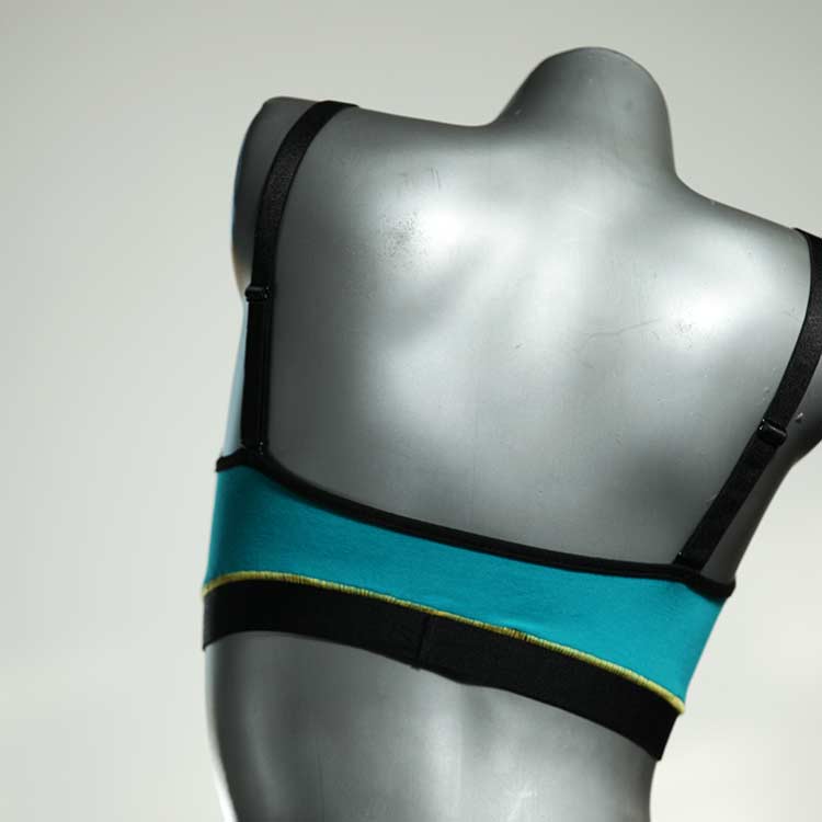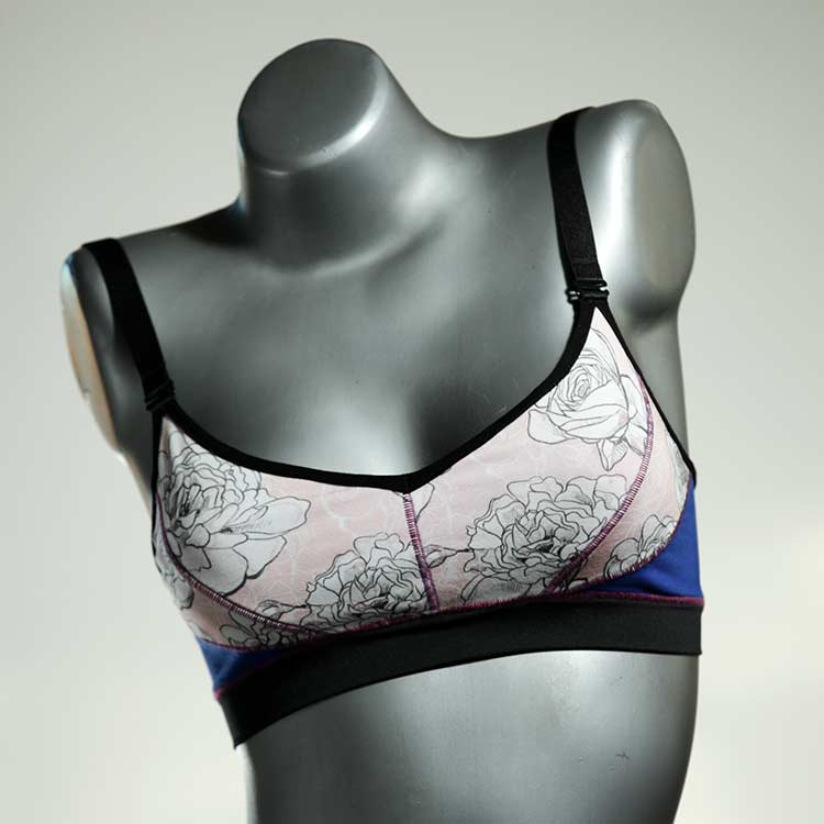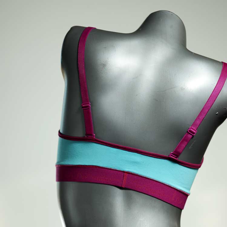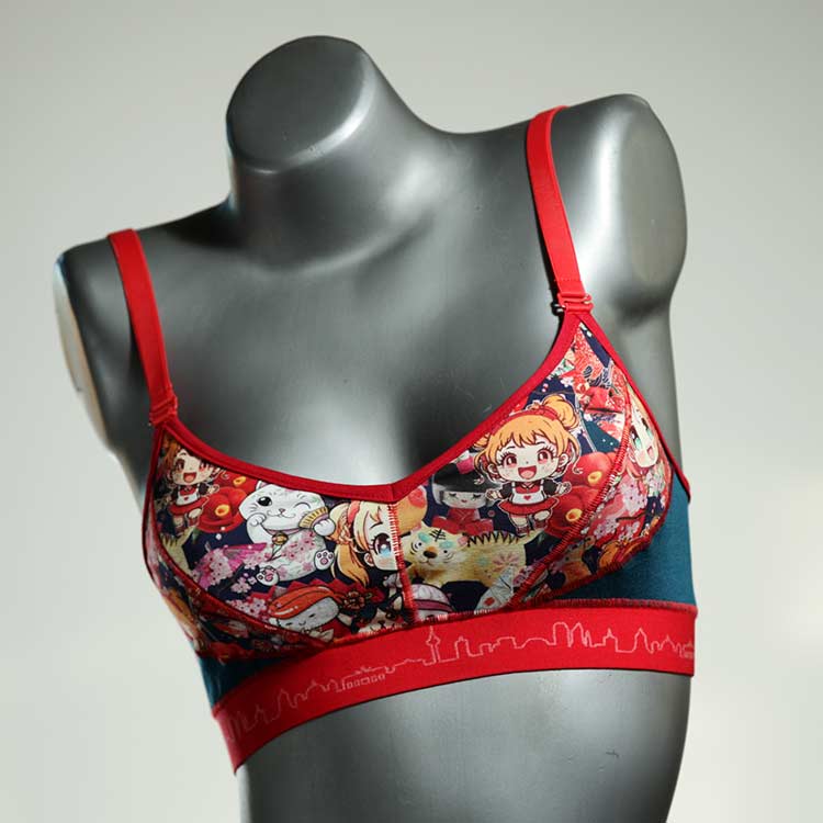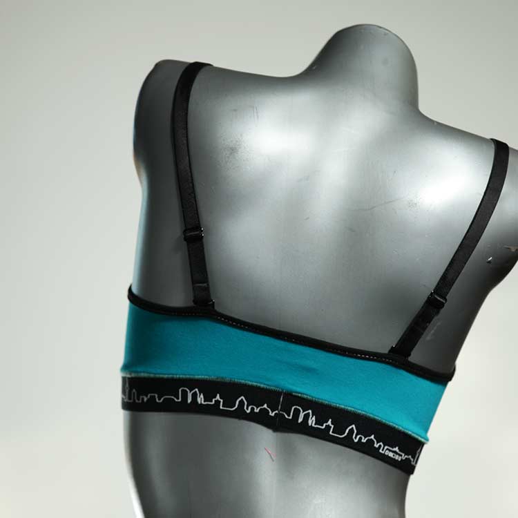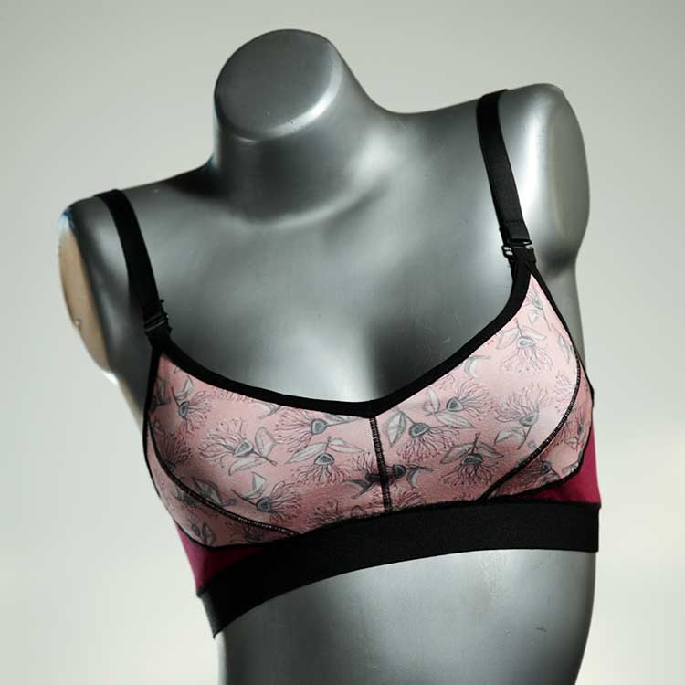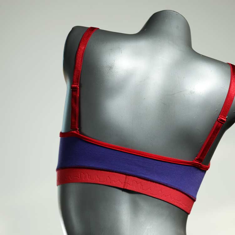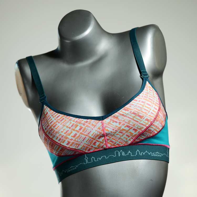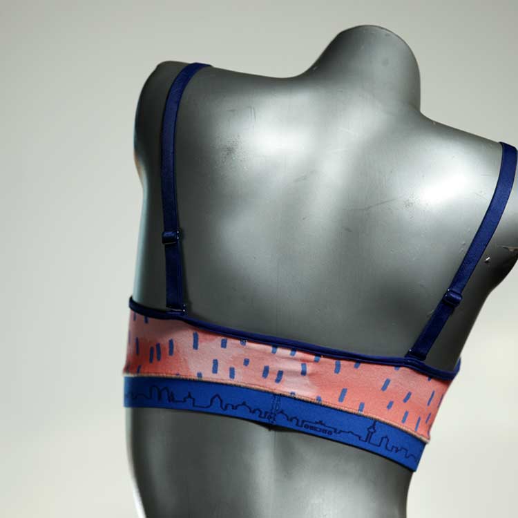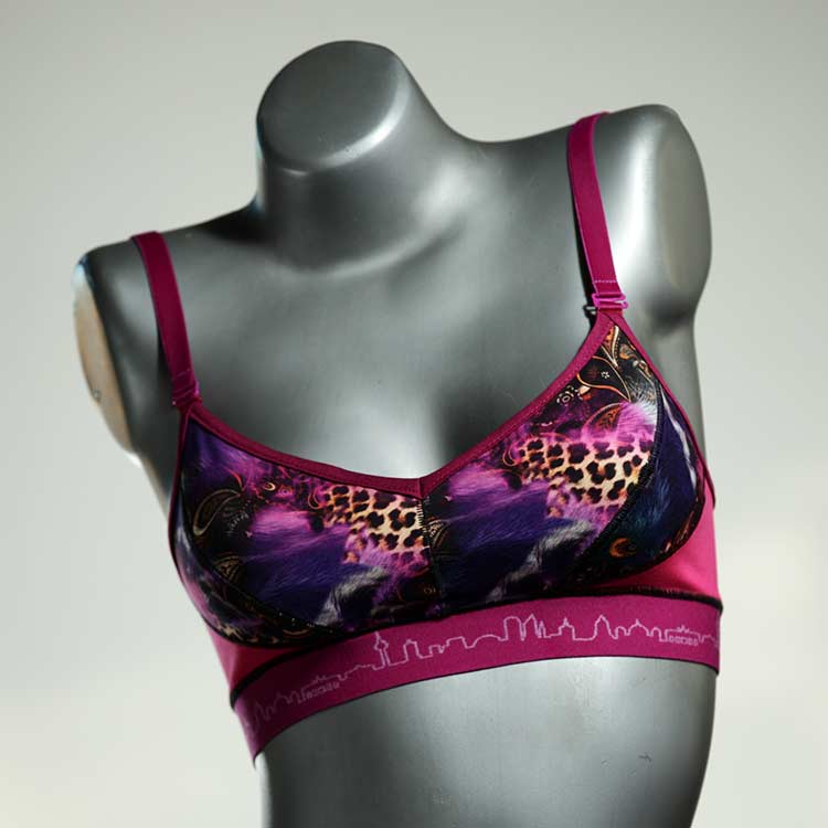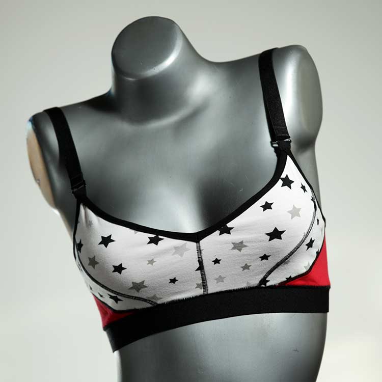 Soutien-gorge moelleux et doux en jersey de coton biologique respirant avec des designs uniques. Une véritable pièce unique issue de la production locale. Sans fil, sans oreiller ni attache, ils sont confortables à porter. Les bretelles ont une largeur de 16 mm, les bonnets sont à double épaisseur et en coton biologique à l'intérieur. Convient également comme soutien-gorge d'allaitement.