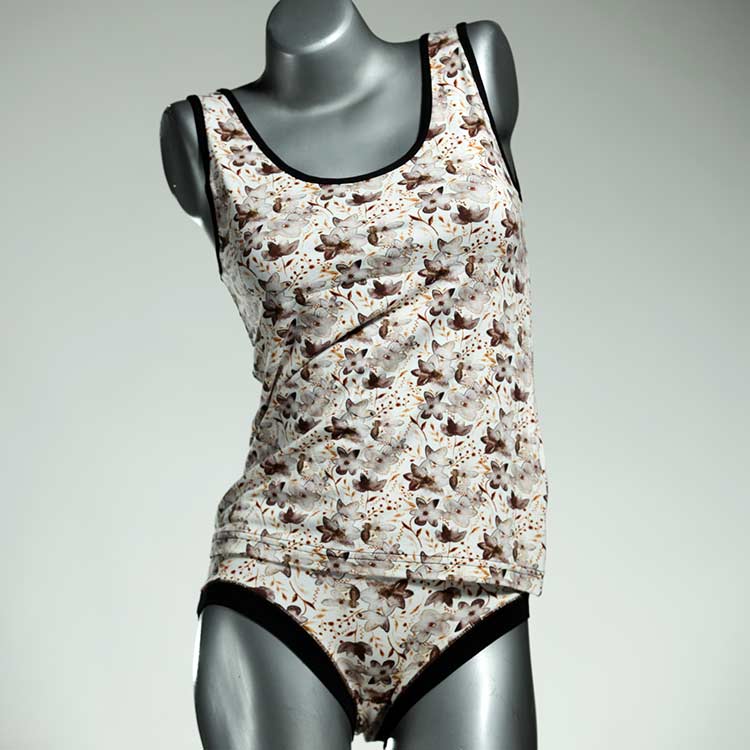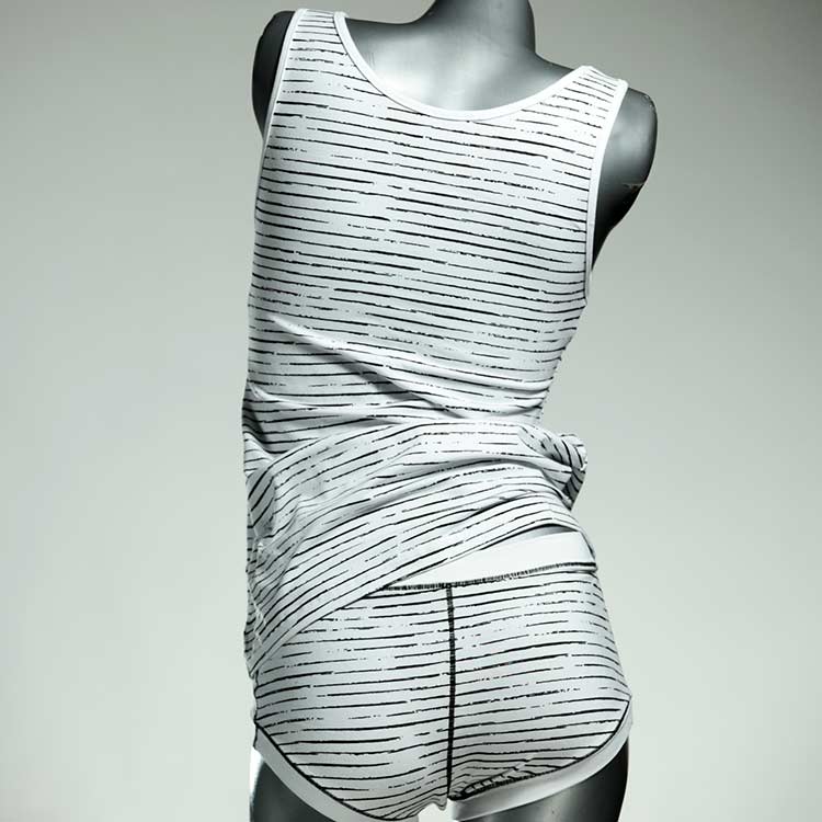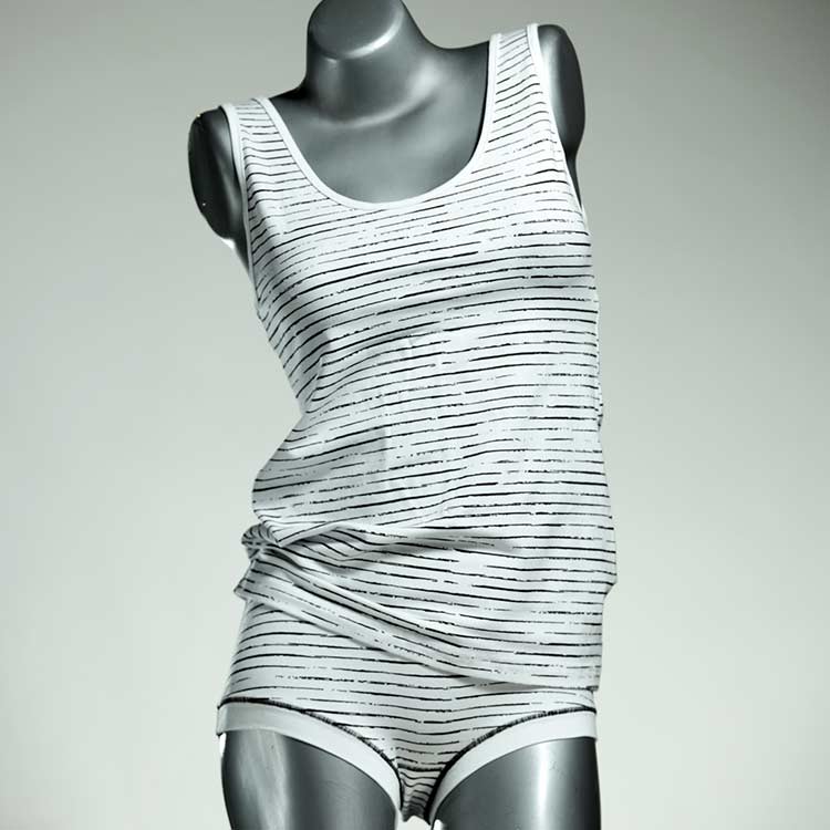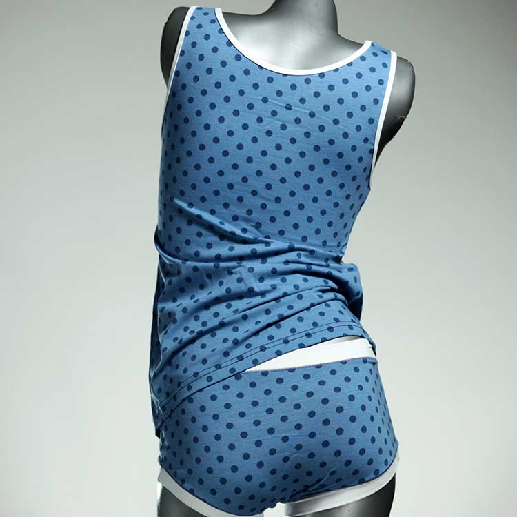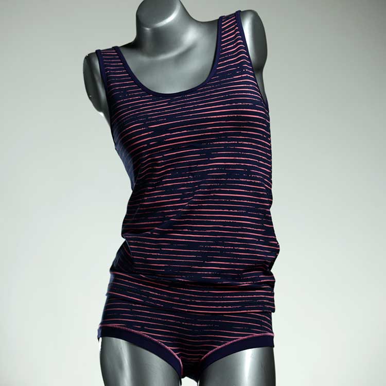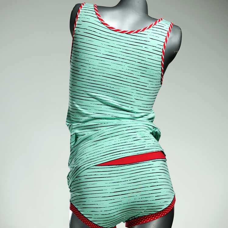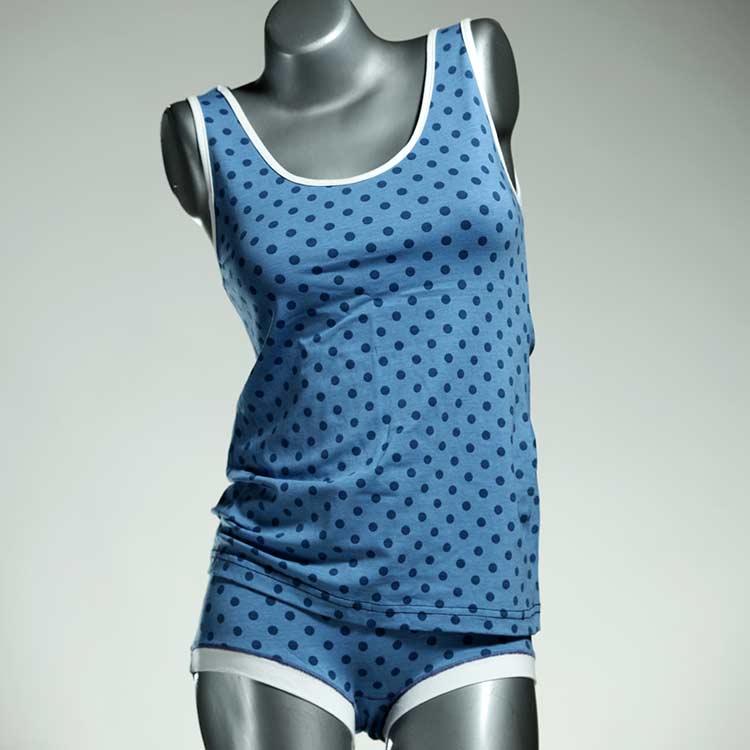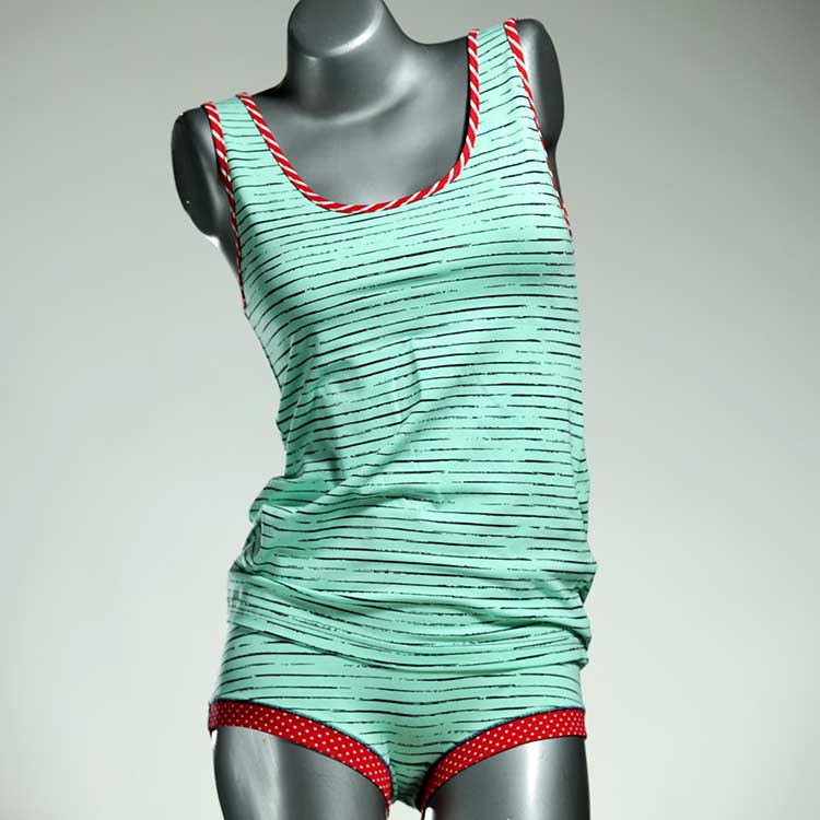 Adorable ensemble de sous-vêtements avec haut en coton doux, respirant et élastique pour le dessous et le dessus. Le haut est coupé à la taille, le décolleté est fermé à mi-hauteur. Avec élastique en dentelle fine ou ourlet en coton sur les bras et l'encolure.