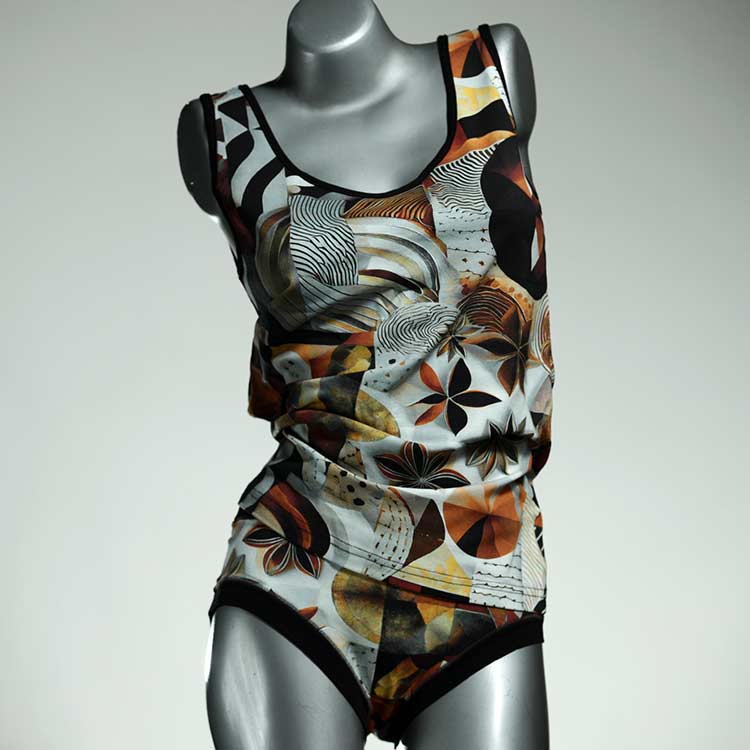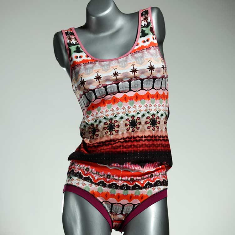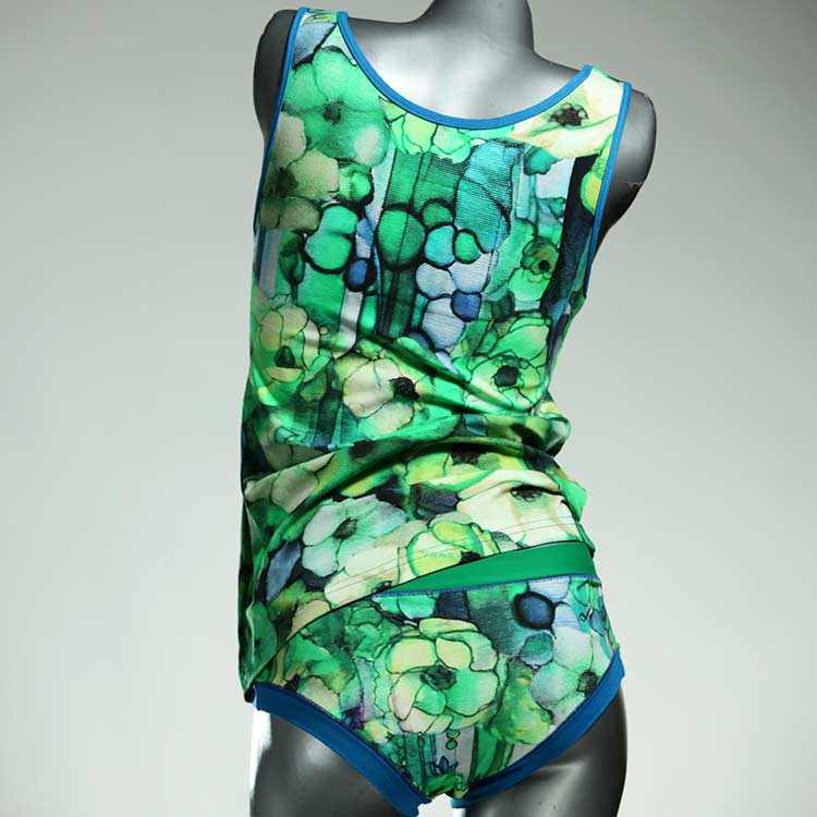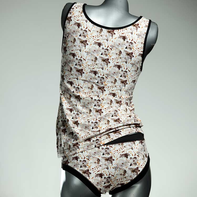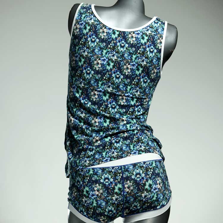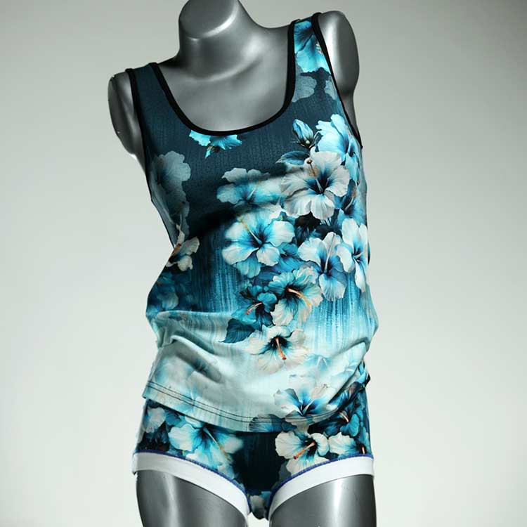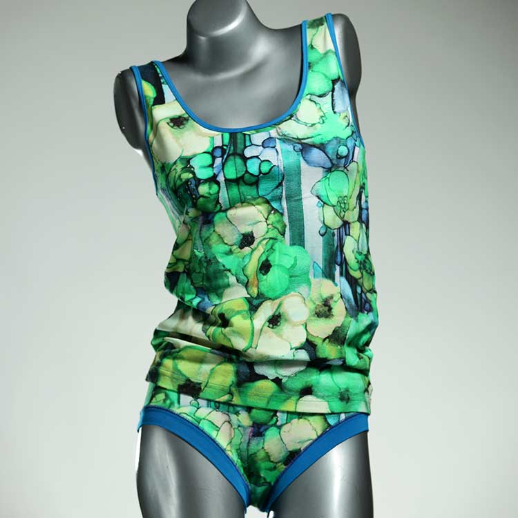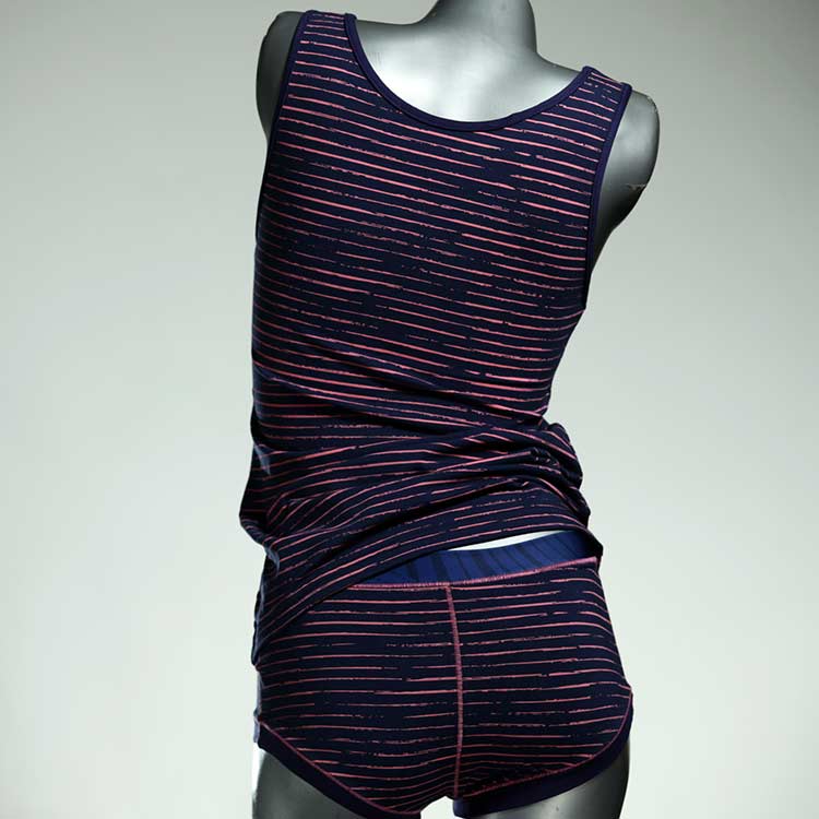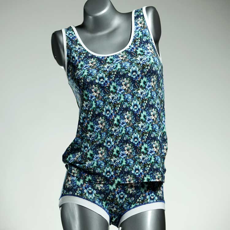 Adorable ensemble de sous-vêtements avec haut en coton doux, respirant et élastique pour le dessous et le dessus. Le haut est coupé à la taille, le décolleté est fermé à mi-hauteur. Avec élastique en dentelle fine ou ourlet en coton sur les bras et l'encolure.