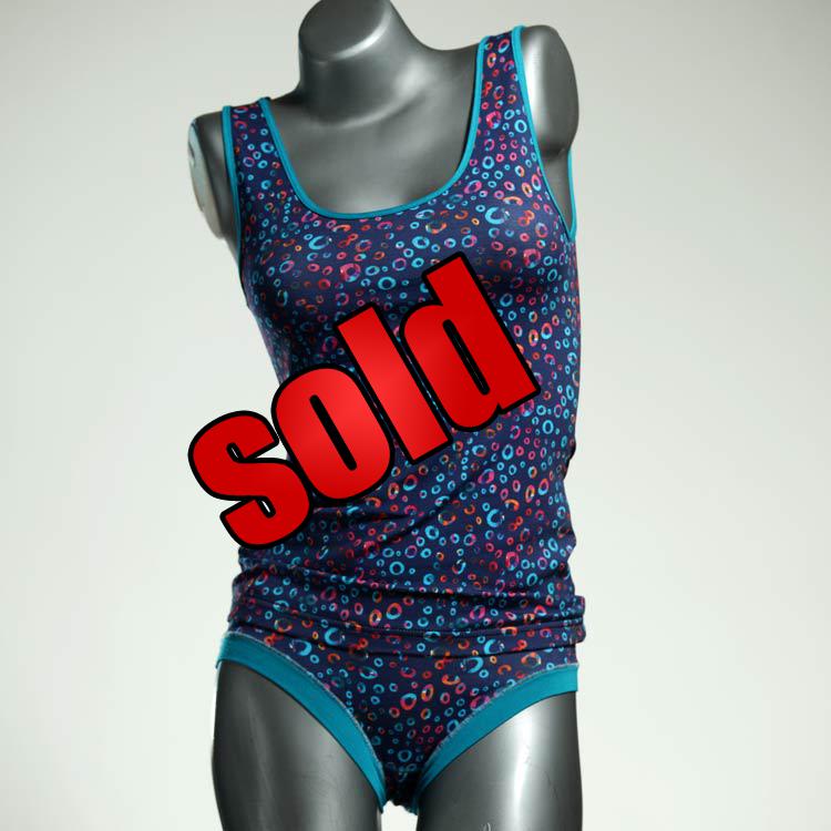Adorable ensemble de sous-vêtements avec haut en coton doux, respirant et élastique pour le dessous et le dessus. Le haut est coupé à la taille, le décolleté est fermé à mi-hauteur. Avec élastique en dentelle fine ou ourlet en coton sur les bras et l'encolure.