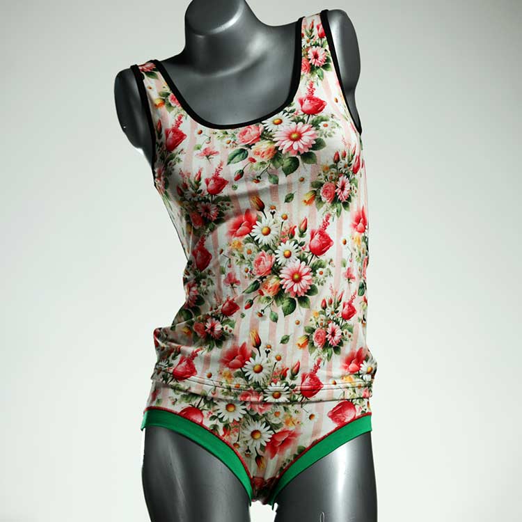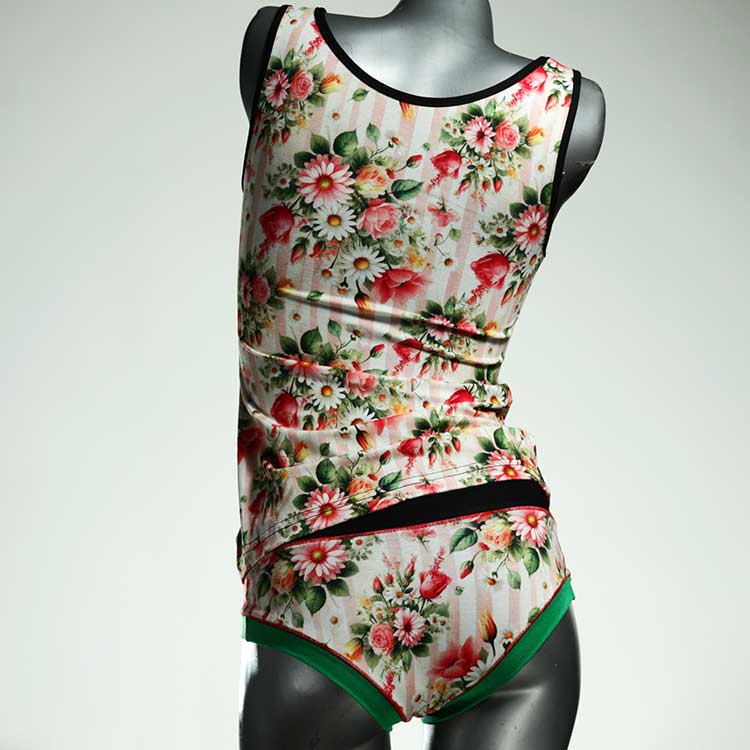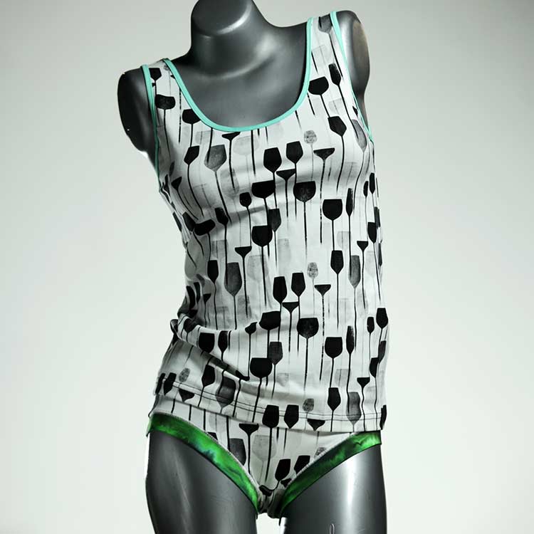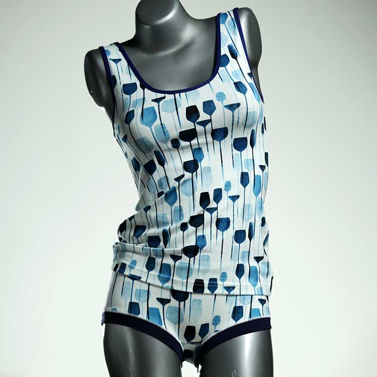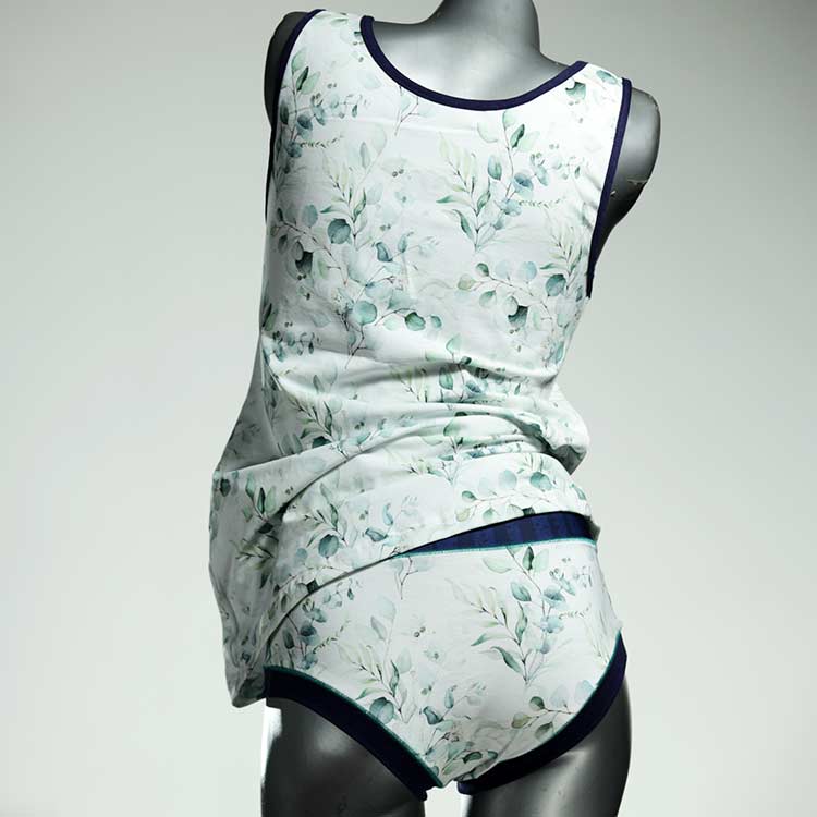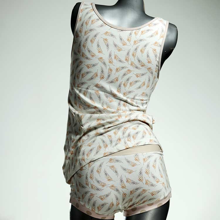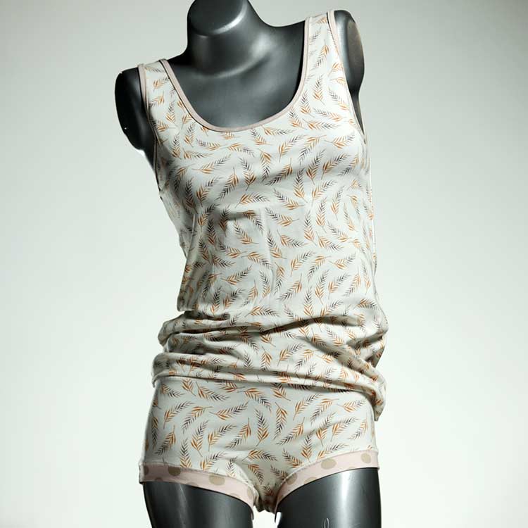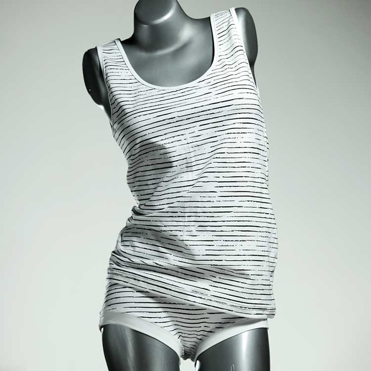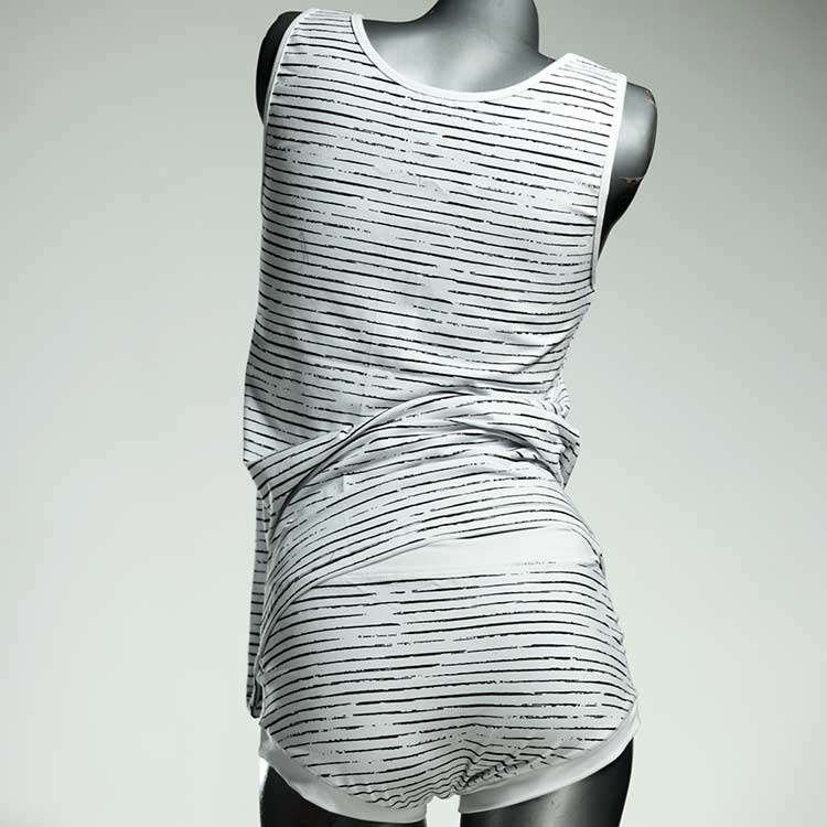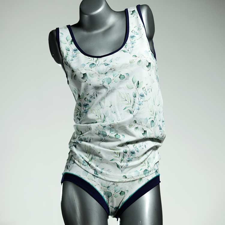 Adorabile completo di biancheria intima con parte superiore in morbido cotone elastico traspirante per sotto e sopra. Il top è tagliato in vita, lo scollo è chiuso a metà. Con fine pizzo elastico o orlo in cotone sulle braccia e sullo scollo.