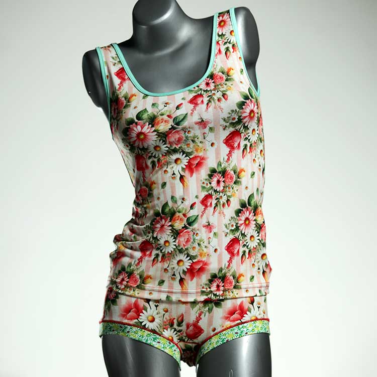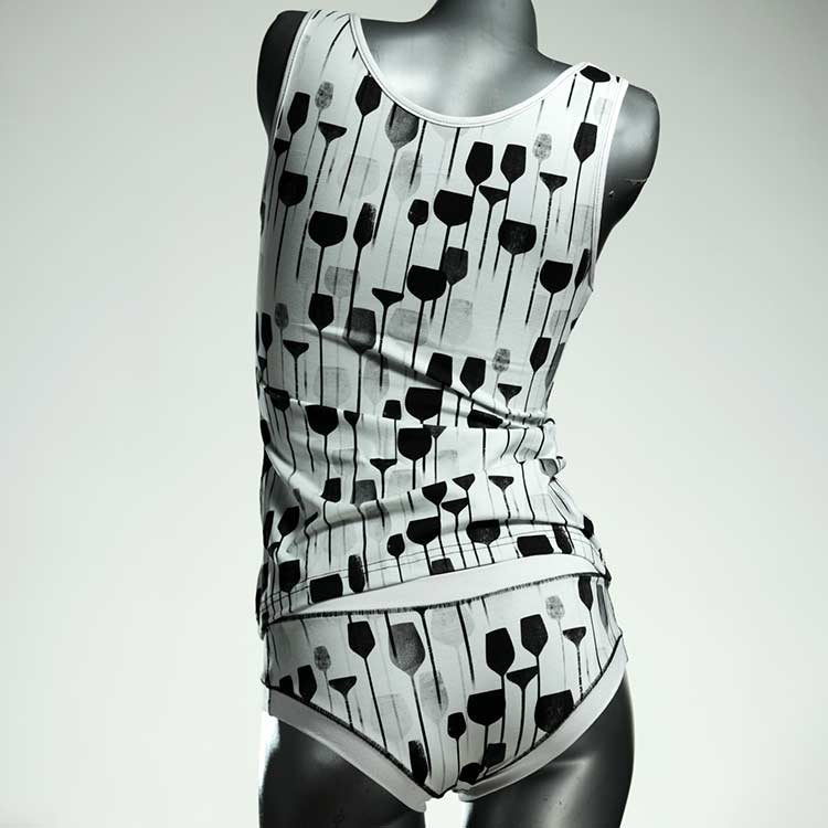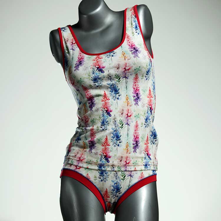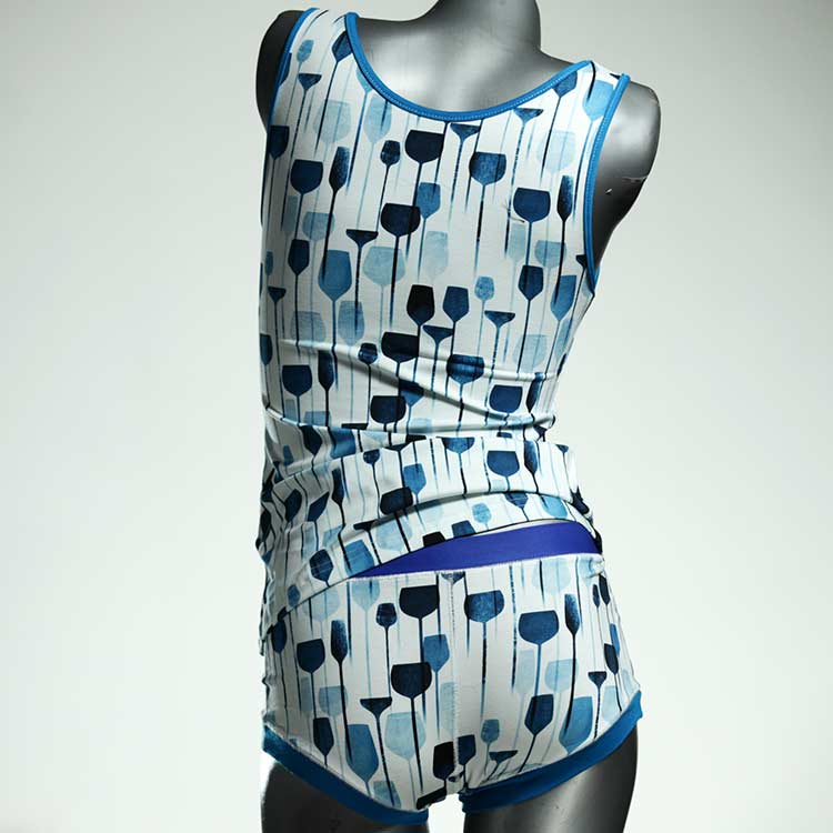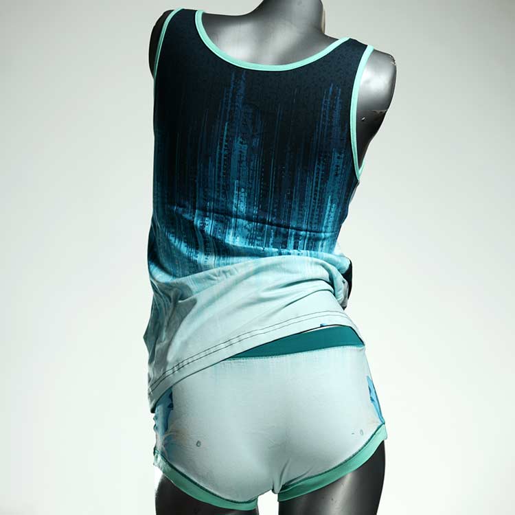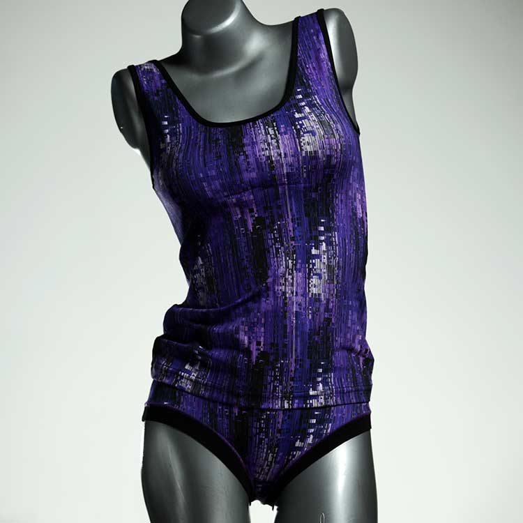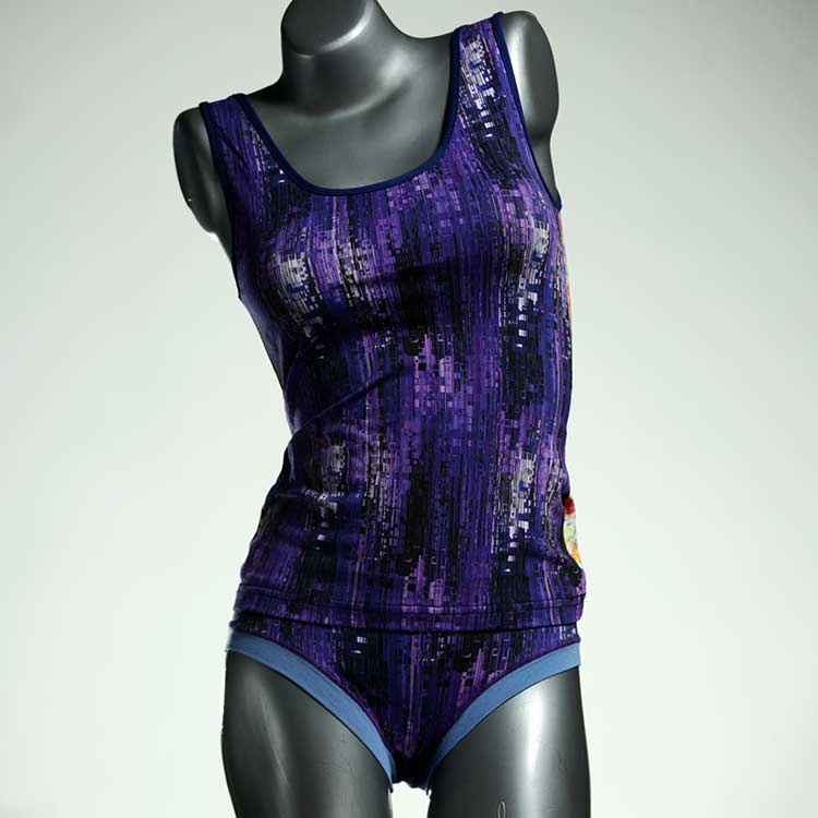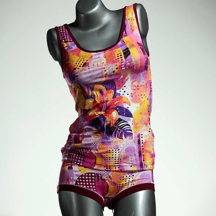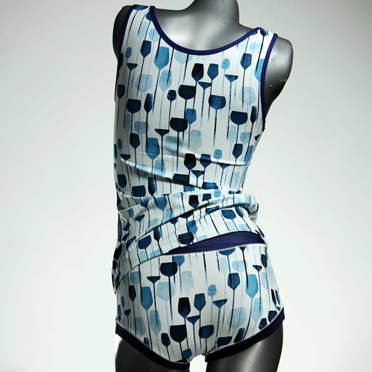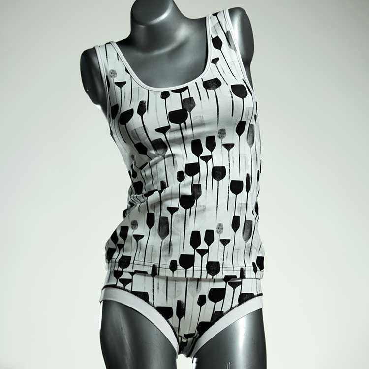 Adorabile completo di biancheria intima con parte superiore in morbido cotone elastico traspirante per sotto e sopra. Il top è tagliato in vita, lo scollo è chiuso a metà. Con fine pizzo elastico o orlo in cotone sulle braccia e sullo scollo.