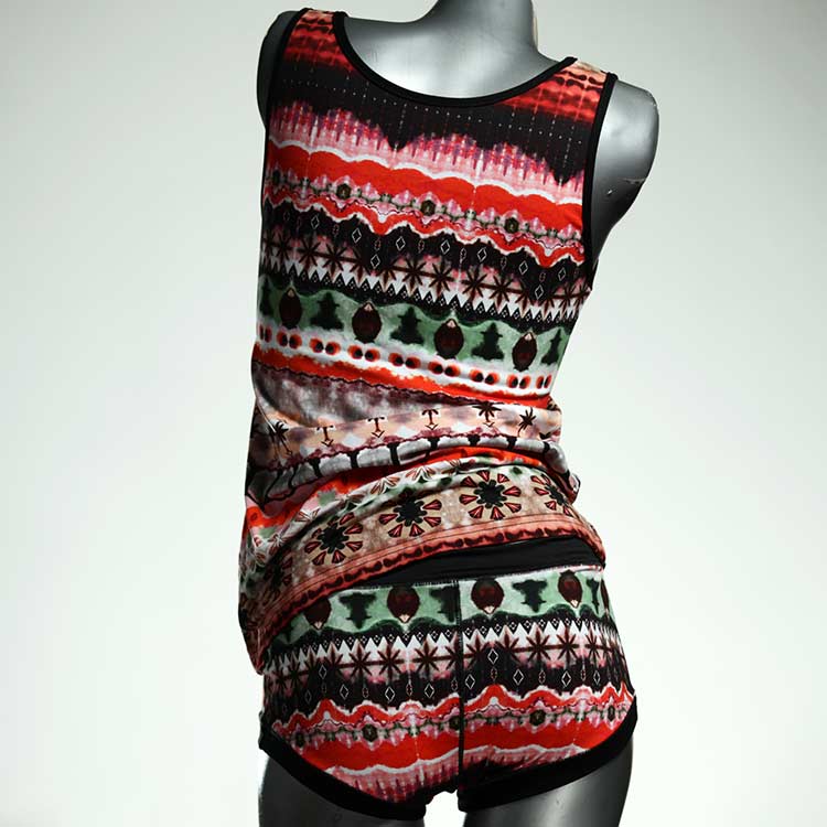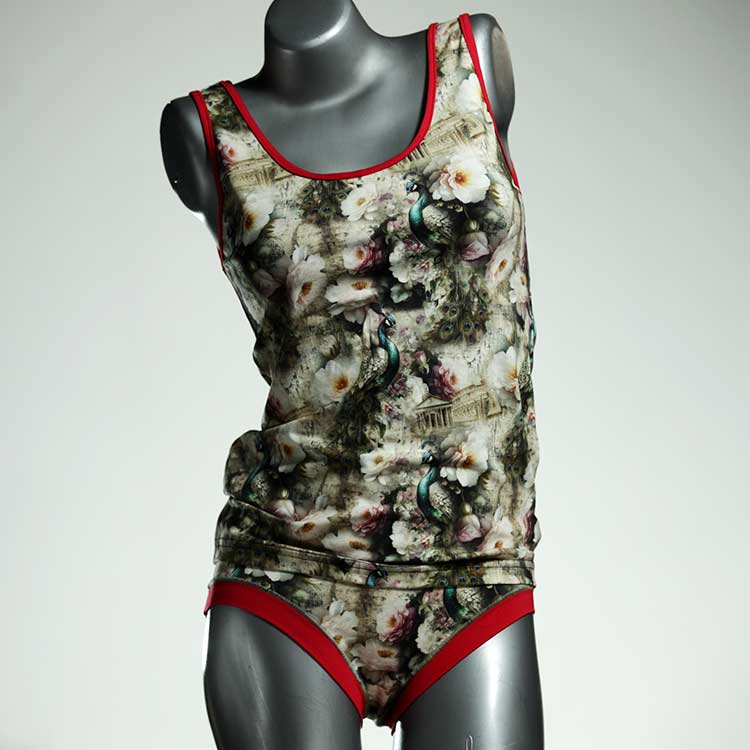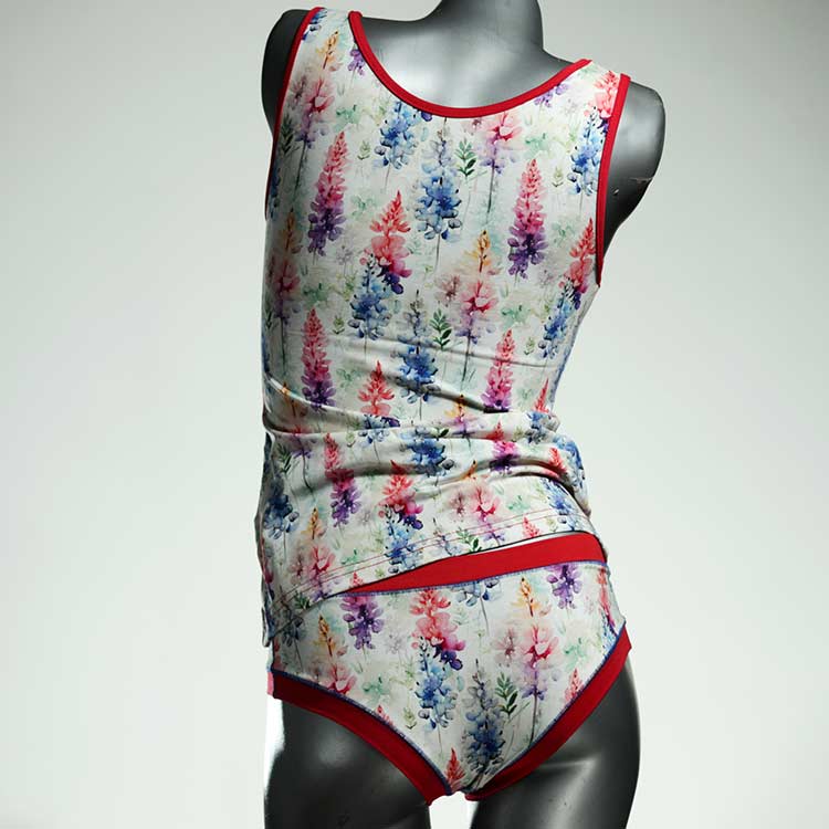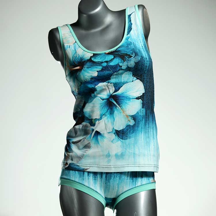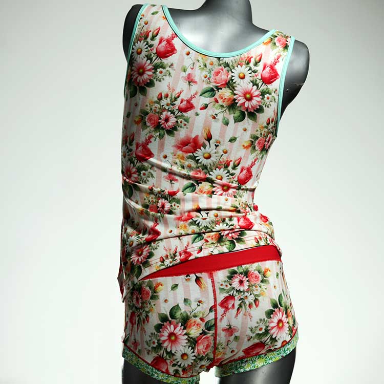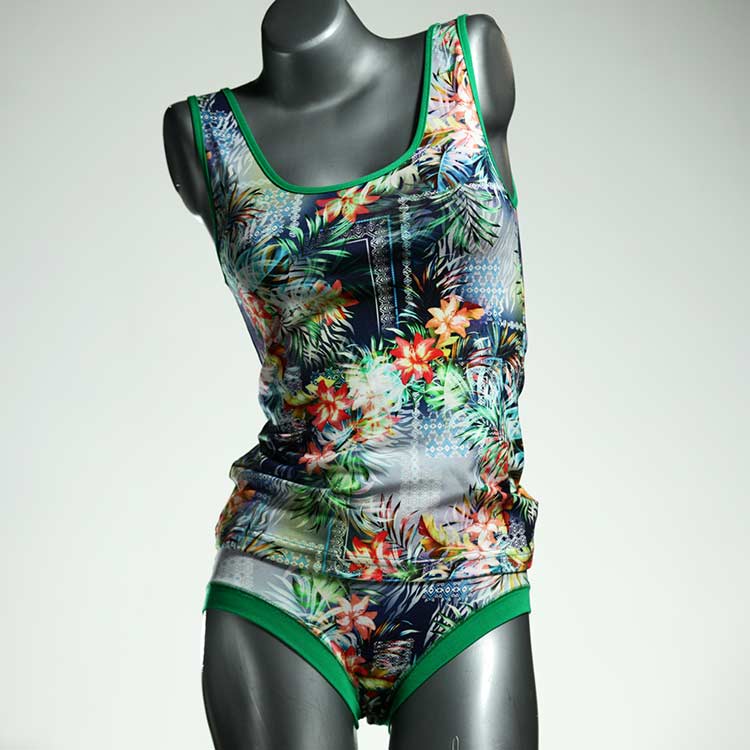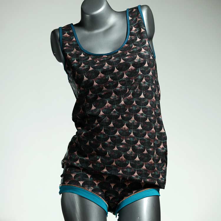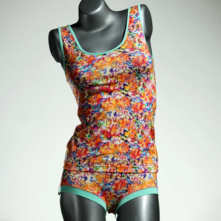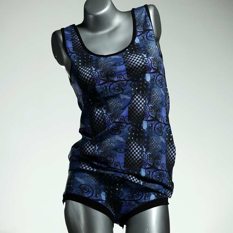 Adorabile completo di biancheria intima con parte superiore in morbido cotone elastico traspirante per sotto e sopra. Il top è tagliato in vita, lo scollo è chiuso a metà. Con fine pizzo elastico o orlo in cotone sulle braccia e sullo scollo.