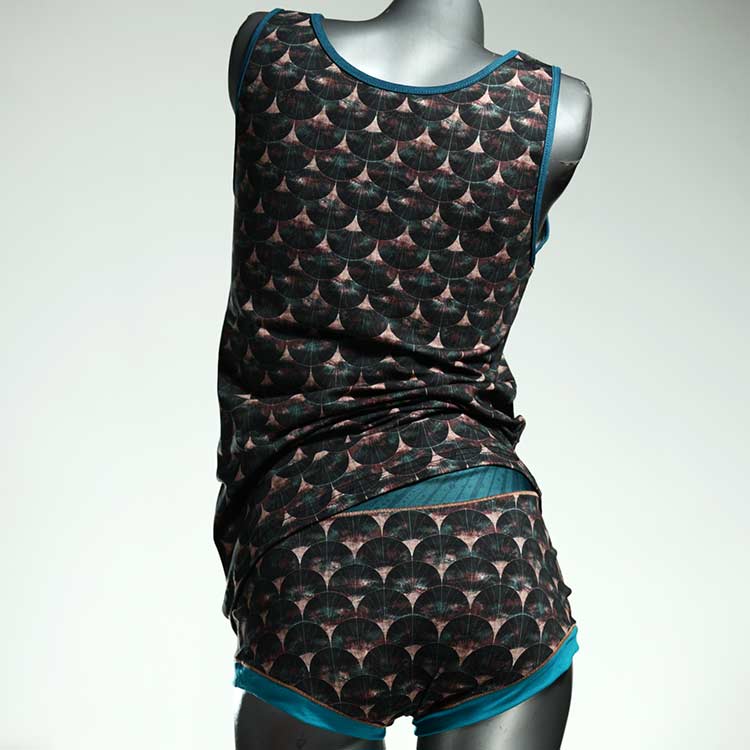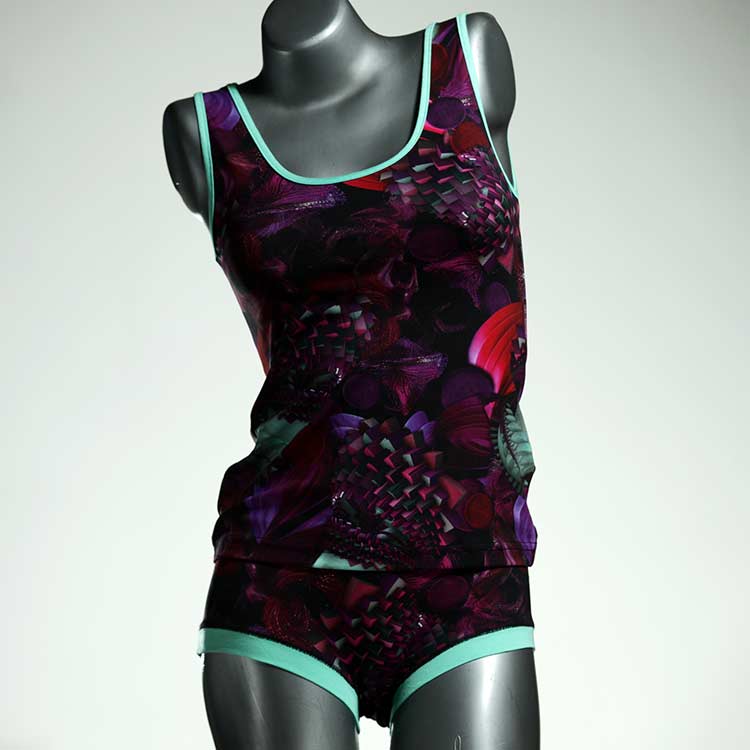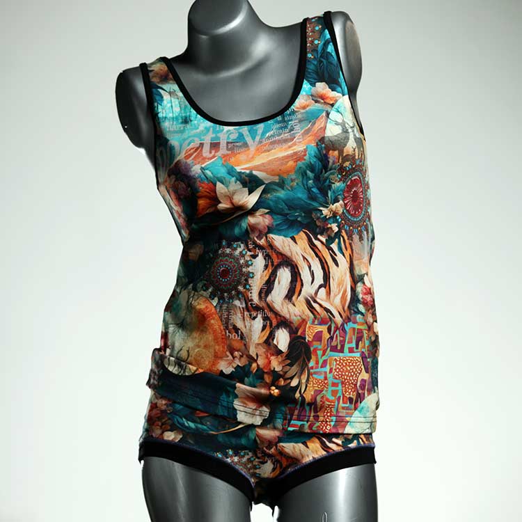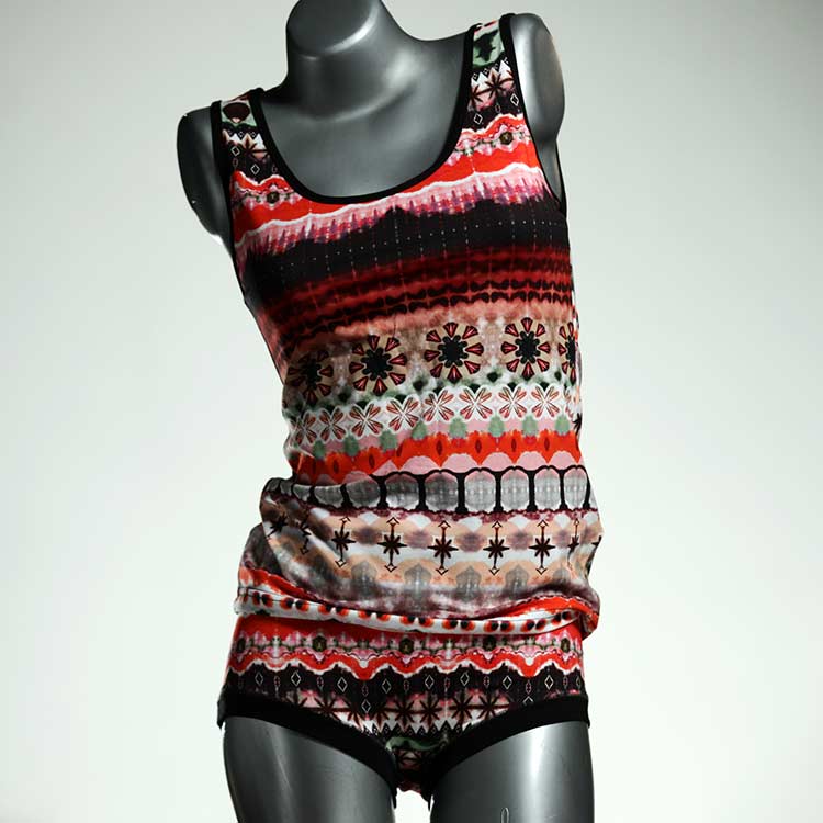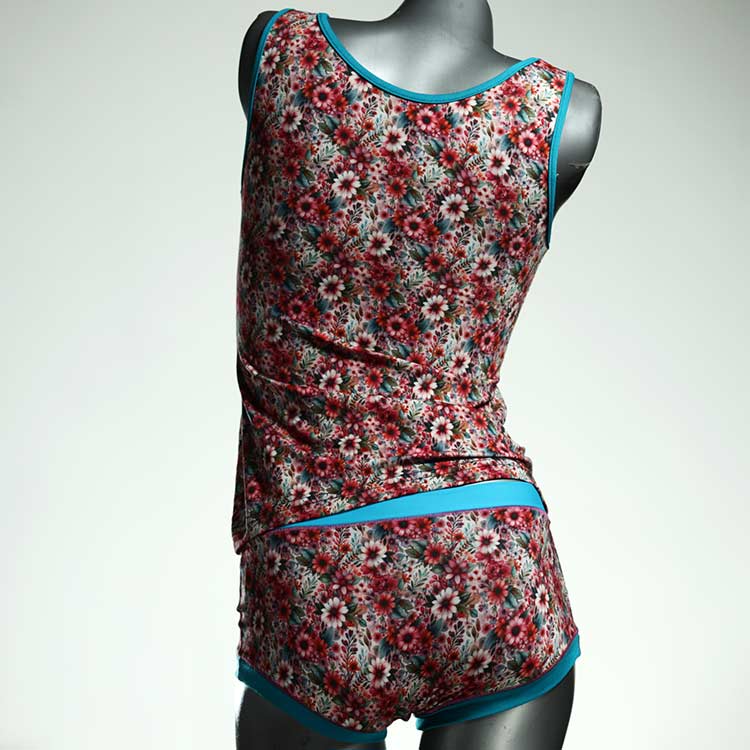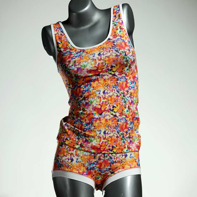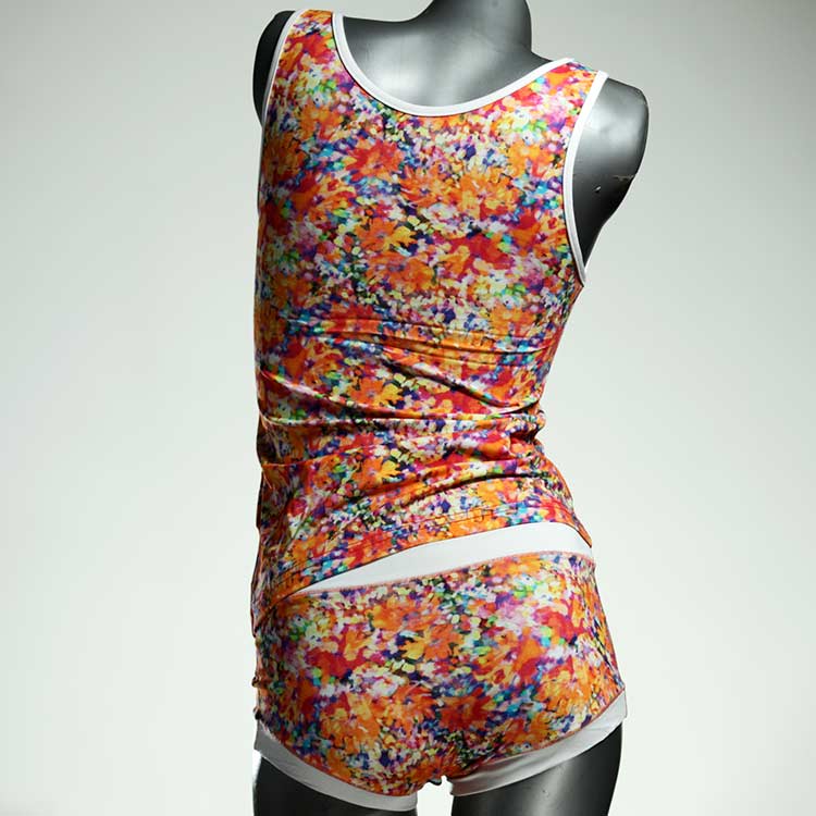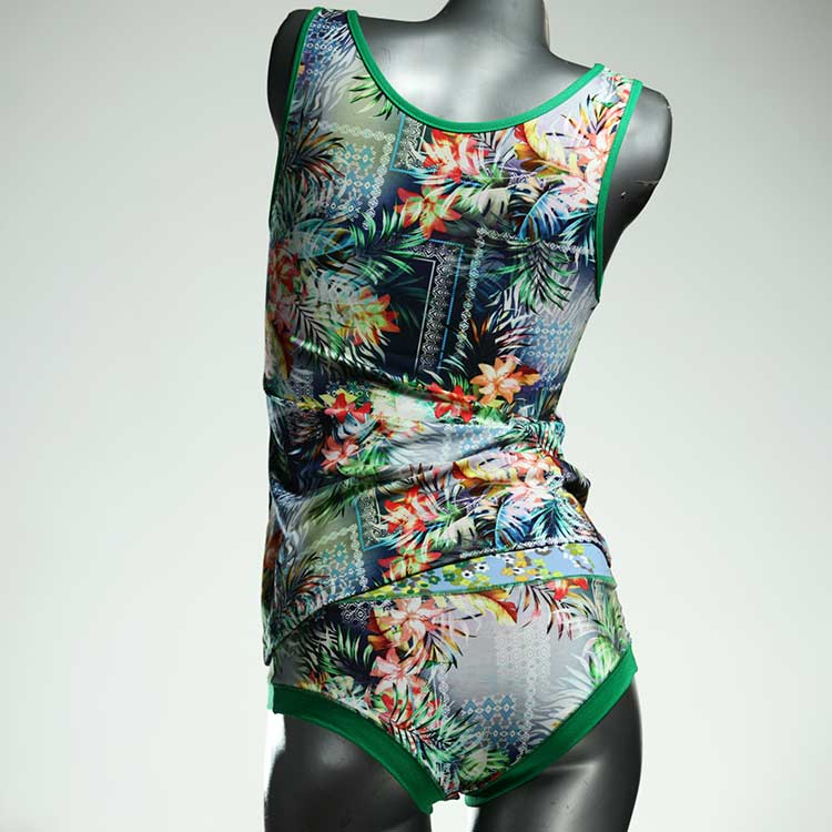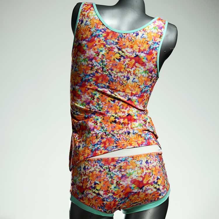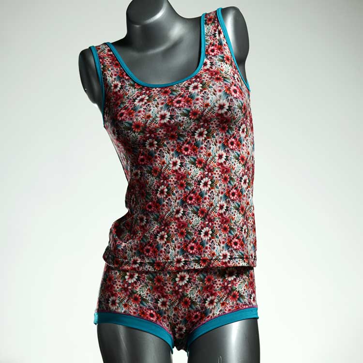 Adorabile completo di biancheria intima con parte superiore in morbido cotone elastico traspirante per sotto e sopra. Il top è tagliato in vita, lo scollo è chiuso a metà. Con fine pizzo elastico o orlo in cotone sulle braccia e sullo scollo.