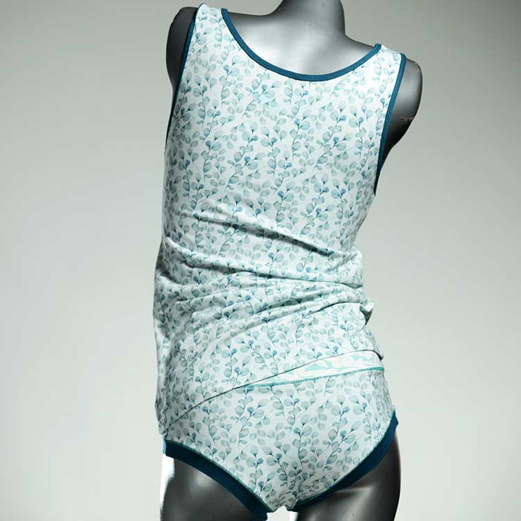 Adorabile completo di biancheria intima con parte superiore in morbido cotone elastico traspirante per sotto e sopra. Il top è tagliato in vita, lo scollo è chiuso a metà. Con fine pizzo elastico o orlo in cotone sulle braccia e sullo scollo.
