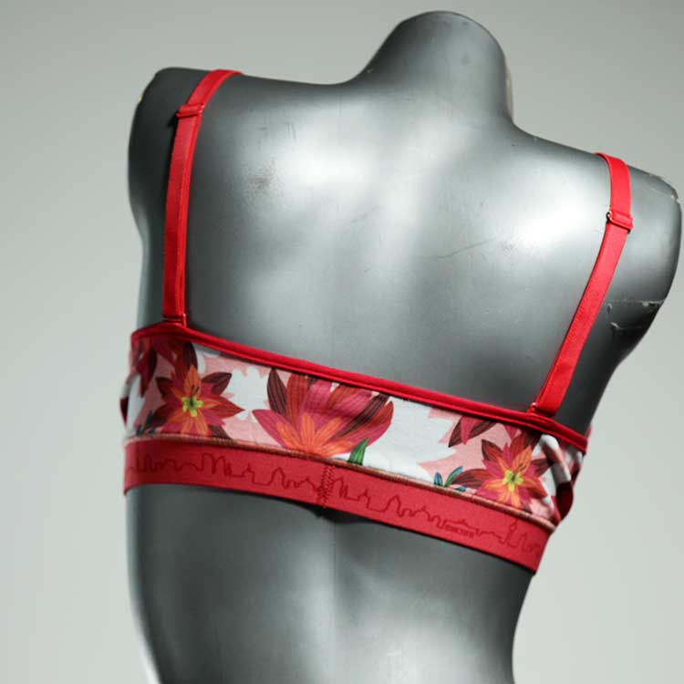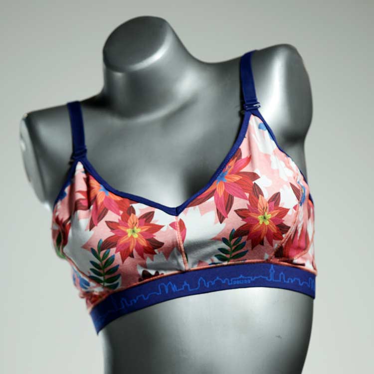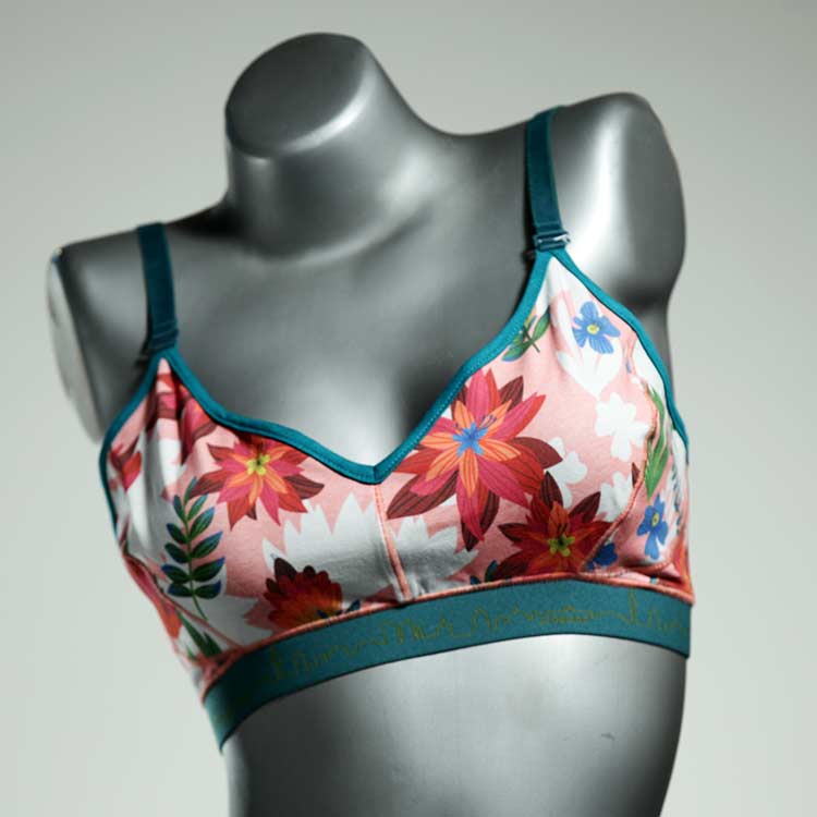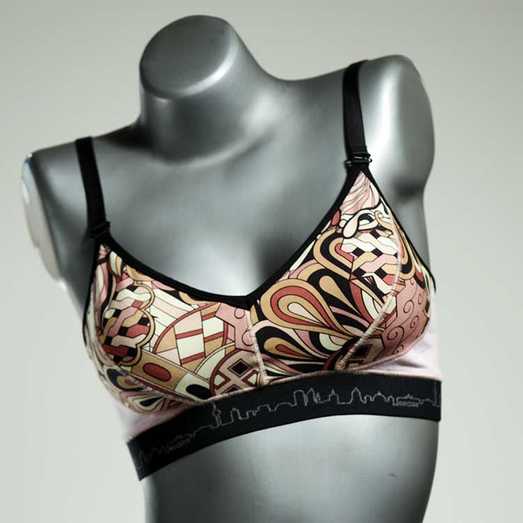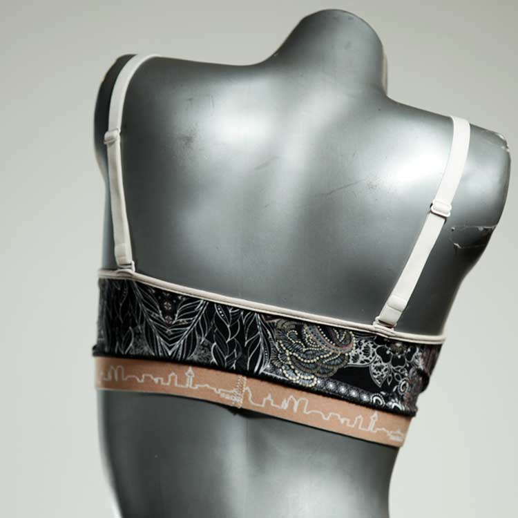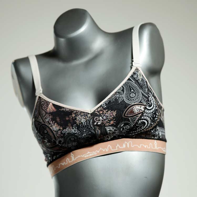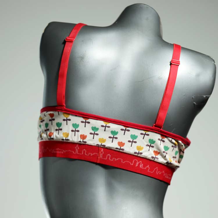 Reggiseno morbido e coccoloso realizzato in jersey di cotone biologico traspirante con design unici. Un vero pezzo unico di produzione locale. Senza fili, senza cuscino o chiusura, sono comodi da indossare. Le spalline sono larghe 16 mm, le coppe sono a doppio strato e realizzate in cotone organico all'interno. Adatto anche come reggiseni per l'allattamento.