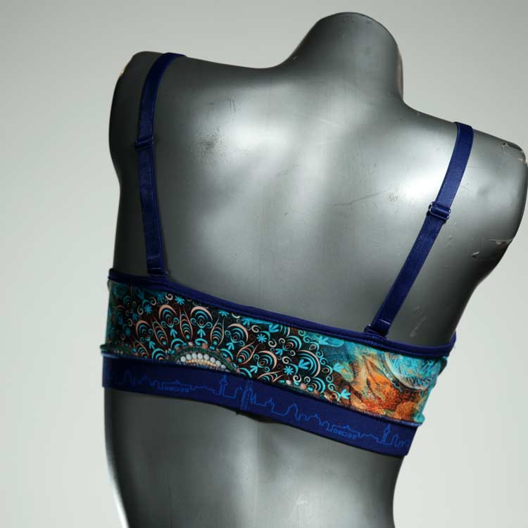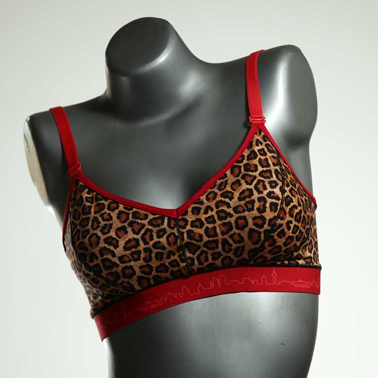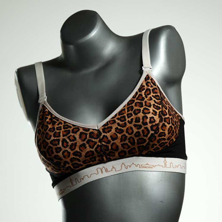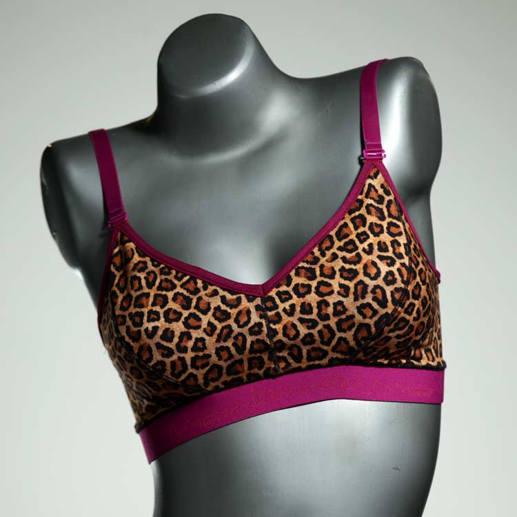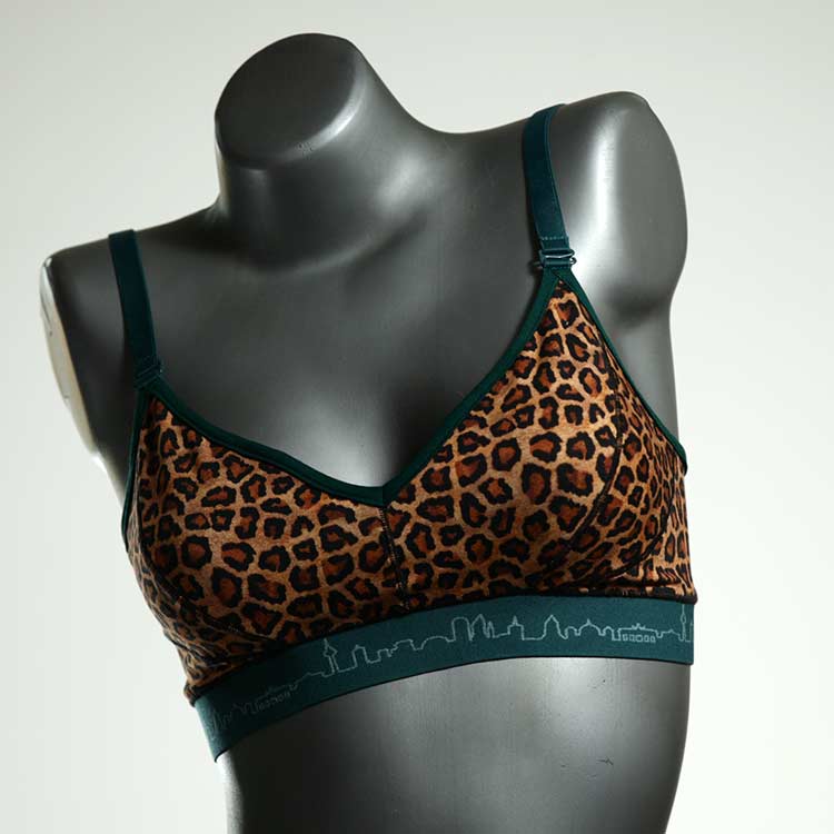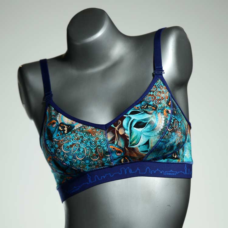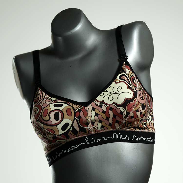 Reggiseno morbido e coccoloso realizzato in jersey di cotone biologico traspirante con design unici. Un vero pezzo unico di produzione locale. Senza fili, senza cuscino o chiusura, sono comodi da indossare. Le spalline sono larghe 16 mm, le coppe sono a doppio strato e realizzate in cotone organico all'interno. Adatto anche come reggiseni per l'allattamento.