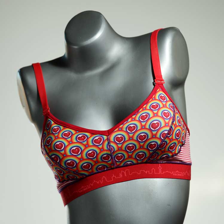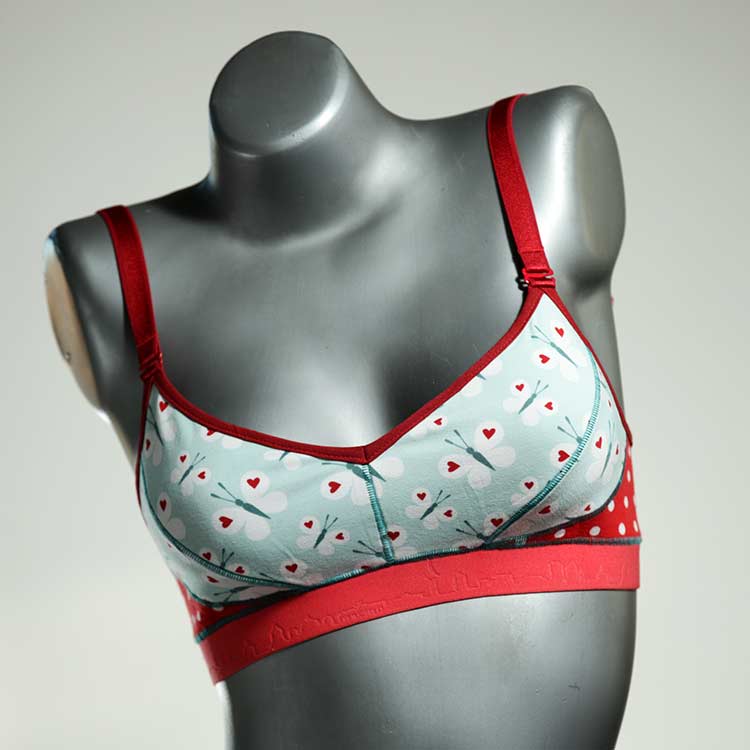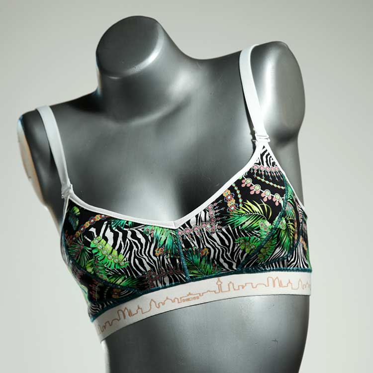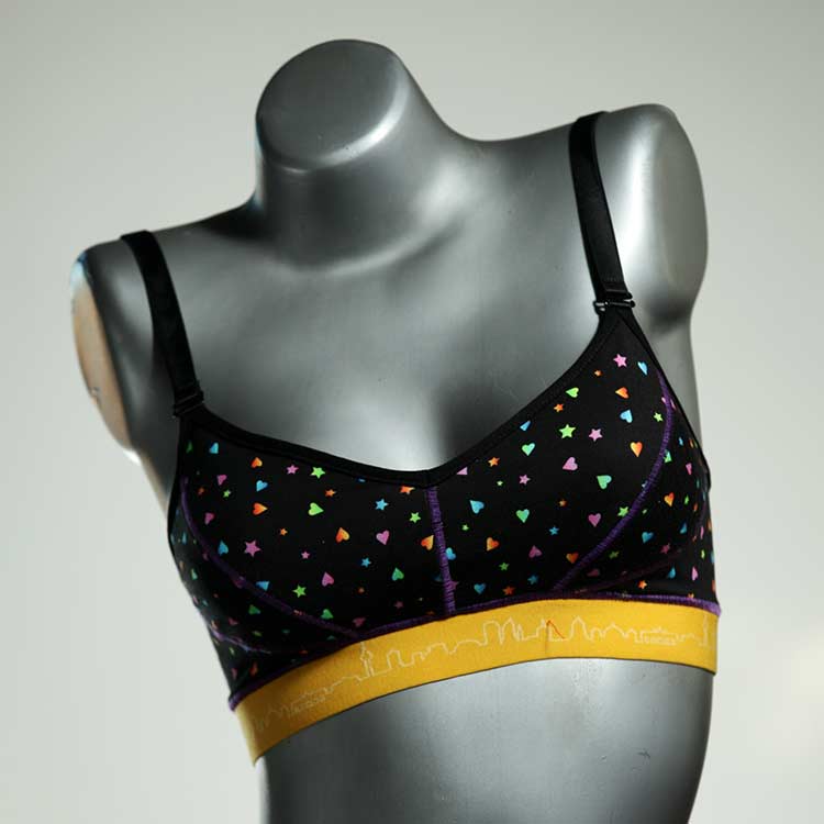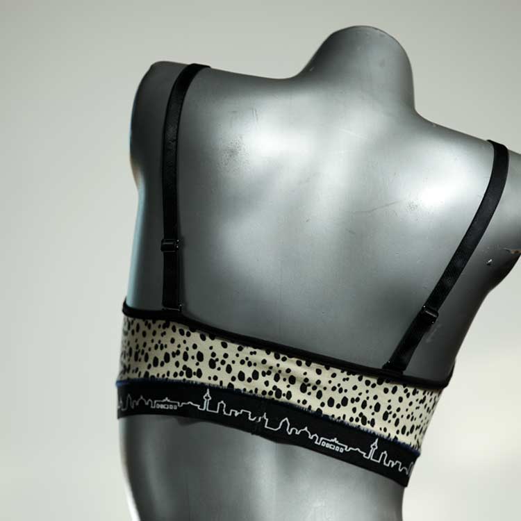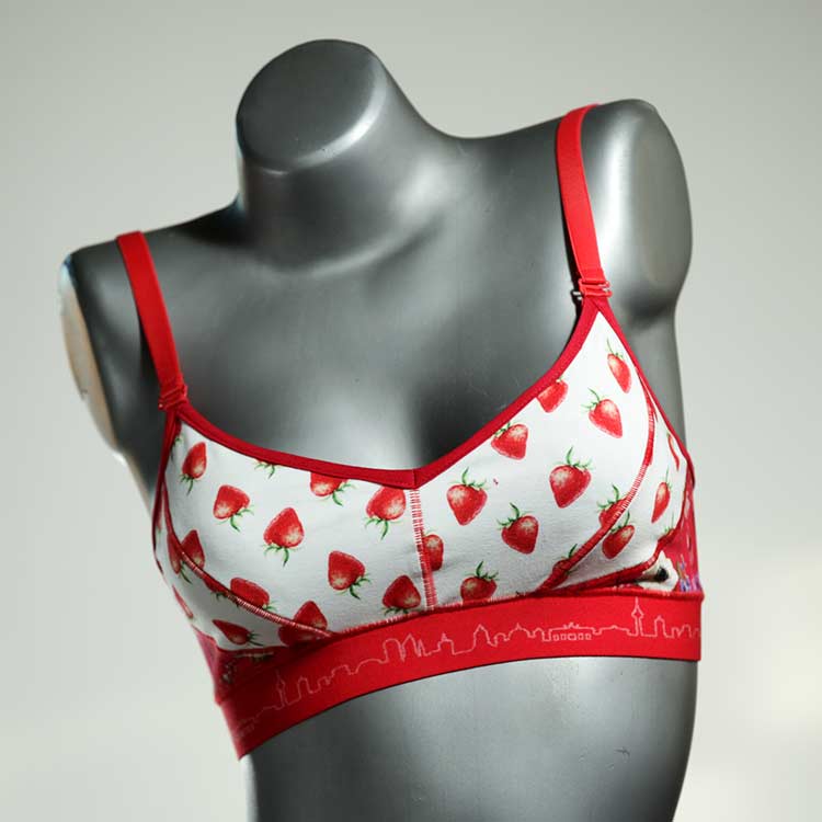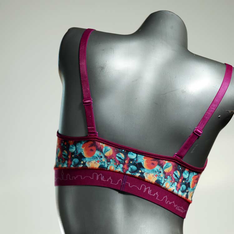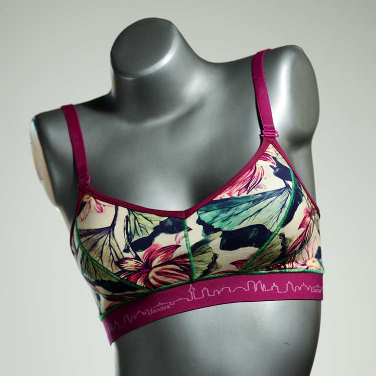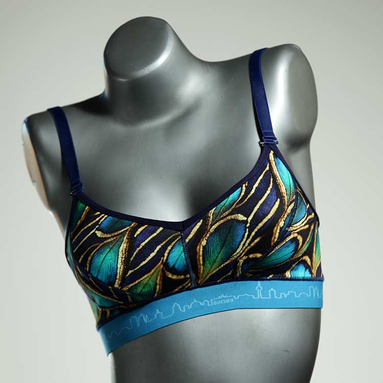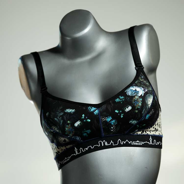 Reggiseni morbidi e coccolosi realizzati in jersey di cotone traspirante con design unici. Veri pezzi unici che abbiamo disegnato secondo i vostri desideri. Senza fili, senza cuscino o chiusura, sono comodi da indossare e si adattano perfettamente al tuo corpo. Le spalline sono larghe 16 mm, le coppe sono a doppio strato e realizzate in cotone organico all'interno. I reggiseni di Berlin Underwear non sono principalmente sexy, dovrebbero essere comodi. Sono adatti anche come reggiseni per l'allattamento.
