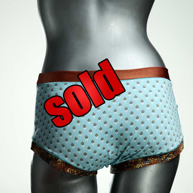 Hotpants zijn onze meest populaire producten, direct na slipjes. Echte one-offs, handgemaakt, made in Berlin. Zijn relatief wijd uitgesneden en gemaakt van zachte, elastische en huidvriendelijke katoenen jersey zonder vervelende rubbers. Ze bedekken de bodem volledig en komen nergens vast te zitten.
