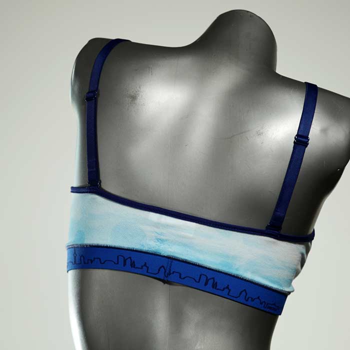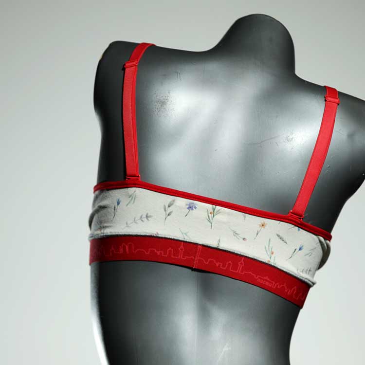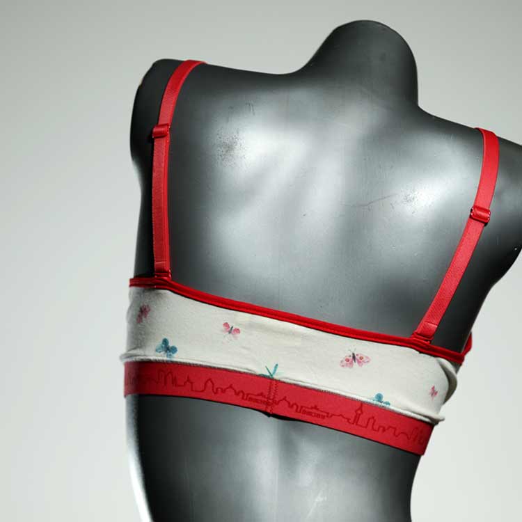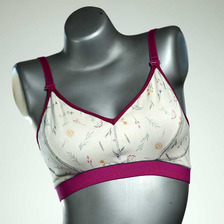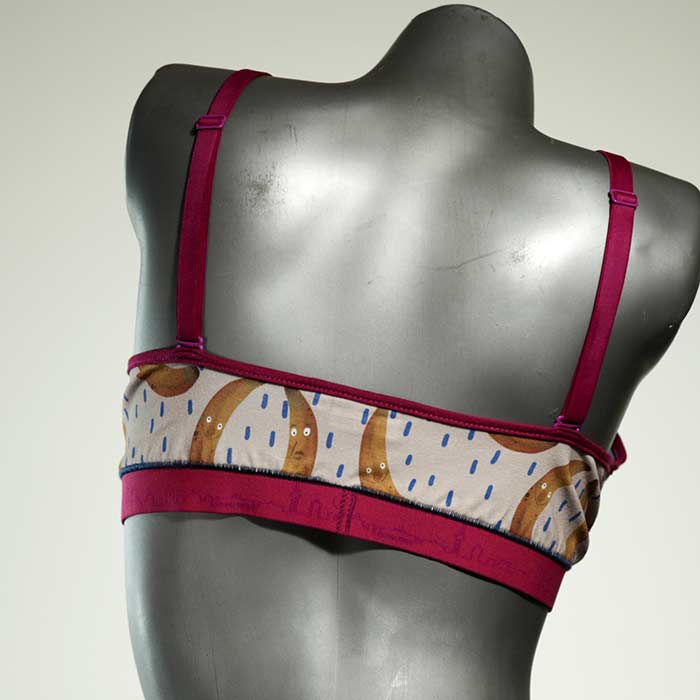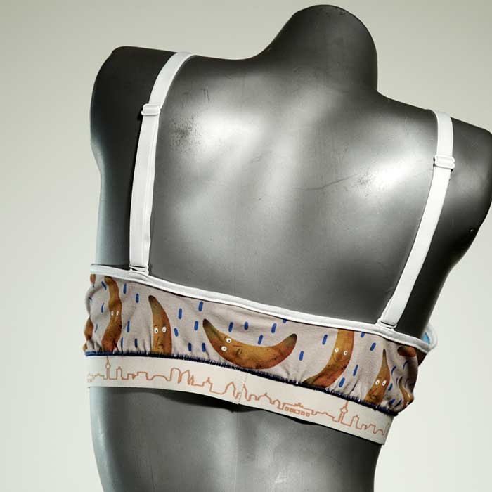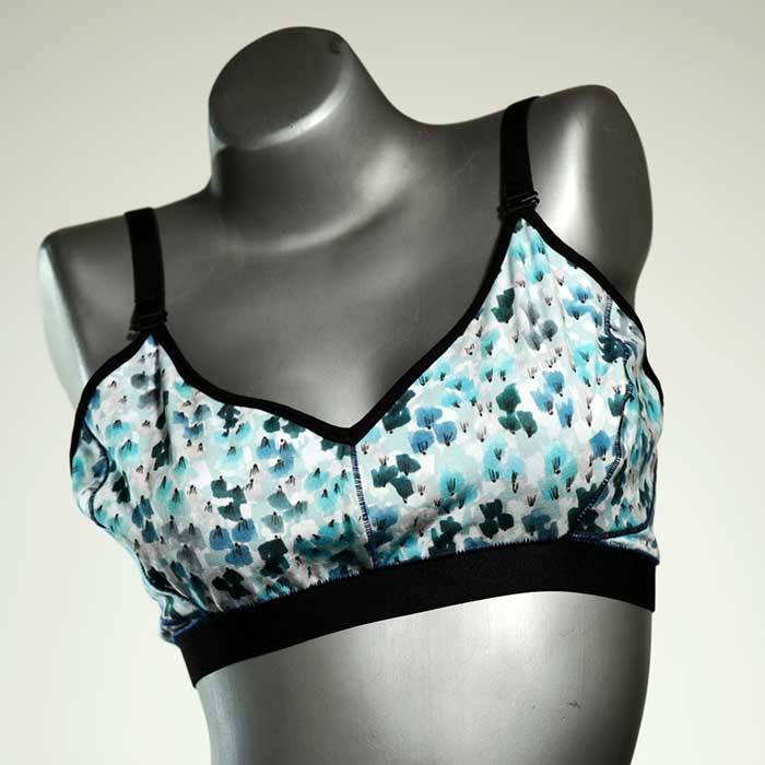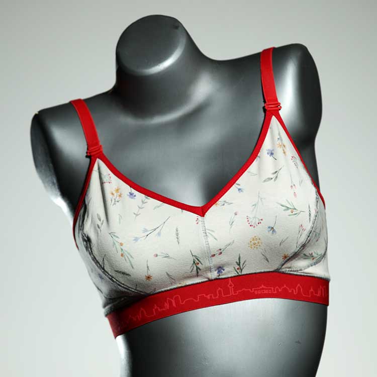 Knuffelzachte bh van ademende biokatoenen jersey met unieke designs. Een echt uniek stuk van lokale productie. Draadloos, zonder kussen of sluiting, ze zijn comfortabel om te dragen. De bandjes zijn 16 mm breed, de cups zijn dubbellaags en aan de binnenkant gemaakt van biologisch katoen. Ook geschikt als voedingsbeha.
