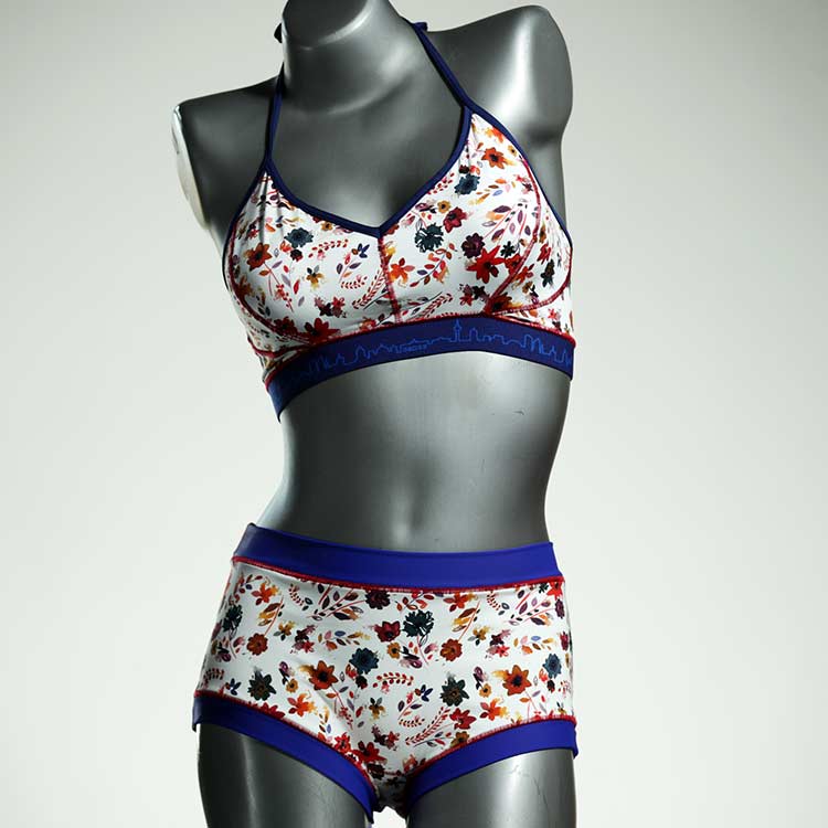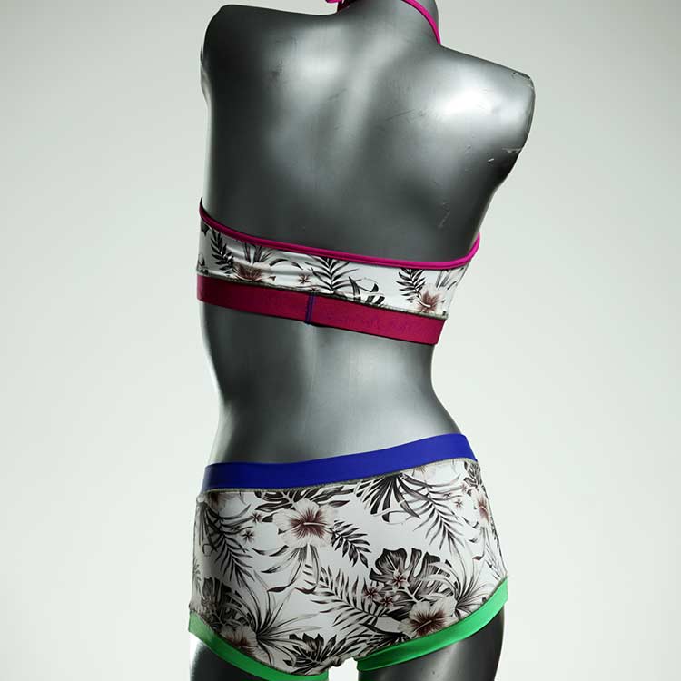 Net als de hotpants en bh's zijn deze sportbikinisets niet te strak gesneden, passen ze net zo goed en glijden ze niet af. Het materiaal is van hoge kwaliteit en lichtecht Lycra van een kleine weverij in de buurt van Barcelona. De banden zijn 16 mm breed en verstelbaar. Top zonder beugel, kussen of sluiting. Gemaakt van hoogwaardig Lycra en zonder elastiek. Met zwemvoering aan de voorkant.